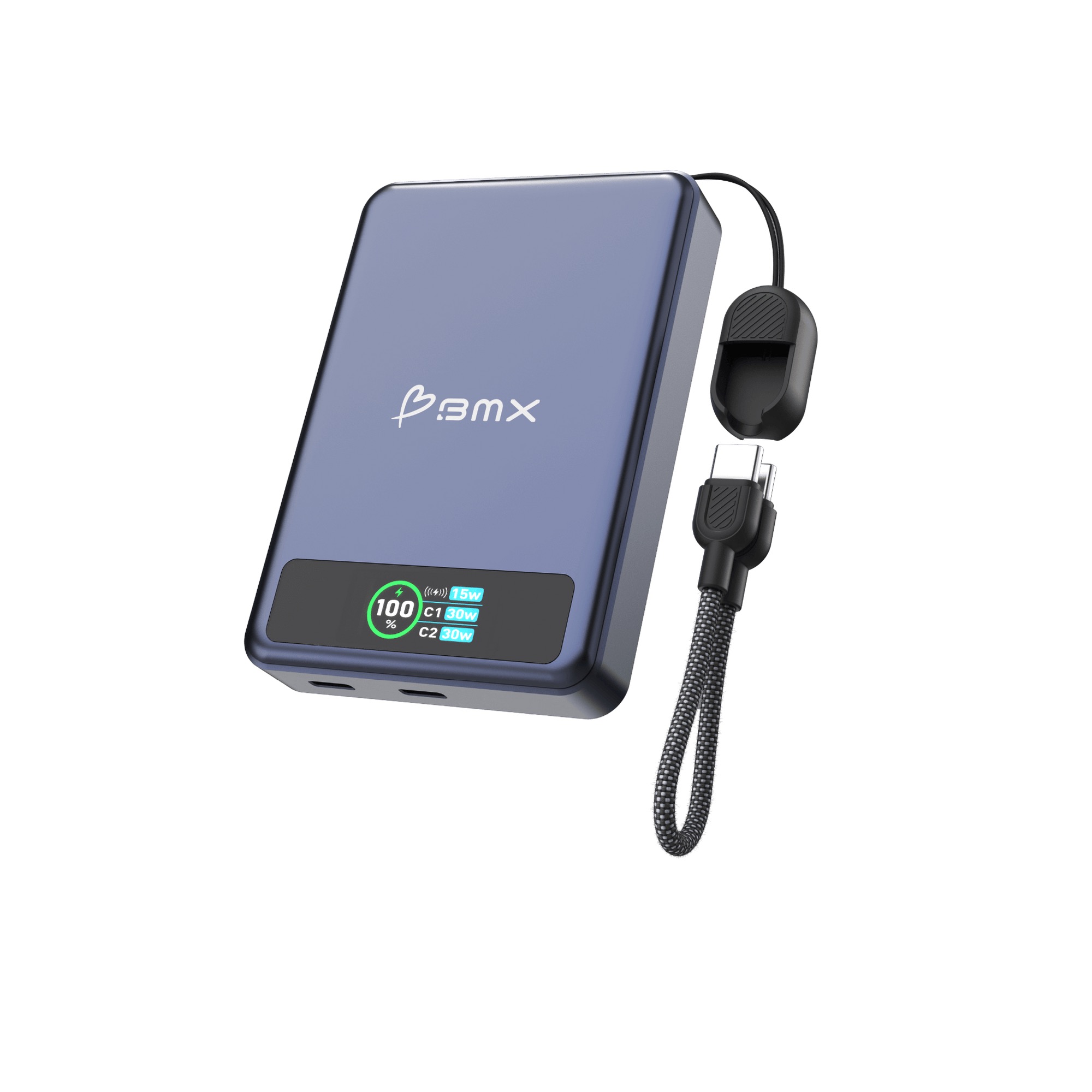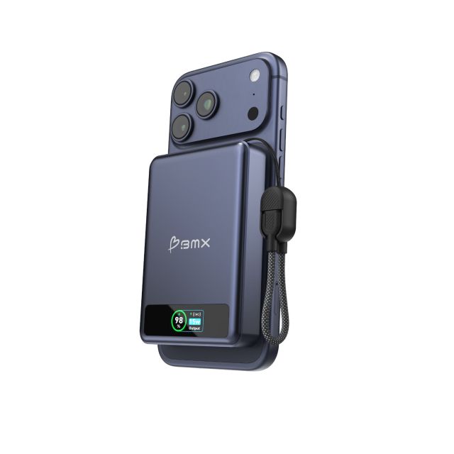 Kompakte 10'000mAh Semi-Solid State MagSafe Power Bank mit 20 Watt Leistung, Full Color LCD Bildschirm, MagSafe sowie Qi2 Wireless Charging Funktion inkl. USB-C Kabel als Anhänger - Blue