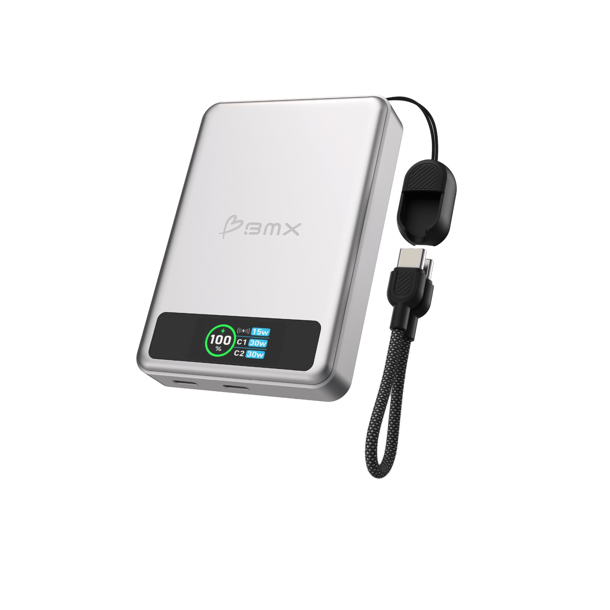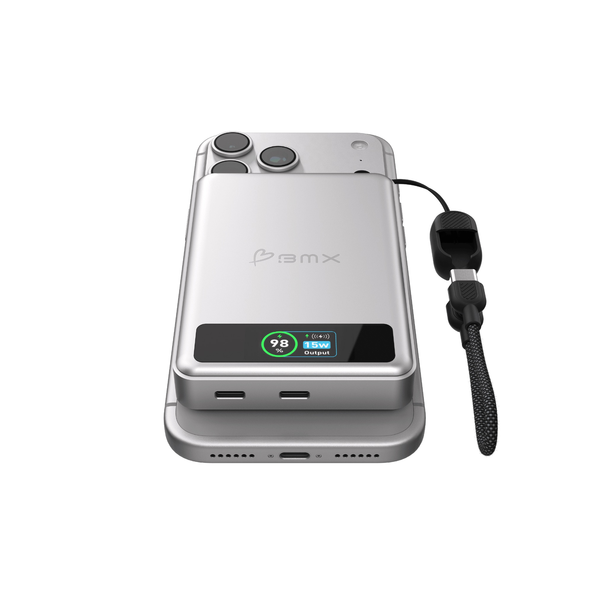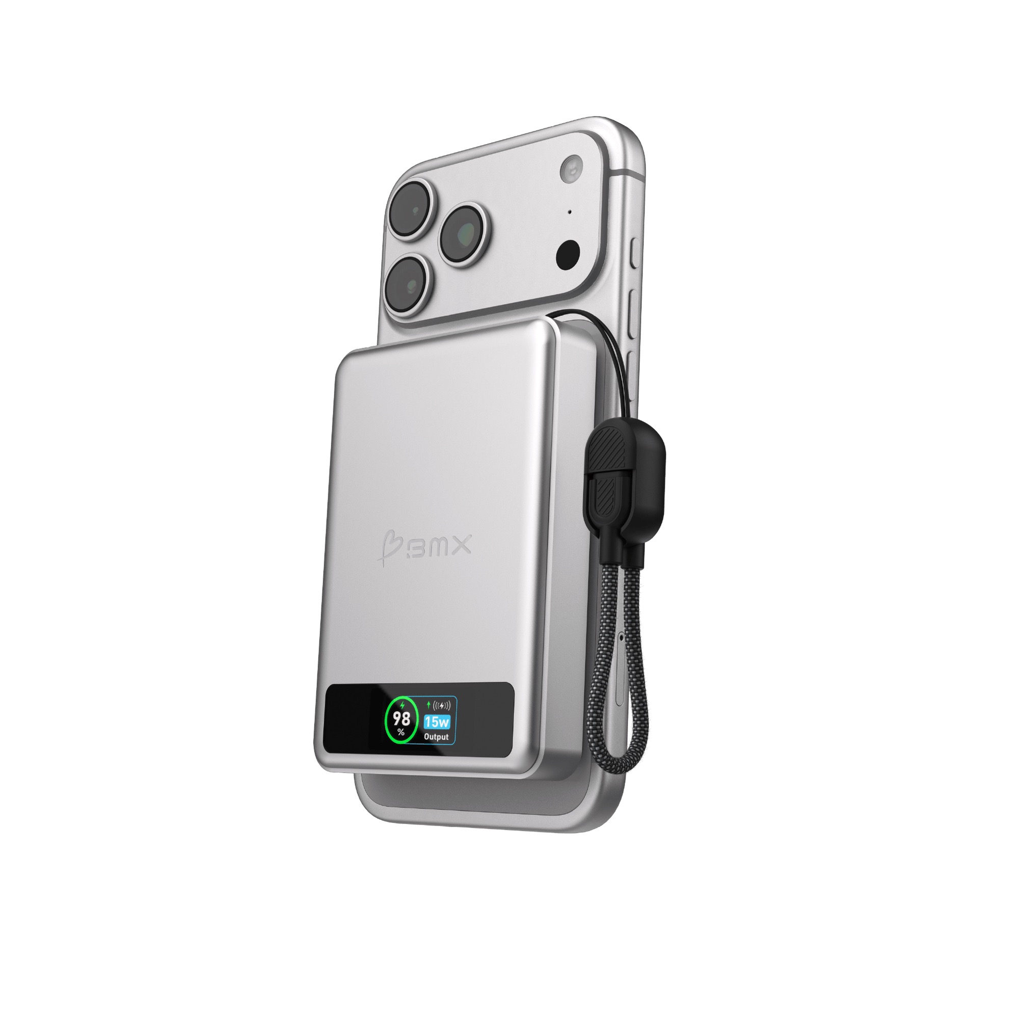 Kompakte 10'000mAh Semi-Solid State MagSafe Power Bank mit 20 Watt Leistung, Full Color LCD Bildschirm, MagSafe sowie Qi2 Wireless Charging Funktion inkl. USB-C Kabel als Anhänger - Silver