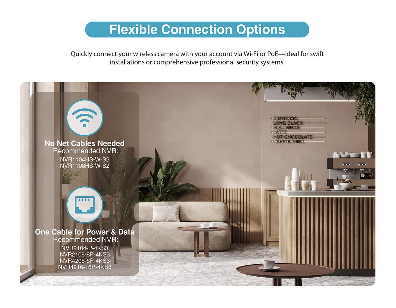 Verbinden Sie Ihre drahtlose Kamera schnell über WiFi oder PoE mit Ihrem Konto - ideal für schnelle Hausinstallationen oder umfassende professionelle Sicherheitssysteme.