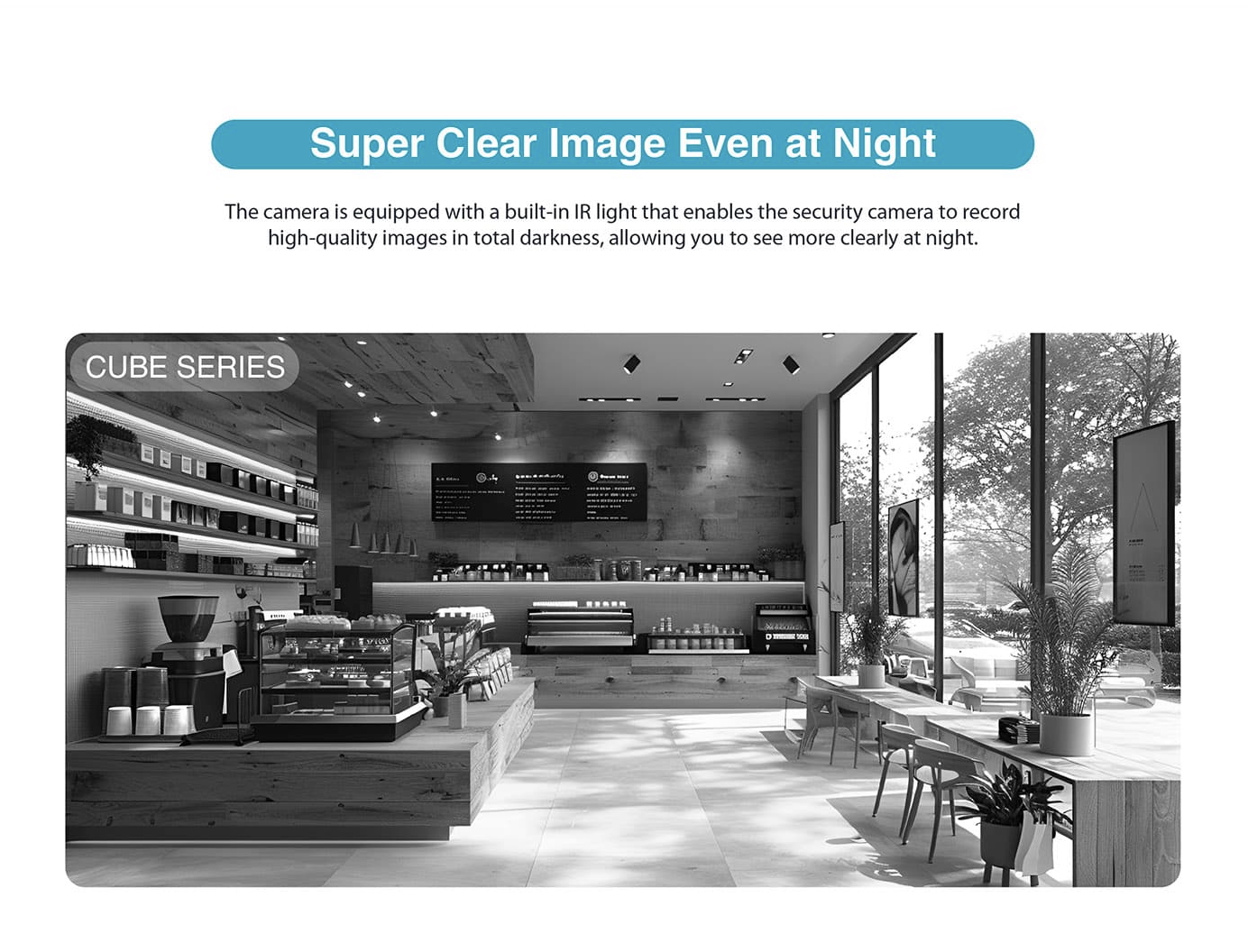 Die Kamera ist mit einem eingebauten IR-Licht ausgestattet, das es der Sicherheitskamera ermöglicht, auch bei völliger Dunkelheit qualitativ hochwertige Bilder aufzuzeichnen, so dass Sie nachts besser sehen können.
