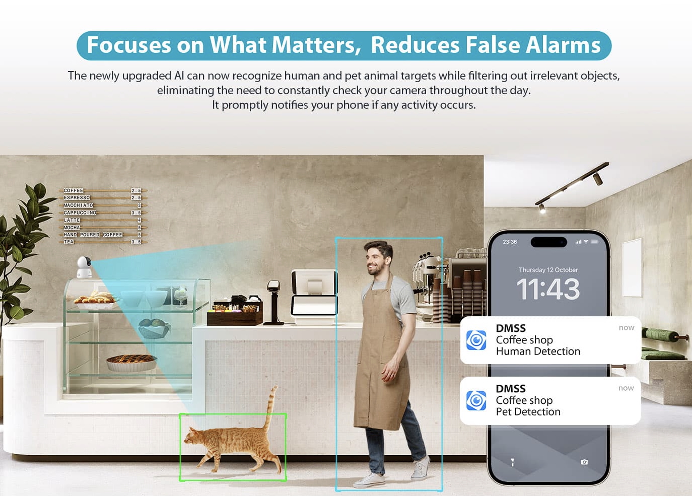 Die neue verbesserte KI kann nun menschliche und tierische Ziele erkennen und gleichzeitig irrelevante Objekte herausfiltern, sodass Sie Ihre Kamera nicht mehr ständig überprüfen müssen. Sie benachrichtigt Ihr Telefon sofort, wenn eine Aktivität auftritt.