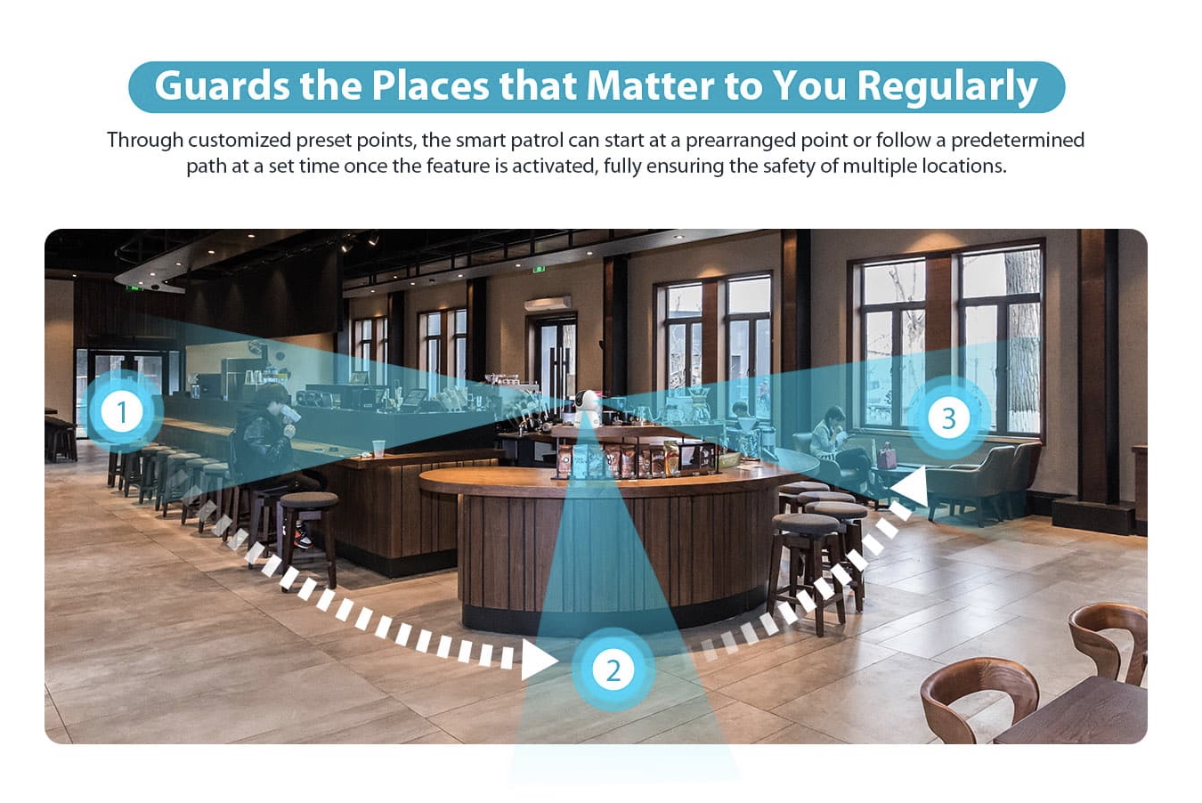 Durch benutzerdefinierte voreingestellte Punkte kann die intelligente Patrouille an einem vorher festgelegten Punkt starten oder einem vorbestimmten Weg zu einer bestimmten Zeit folgen, sobald die Funktion aktiviert ist, und so die Sicherheit an mehreren Orten vollständig gewährleisten.