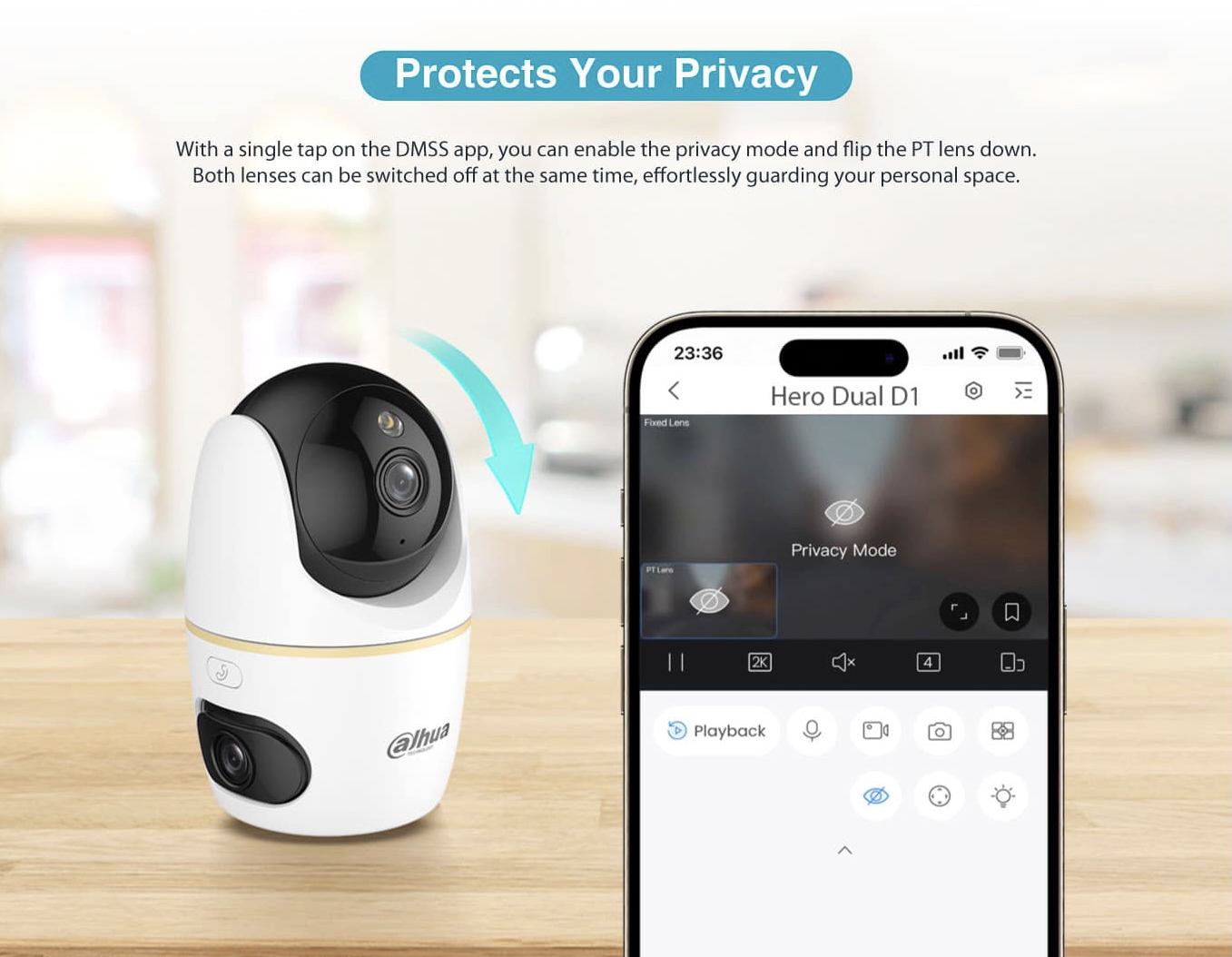 Mit einem einzigen Tippen auf die DMSS-App können Sie den Datenschutzmodus aktivieren und die PT-Linse nach unten klappen. Beide Linsen können gleichzeitig ausgeschaltet werden, sodass Ihr persönlicher Bereich mühelos geschützt wird.