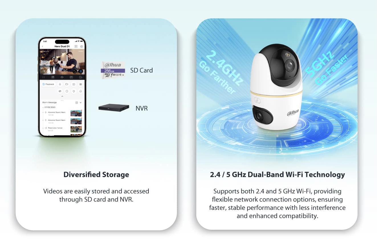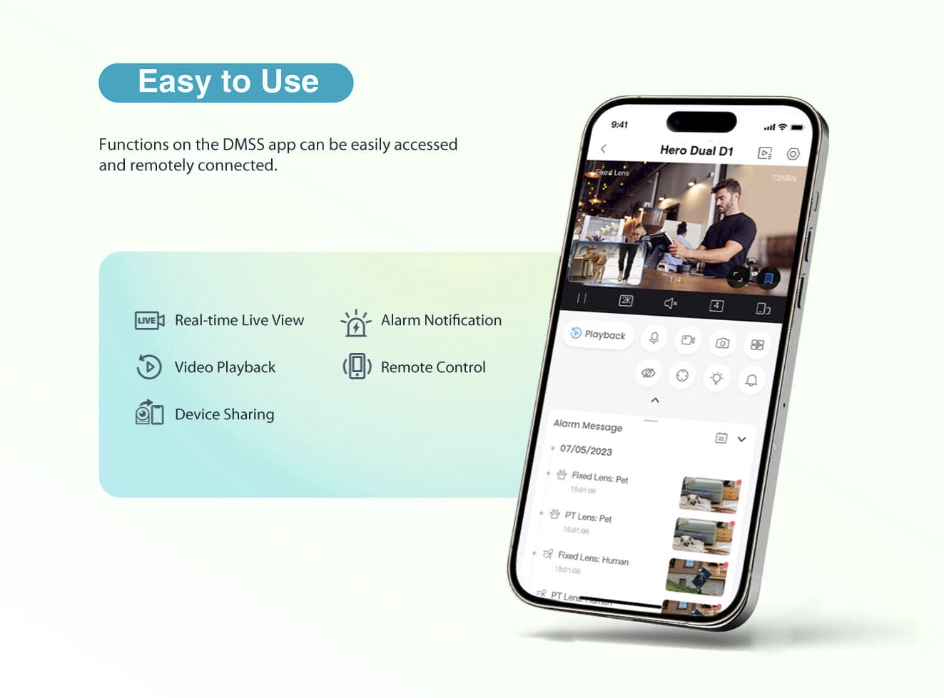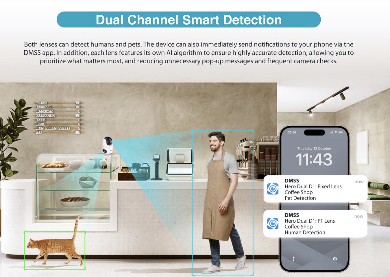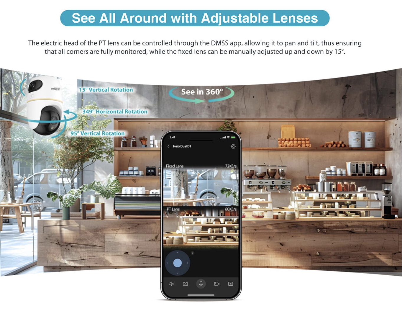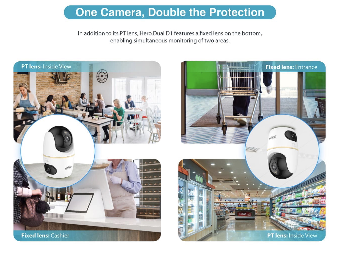 Die Hero Dual Series, Teil der Dahua Wireless-Serie, verfügt sowohl über feste als auch über PT-Objektive und ermöglicht die gleichzeitige Live-Überwachung von zwei Bereichen mit nur einer Kamera für eine Multi-Winkel-Abdeckung. Beide Objektive bieten eine KI-Erkennung für Menschen und Haustiere, die das Auftreten von Fehlalarmen deutlich reduziert. Insbesondere das PT-Objektiv kann bewegliche Ziele erkennen und automatisch verfolgen. Wenn die Kamera einen Eindringling erkennt, löst sie Ton- und Lichtwarnungen aus und sendet Benachrichtigungen an den mobilen Client, so dass Sie unabhängig von Ihrem Standort immer auf dem Laufenden sind. Diese Kameras werden in der Regel in kleinen Bereichen wie Geschäften und Restaurants eingesetzt.Alles klar sehen