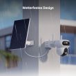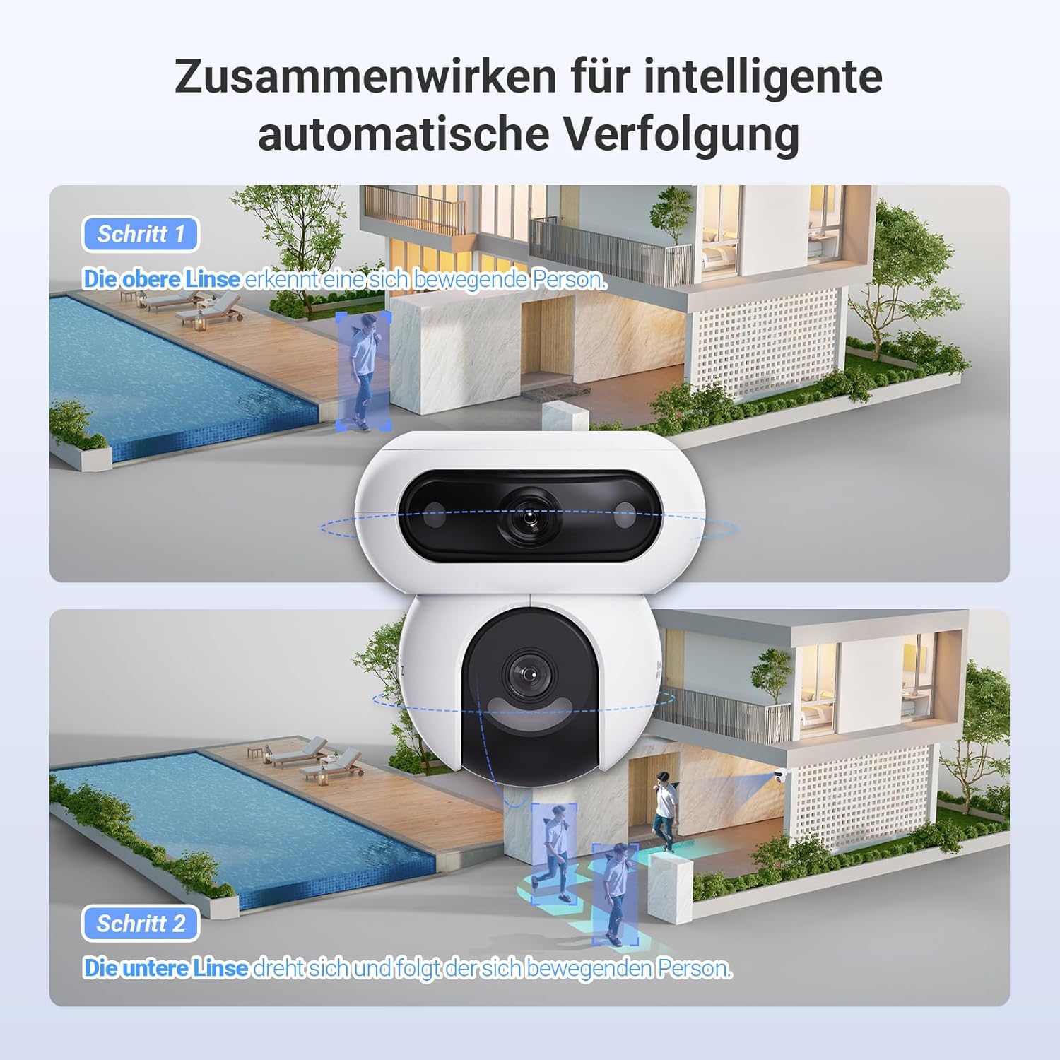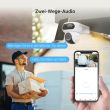 Dual-Linsen Batterie-Kamera 2K+ mit doppelter Rotation, 324° schwenk- & 90° neigbar, staub- & wetterfest, intelligente Alarme, Nachtsicht (in Farbe), Bewegungssensor mit KI-basierter Personenerkennung & integrierter Sirene und Stroboskoplicht (unterstützt Micro-SD bis zu 512GB), AOV-Unterstützung (24/7 Aufnahmen) und Solarpanel - Weiss