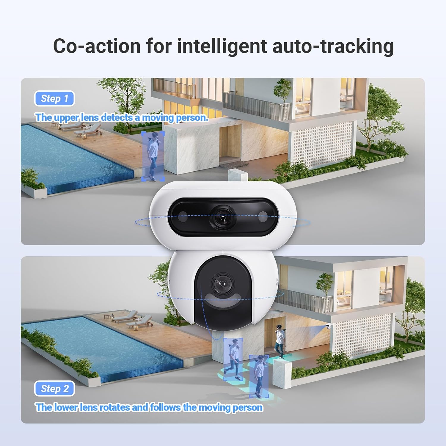 Ausgestattet mit der Dual-Objektiv-Technologie von EZVIZ nutzt die HB90x Dual 4G drei Motoren, um sicherzustellen, dass beide Kameras sich reibungslos drehen können, um tote Winkel so weit wie möglich zu reduzieren.