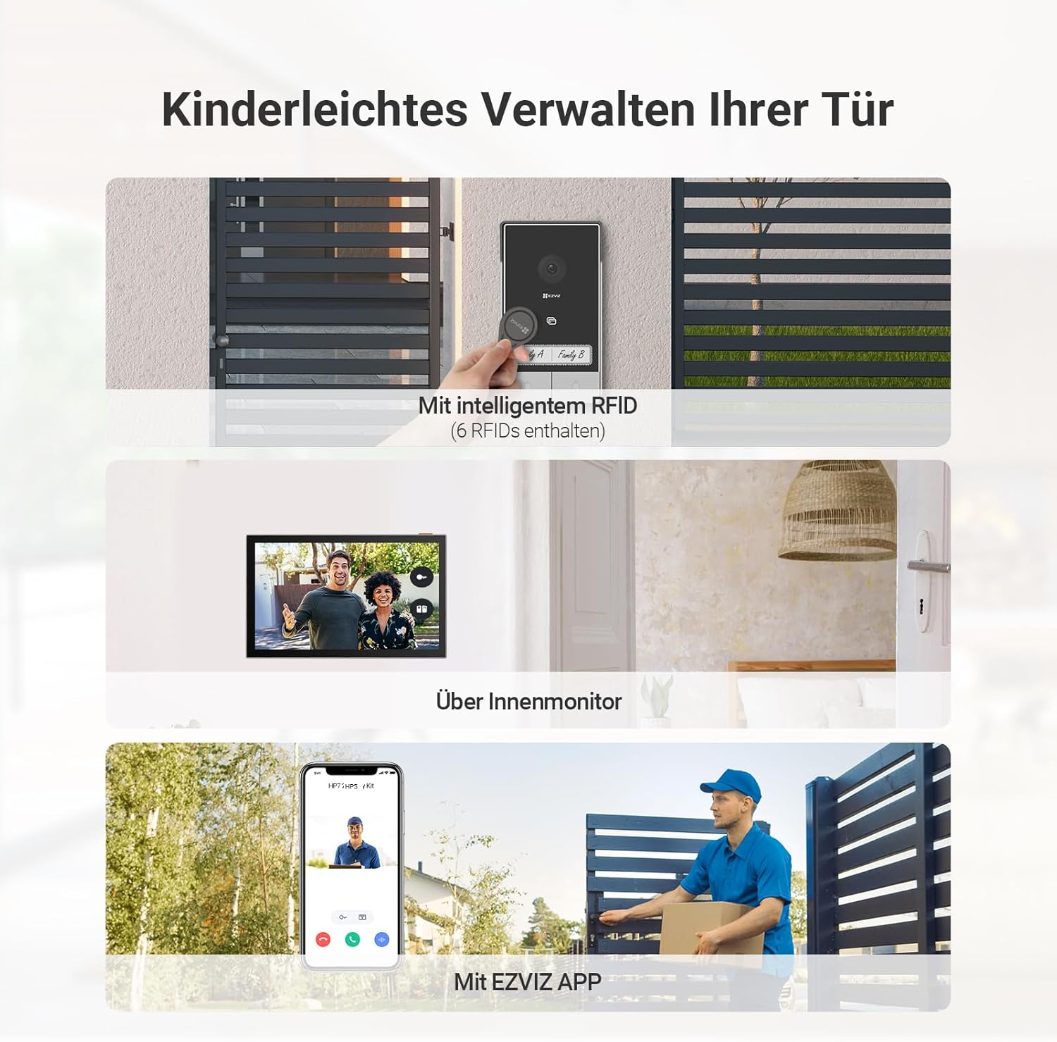 EZVIZ EP7 Smart Home Video-Türsprechanlage - Smarte Video-Türsprechanlage im wetterfesten Design und eingebauter Türklingel mit 2K Auflösung, 7 Zoll Touch-Screen inkl. Solar Panel - Schwarz-Silber