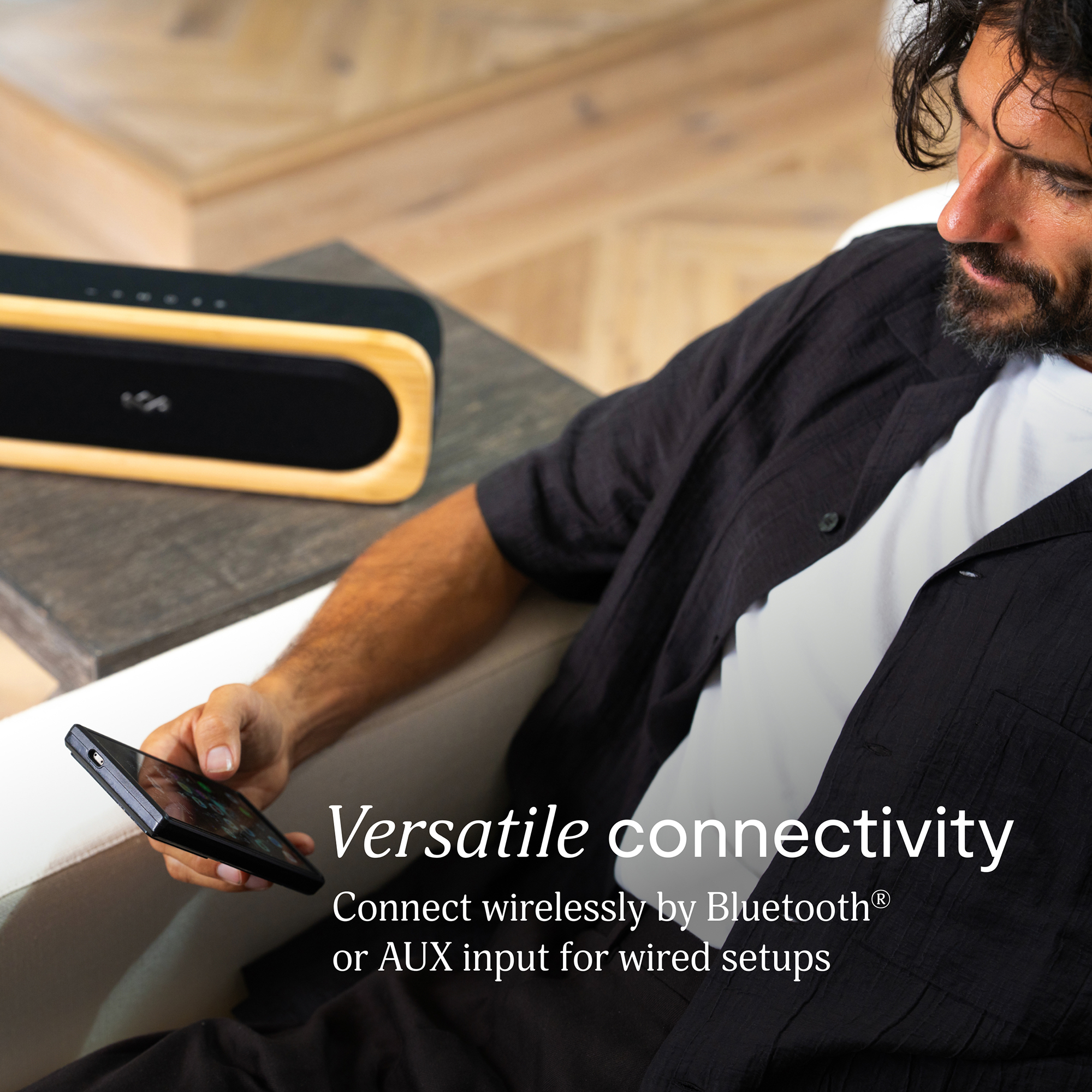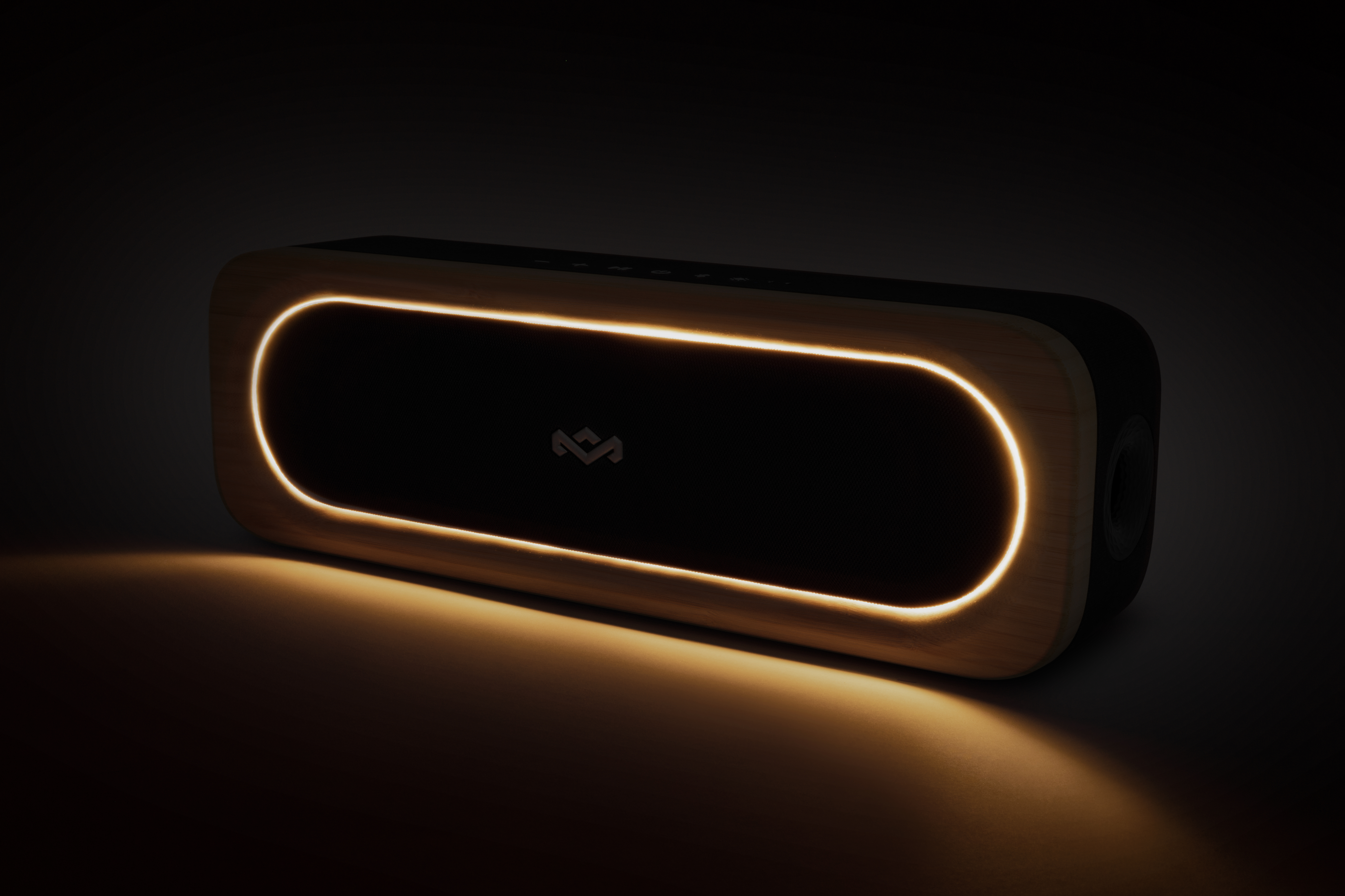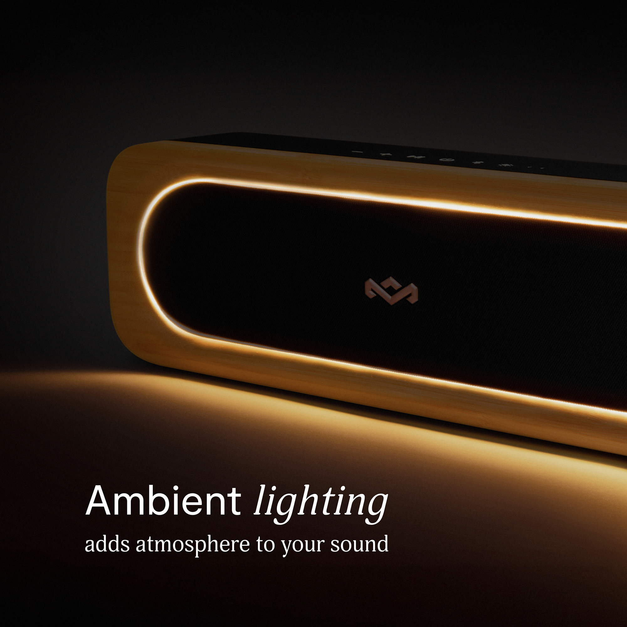 Wasserdichtes portables Bluetooth Stereo Audio-System mit kristallklarem Sound, Vorderseite aus Bambusholz, 20 Stunden Akkulaufzeit & Ambientebeleuchtung - Signature Black