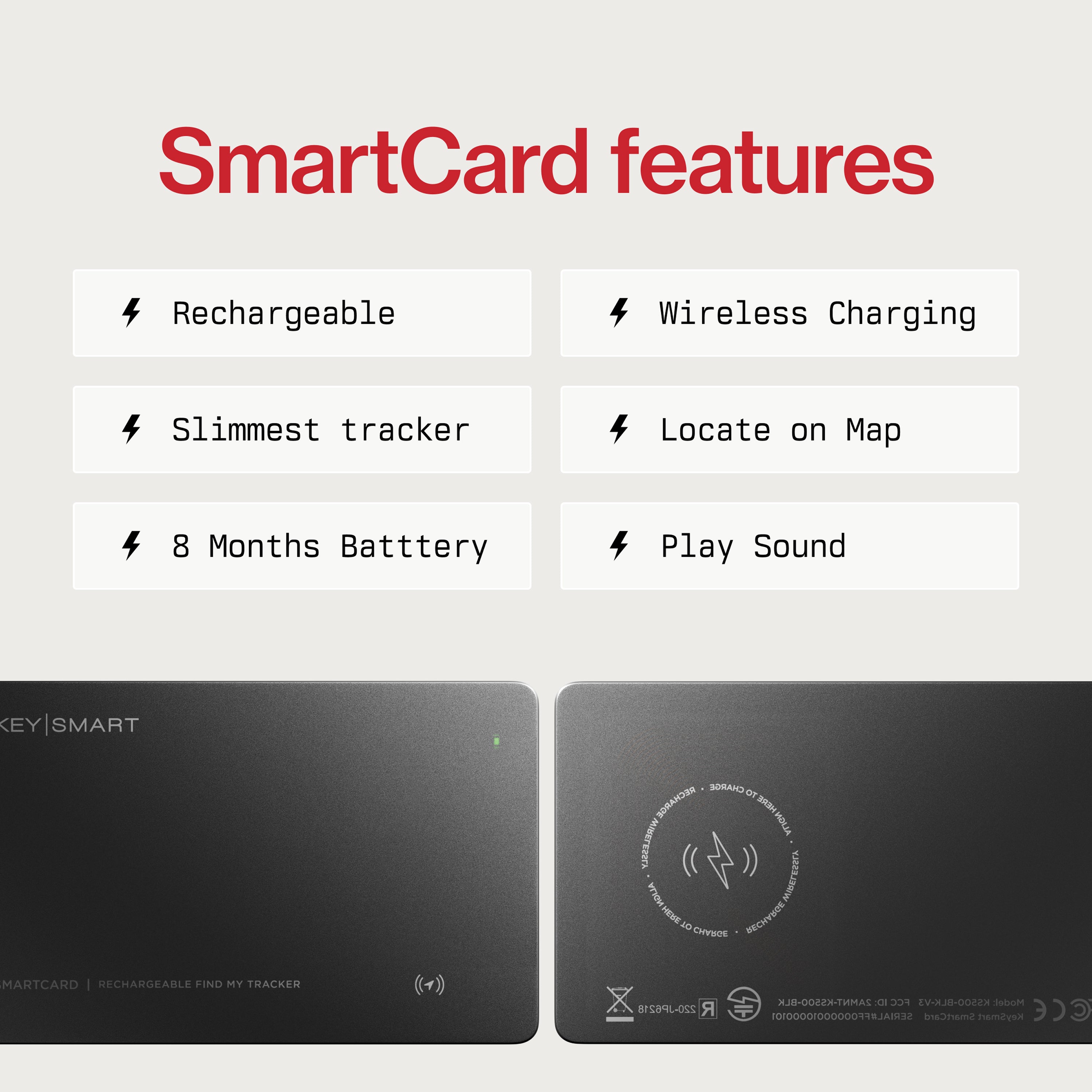 Die KeySmart Card hält mit einer einzigen Ladung bis zu 8 Monaten, so dass Sie sich nicht jede Woche um das Aufladen kümmern müssen.