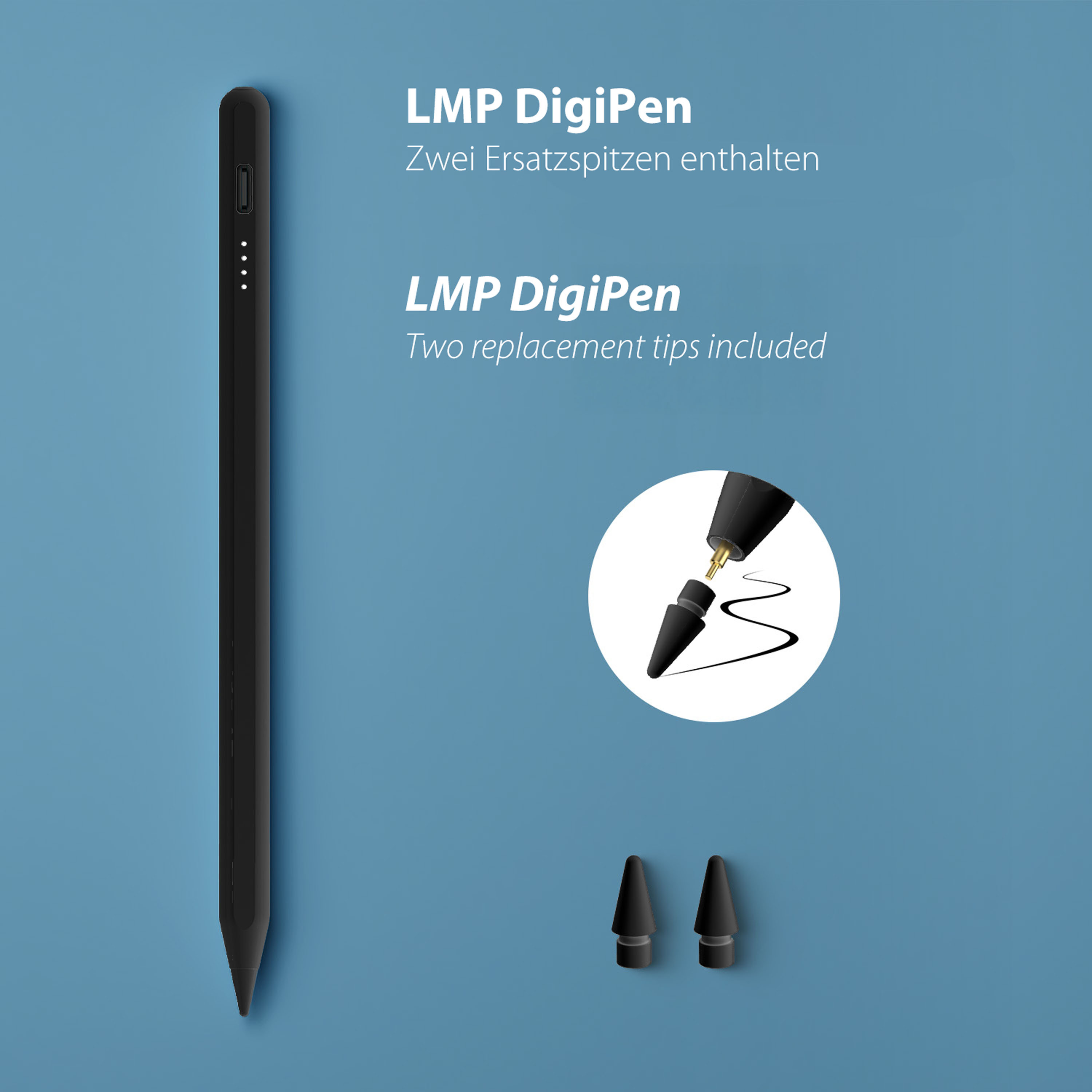 Der LMP DigiPen ist ein kostengünstiger digitaler Stift ideal für Projekte an Schulen, wo zunehmend ein Stift zum Schreiben und Bedienen des iPad eingesetzt wird. Der LMP DigiPen bietet ein flüssiges Schreibgefühl, das sich wie echt anfühlt. Durch Palm-Rejection-Technologie kann die Hand bequem auf dem Bildschirm aufliegen, ohne Spuren zu hinterlassen. Die langlebige, präzise Spitze mit Neigungsempfindlichkeit bietet pixelgenaue Linien, deren Dicke durch die Neigung bestimmt werden. Durch die magnetische Befestigung kann der LMP DigiPen am iPad angebracht werden (kompatibel mit iPad Pro 11"/12.9" 2018-2022, iPad Air 4./5. Gen und iPad mini 6. Gen, unterstützt aber kein kabelloses Laden). Mit einer Aufladung kann 13 Stunden lang geschrieben und gezeichnet werden. Der Energiesparmodus wird nach 5 Min. Inaktivität aktiviert, um die Akkulaufzeit zu maximieren. Einfache Bedienung mit 2x antippen am Ende des Stiftes für das Ein-/Ausschalten. Abgeflachter Teil des Stiftes verhindert das Rollen auf dem Tisch.