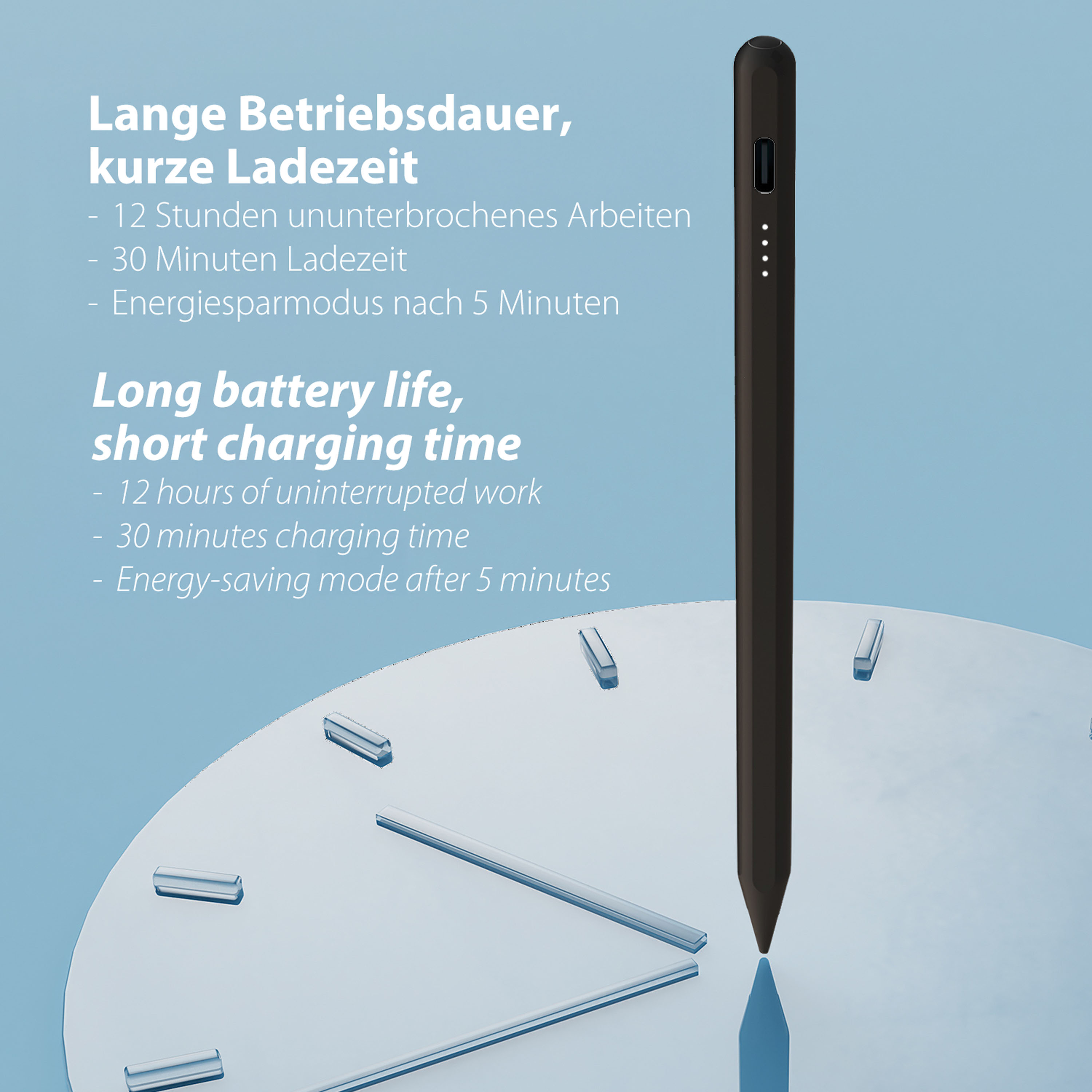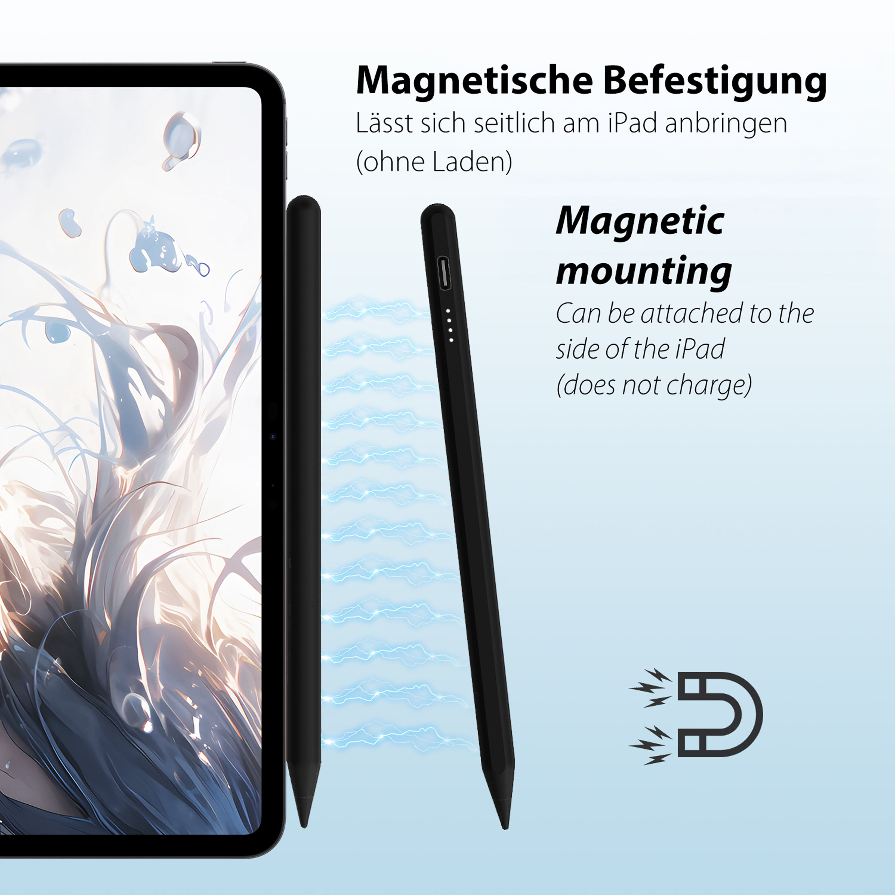 Digitaler Stift fürs iPad oder Tablet mit USB-C Ladeport, Touch Ein-/Aus Funktion & nativer Handerkennung sowie magnetischer Befestigung am iPad inkl. 2 x Ersatzspitzen - Schwarz