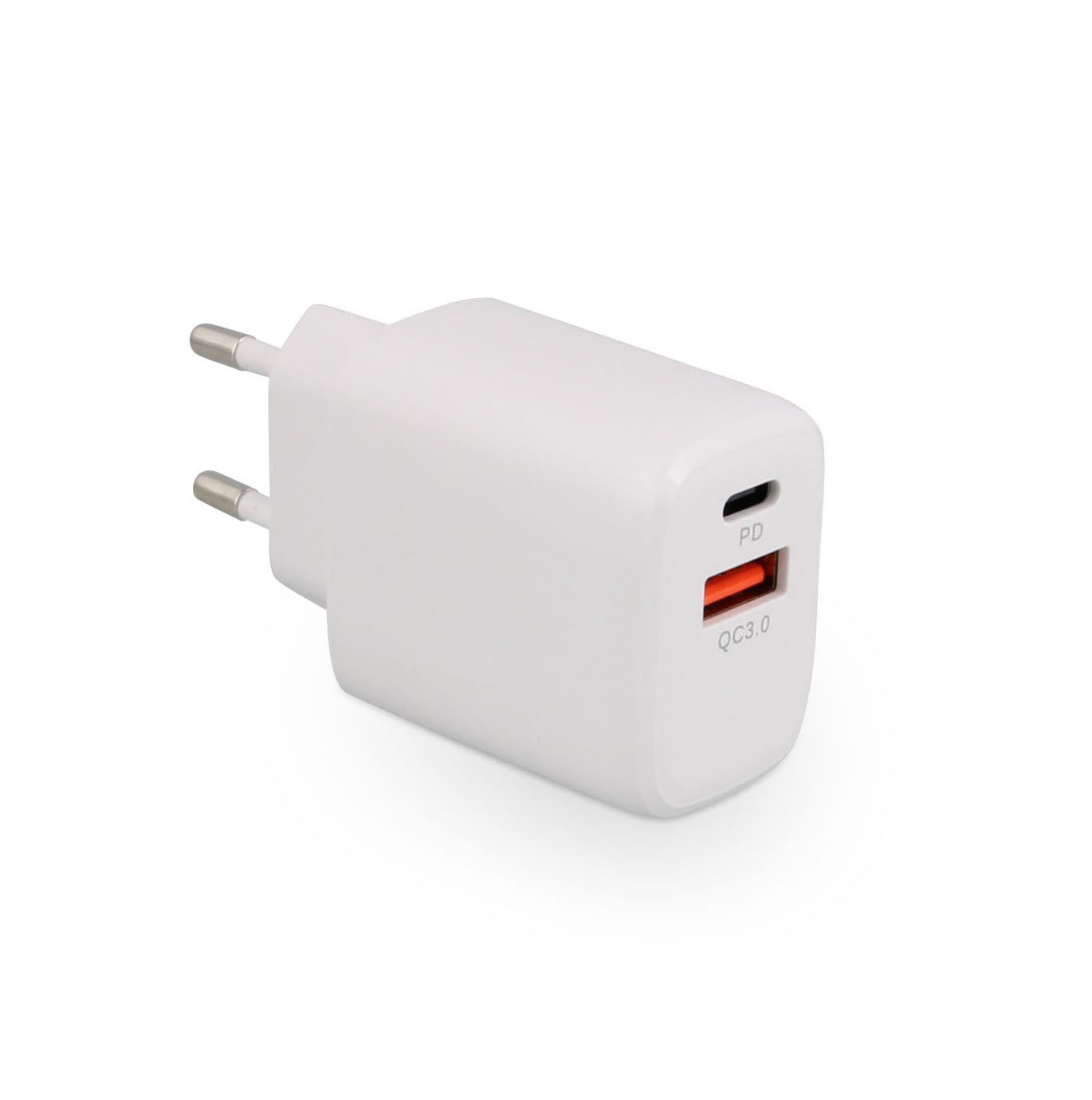 Handlicher Stromadapter für unterwegs mit einem USB-A- und einem USB-C-Ausgang. Laden Sie Ihr Smartphone und/oder Tablet mit maximal 20 Watt, angepasst an die Standards USB, QuickCharge 3.0 (QC 3.0) und Power Delivery (PD). Die umfangreichen Schutzmechanismen verhindern Überspannung sowie Überhitzung und Kurzschlüsse. Die entsprechenden Ladekabel sind nicht im Lieferumfang enthalten.HIGHLIGHTS: