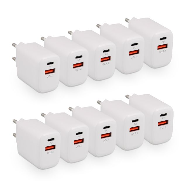 Kompakter mobiler Wall Charger mit 1 x USB-C Port (20W) und 1 x USB-A 3.0 Port (18W), ideal für Smartphones & Tablets, 10er Pack - Weiss