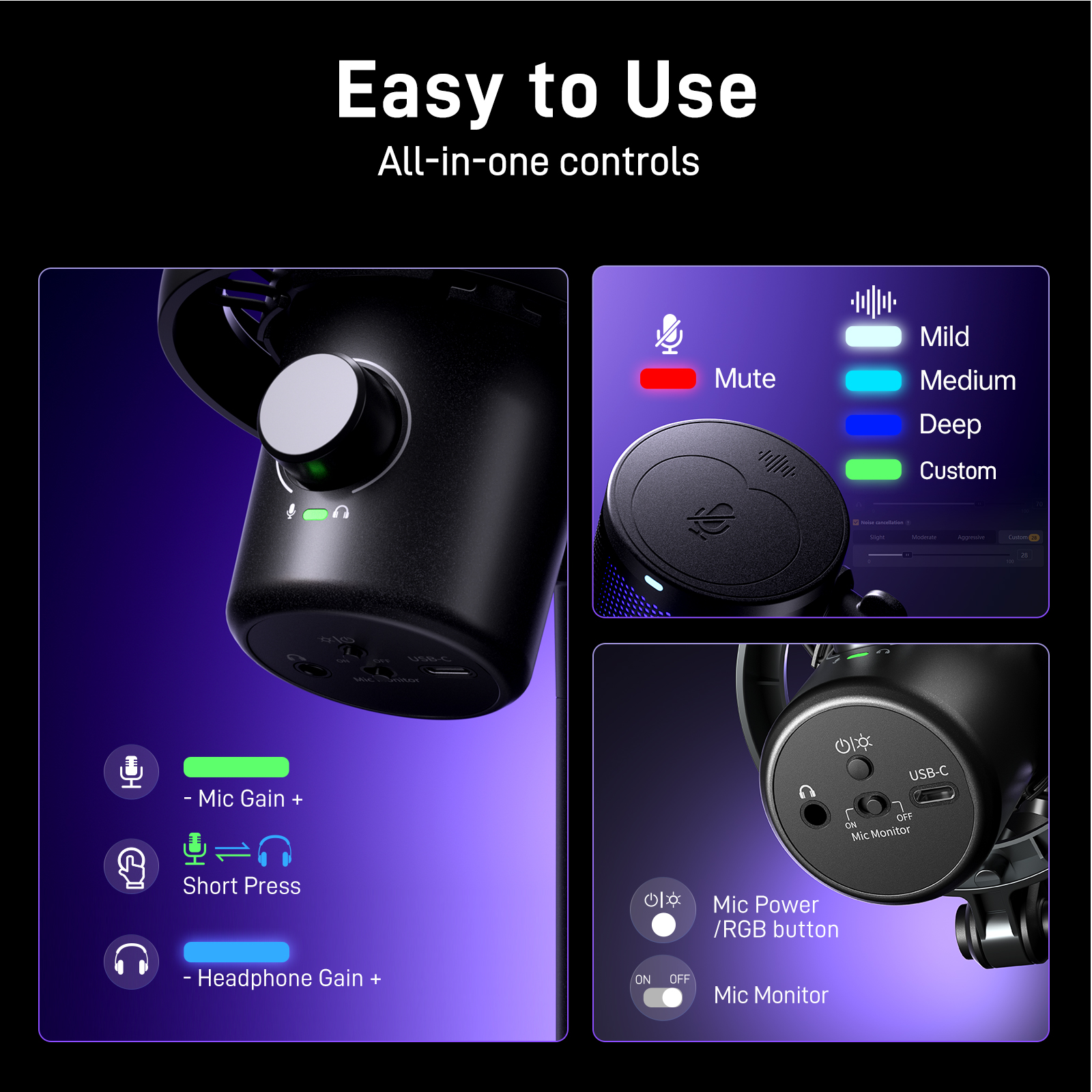 Mit Funktionen wie Ein-Tasten-Stummschaltung, Gain-Regelung und latenzfreiem Monitoring behalten Sie jederzeit die volle Kontrolle über Ihren Sound – einfach, präzise und professionell.