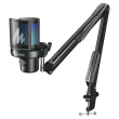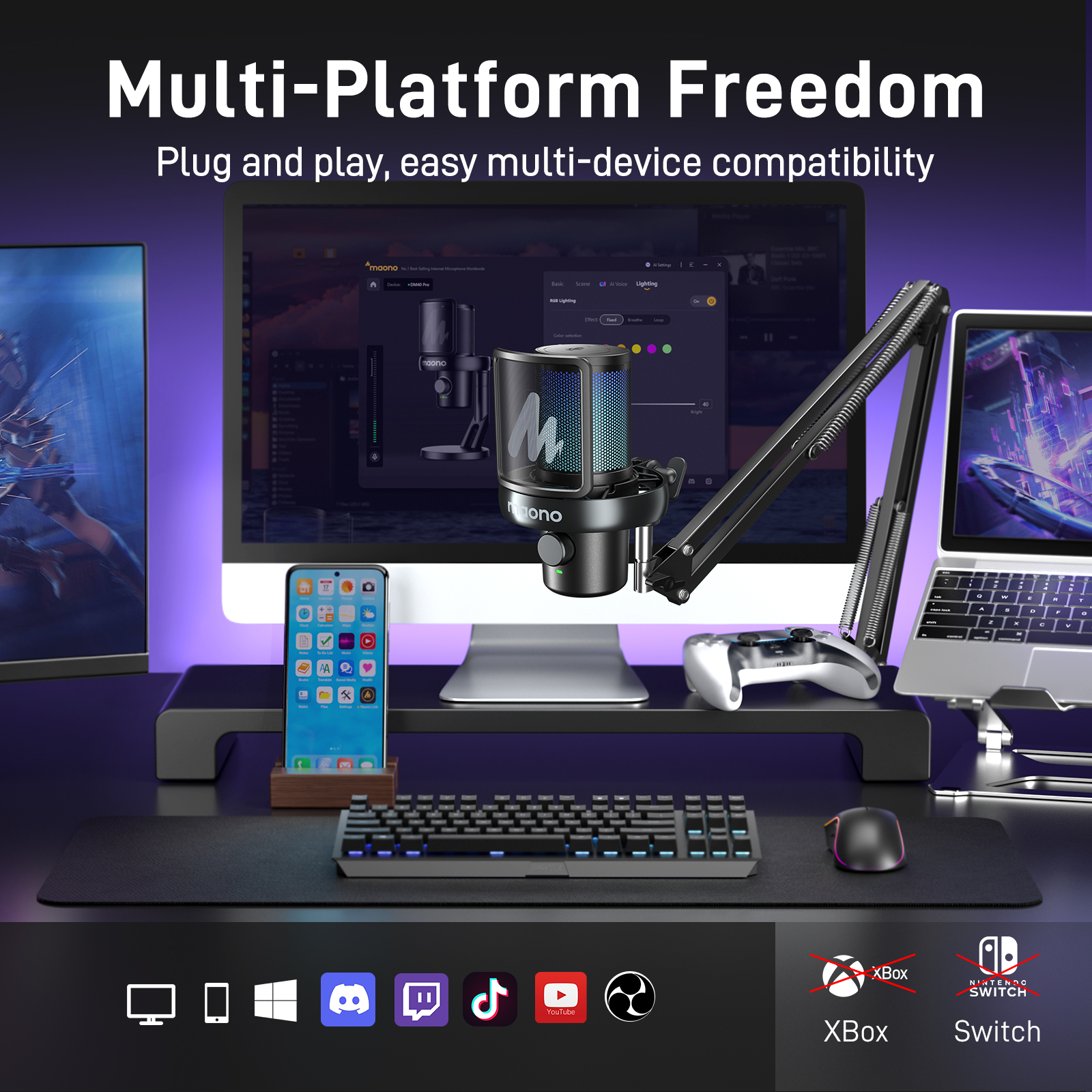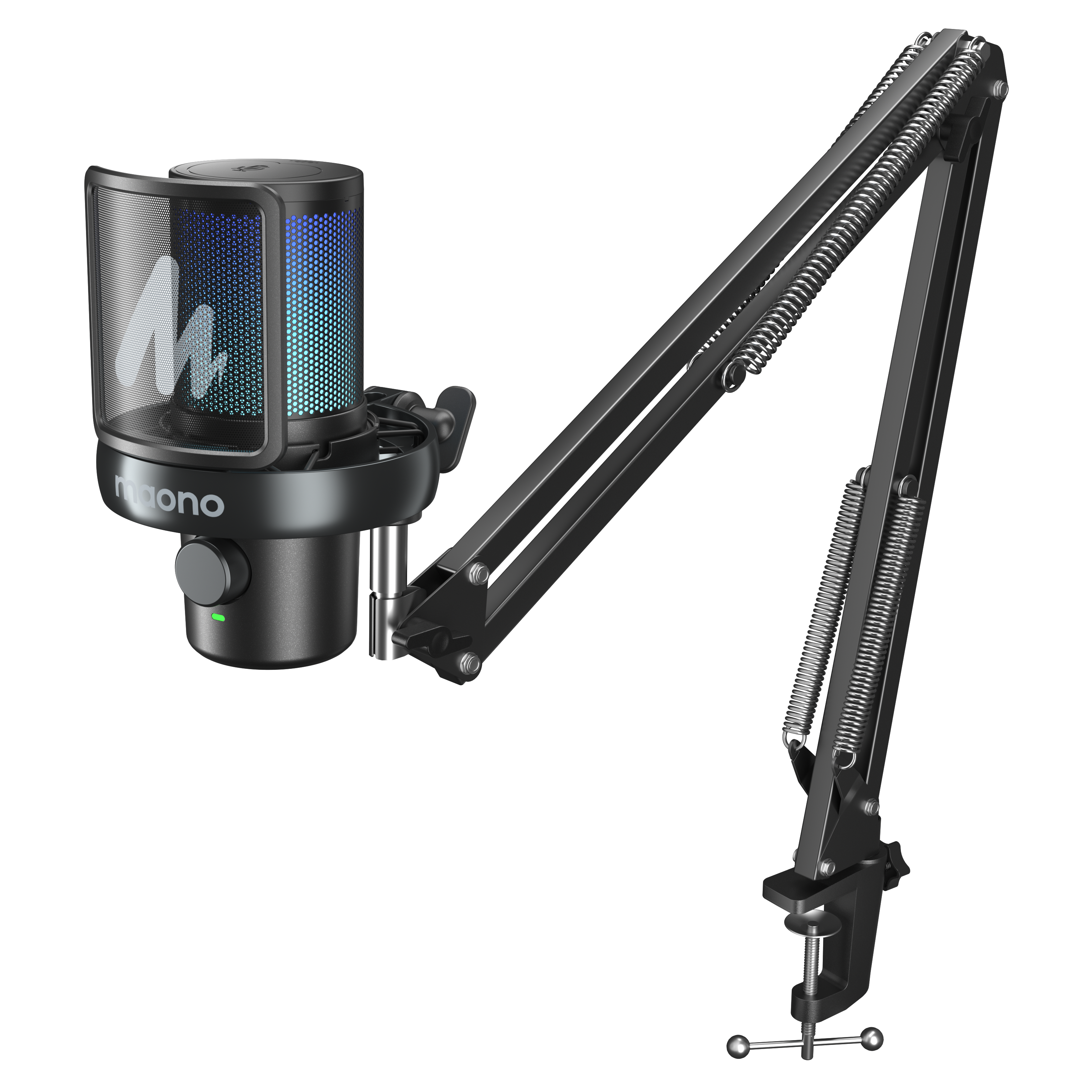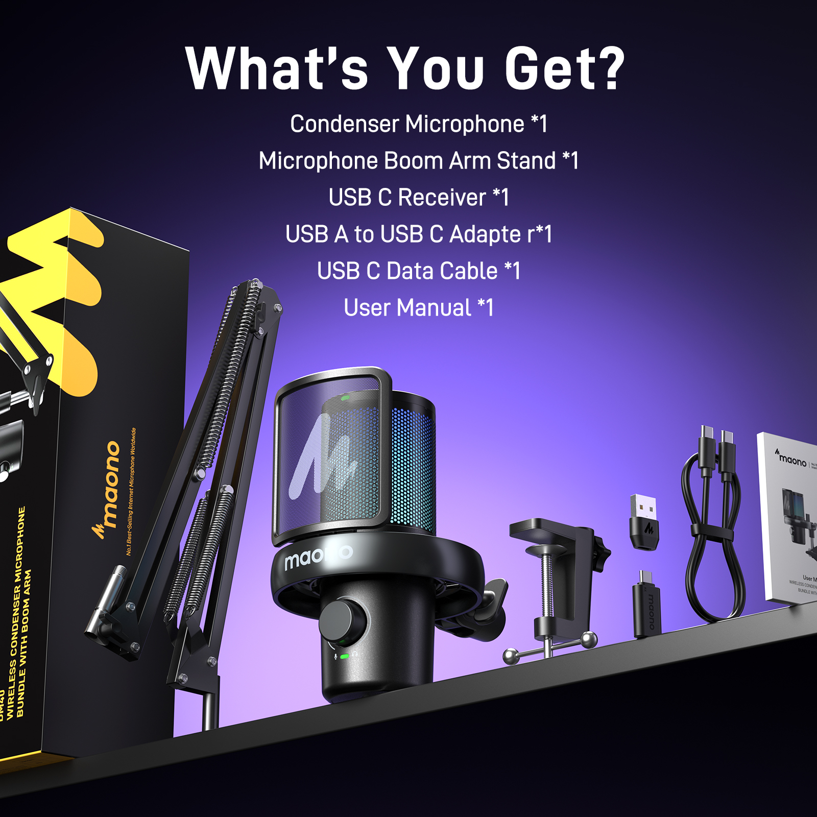 Kabelloses Plug & Play RGB Mikrofon mit bis zu 75 Stunden Akkulaufzeit, einstellbare Geräuschunterdrückung, Multifunktionaltaste und vielen Einstellungsmöglichkeiten durch die Maono Link Software inkl. Metallarmständer-Set - Schwarz