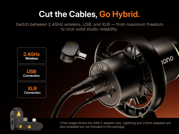 Hybrides dynamisches Mikrofon mit drei Verbindungsmöglichkeiten: 2,4-GHz-Funk, USB oder XLR. Bis zu 60h Akkulaufzeit, 60m Reichweite, dreistufige Geräuschunterdrückung und RGB-Beleuchtung, inkl. Mikrofonarm - Schwarz