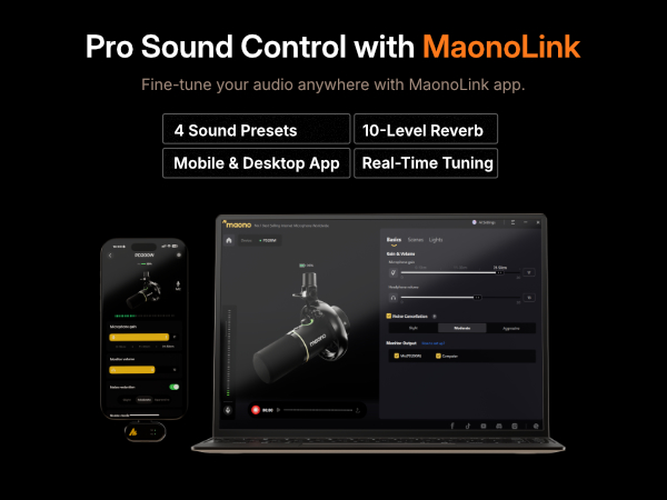Passen Sie Ihren Sound individuell an: Equalizer, Kompressor, Limiter und Halleffekte lassen sich bequem über die kostenlose Maono Link Software einstellen. Kompatibel mit Windows und Mac.