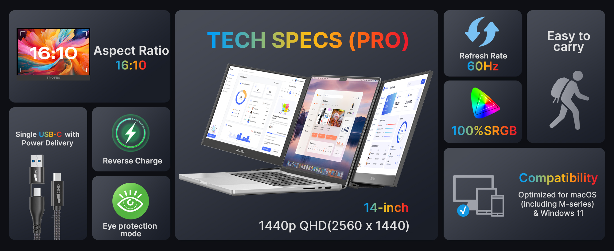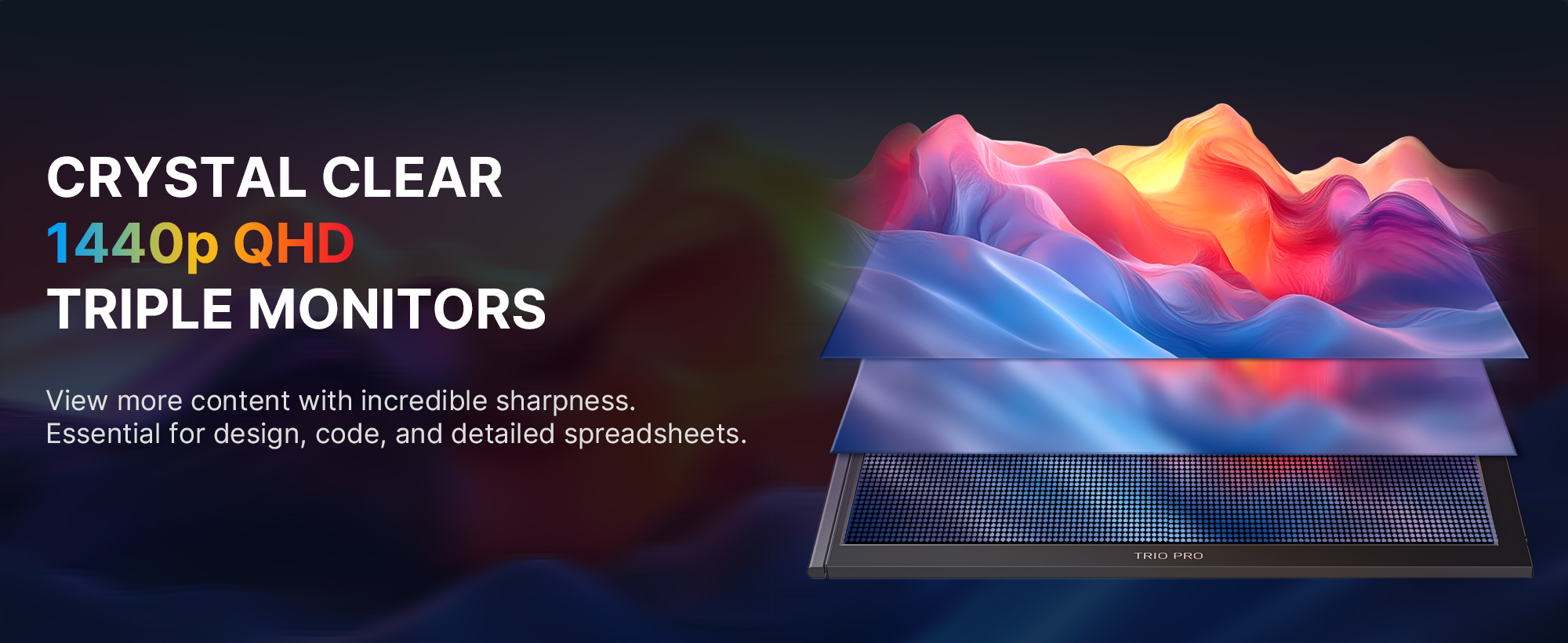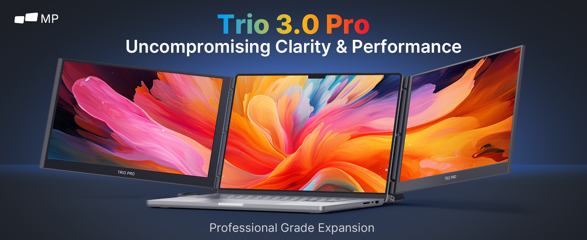 Erweiterte Design- und Portabilität. Dünner und leichter als seine Vorgängermodelle, bietet der TRIO 3.0 Pro ein All-in-One-Design mit einem integrierten Kickstand und optionalen Magneten für flexible Konfigurationen. Ideal für sowohl feste als auch freistehende Setups.Vielseitige Display-Modi. Wählen Sie aus vier Modi: Dual-Screen, Tri-Screen, Präsentation (180° Drehung) und Portrait. Perfekt für Aufgaben wie Programmierung, Content-Erstellung und Präsentationen.