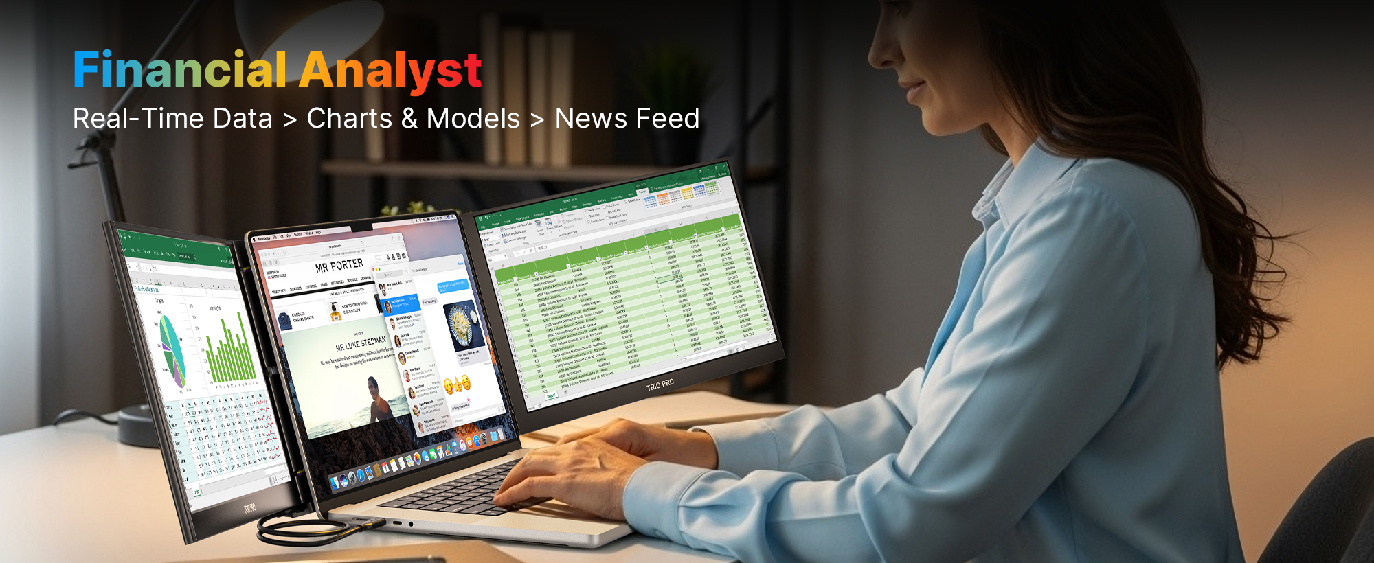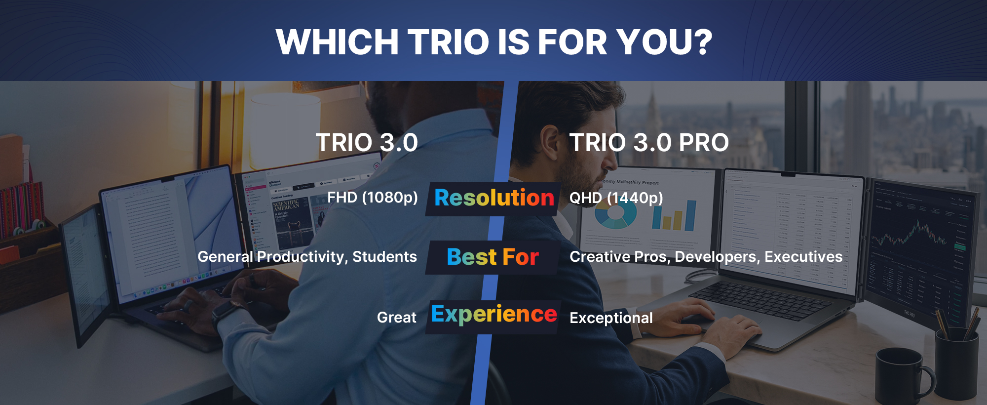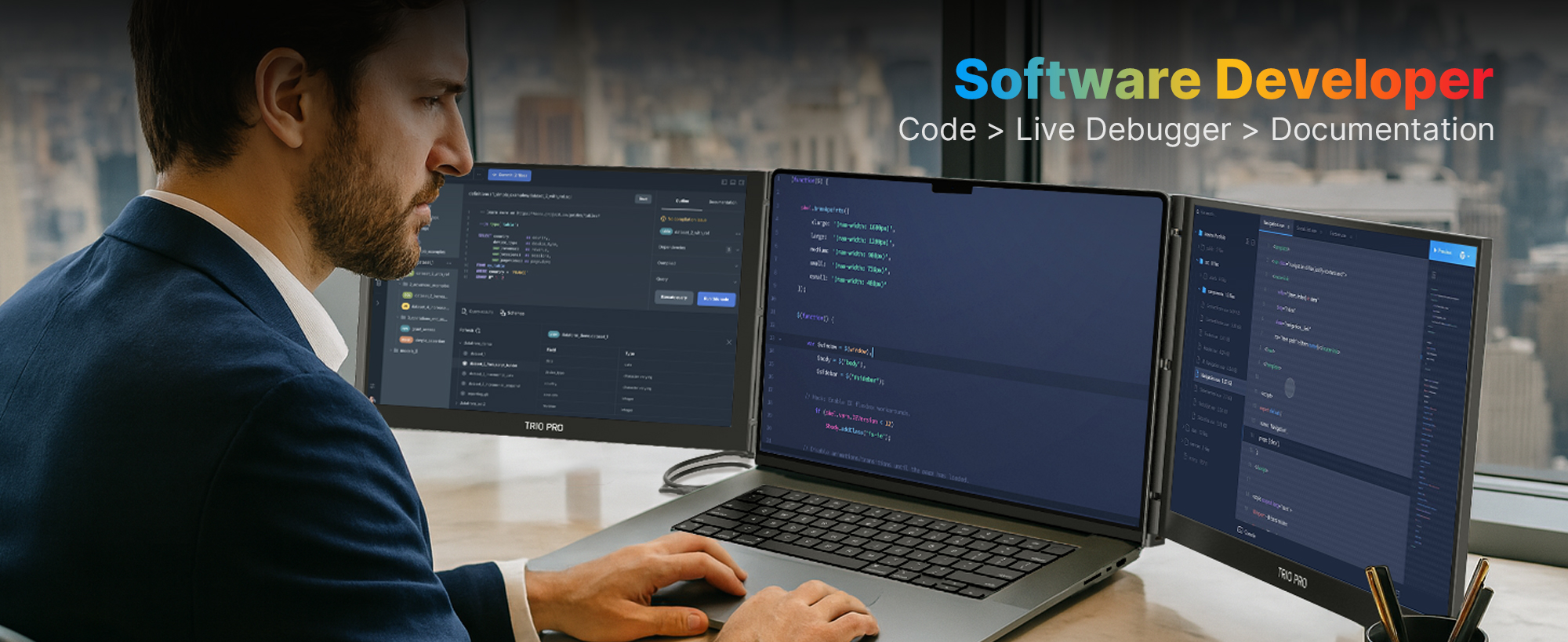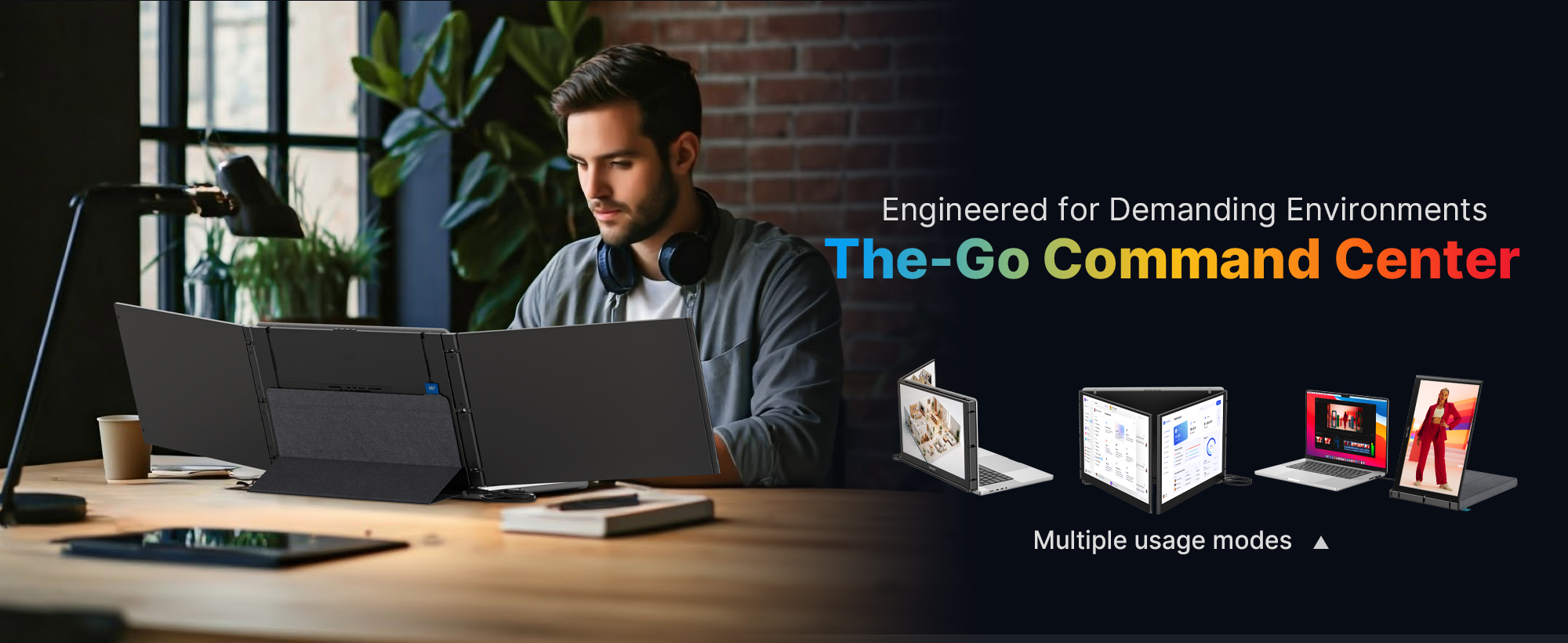 Erweiterte Design- und Portabilität. Dünner und leichter als seine Vorgängermodelle, bietet der TRIO 3.0 Pro ein All-in-One-Design mit einem integrierten Kickstand und optionalen Magneten für flexible Konfigurationen. Ideal für sowohl feste als auch freistehende Setups.Vielseitige Display-Modi. Wählen Sie aus vier Modi: Dual-Screen, Tri-Screen, Präsentation (180° Drehung) und Portrait. Perfekt für Aufgaben wie Programmierung, Content-Erstellung und Präsentationen.