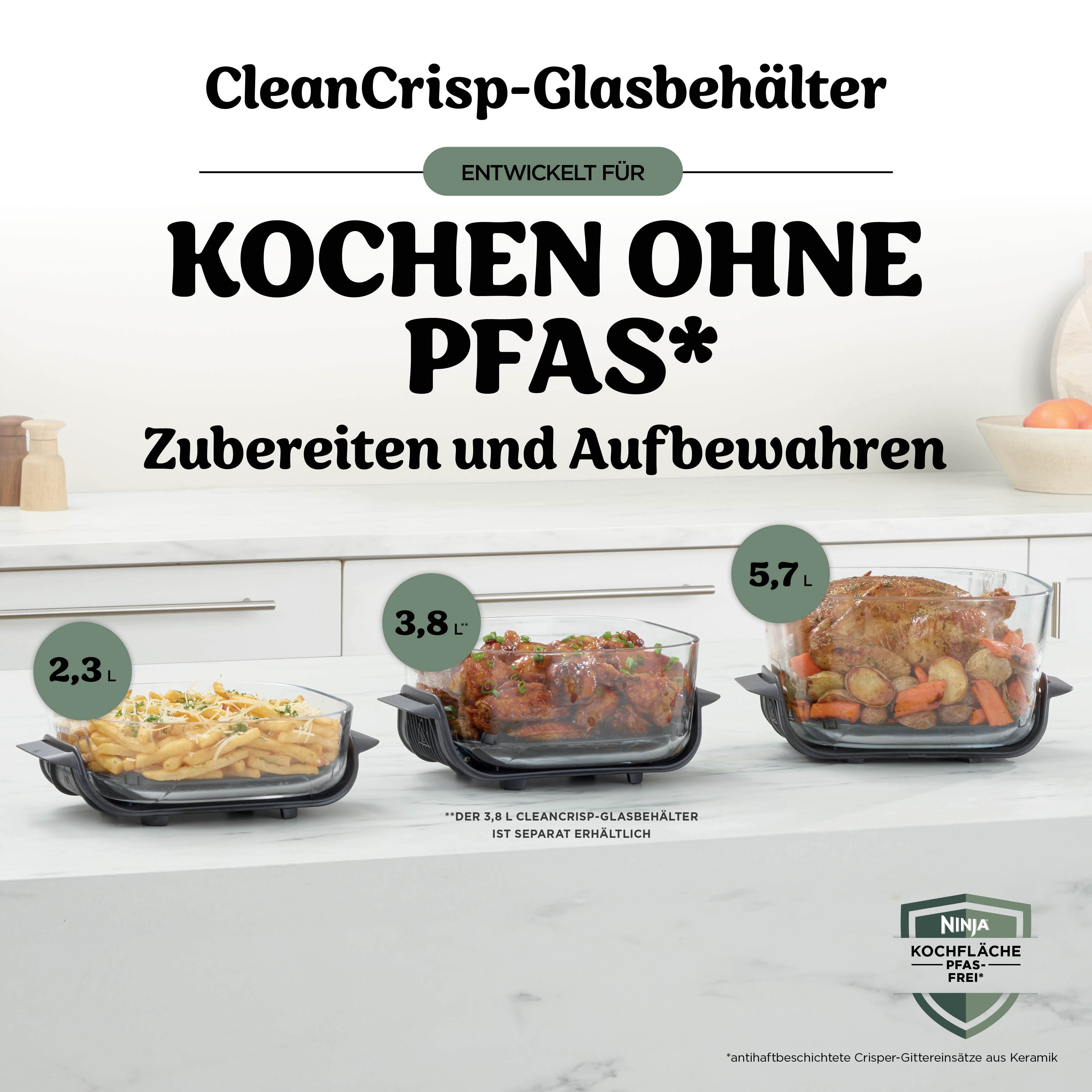 CleanCrisp-Glasbehälter ohne PFAS. Die langlebigen, temperaturwechselbeständigen Glasbehälter sind für Heißluftfrittieren bei bis zu 230°C konzipiert. Der CleanCrisp-Glasbehälter kann außerdem zur Aufbewahrung von Speiseresten benutzt werden – im Kühlschrank wie in der Gefriertruhe. So sind schnelle Mahlzeiten unter der Woche im Nu zubereitet. Extragroßes 5,7 L Fassungsvermögen: Mit dem mitgelieferten 5,7 L Glasbehälter sind große Familienmenüs schnell und einfach gemacht. Platz genug für ein ganzes Brathähnchen mit Kartoffeln und saisonalem Gemüse. Der kleinere 2,3 L Glasbehälter eignet sich perfekt für kleinere Portionen, Snacks, Beilagen und Vorspeisen.