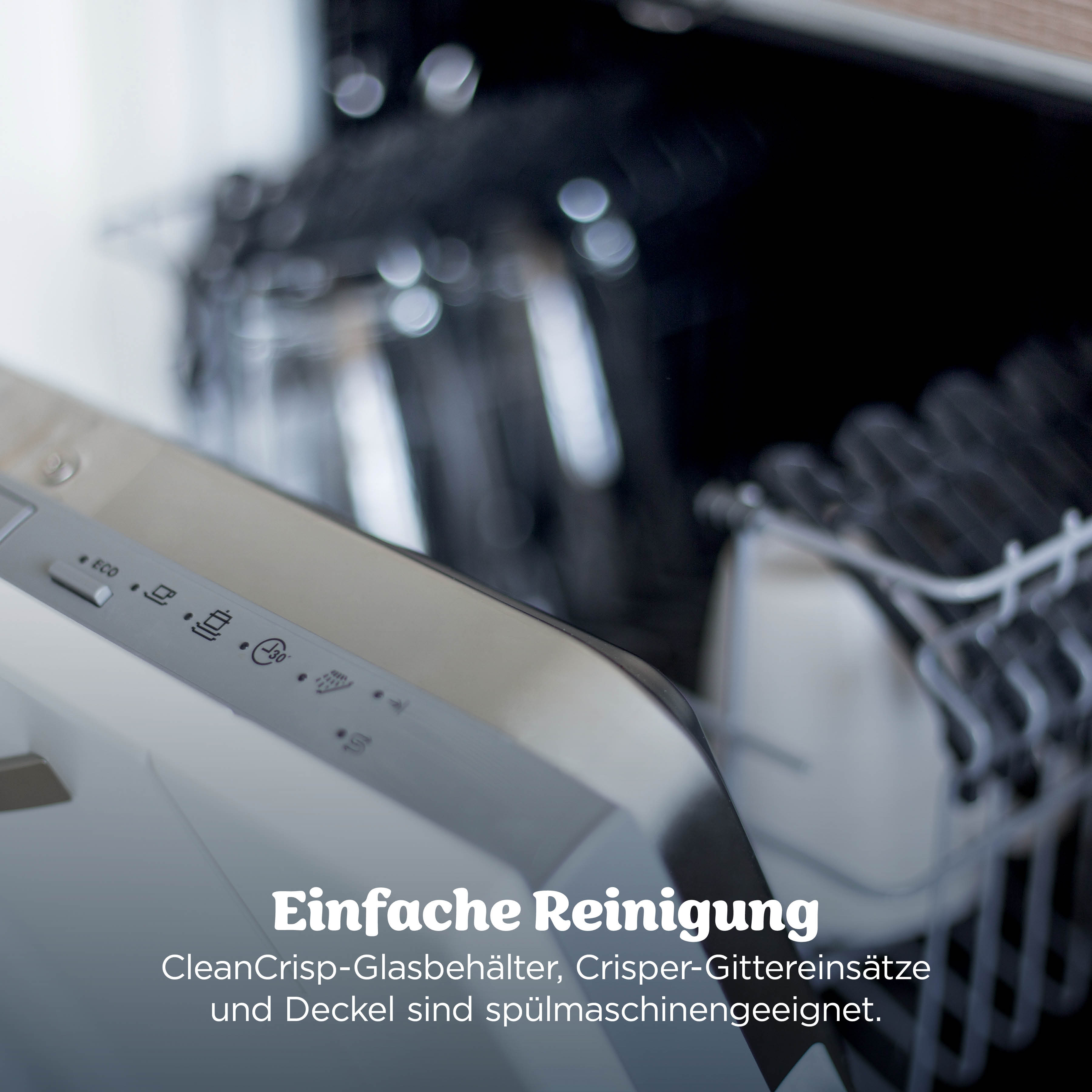 CleanCrisp-Glasbehälter: Jeder Glasbehälter kommt mit praktischen Griffen für den einfachen Transport von der Küche an den Esstisch. Am Boden befinden sich ausserdem Füße, die empfindliche Oberflächen wie hölzerne Schneidebretter, Tische aus Holz oder Granit oder Arbeitsplatten aus Laminat und Marmor schützen. Benutzerfreundliches Bedienfeld: Am Bedienfeld kannst du einfach eins der voreingestellten Programme auswählen. Du kannst die Garergebnisse auch mit den manuellen Steuertasten zur Zeit- und Temperaturregelung steuern. Spülmaschinengeeignetes
