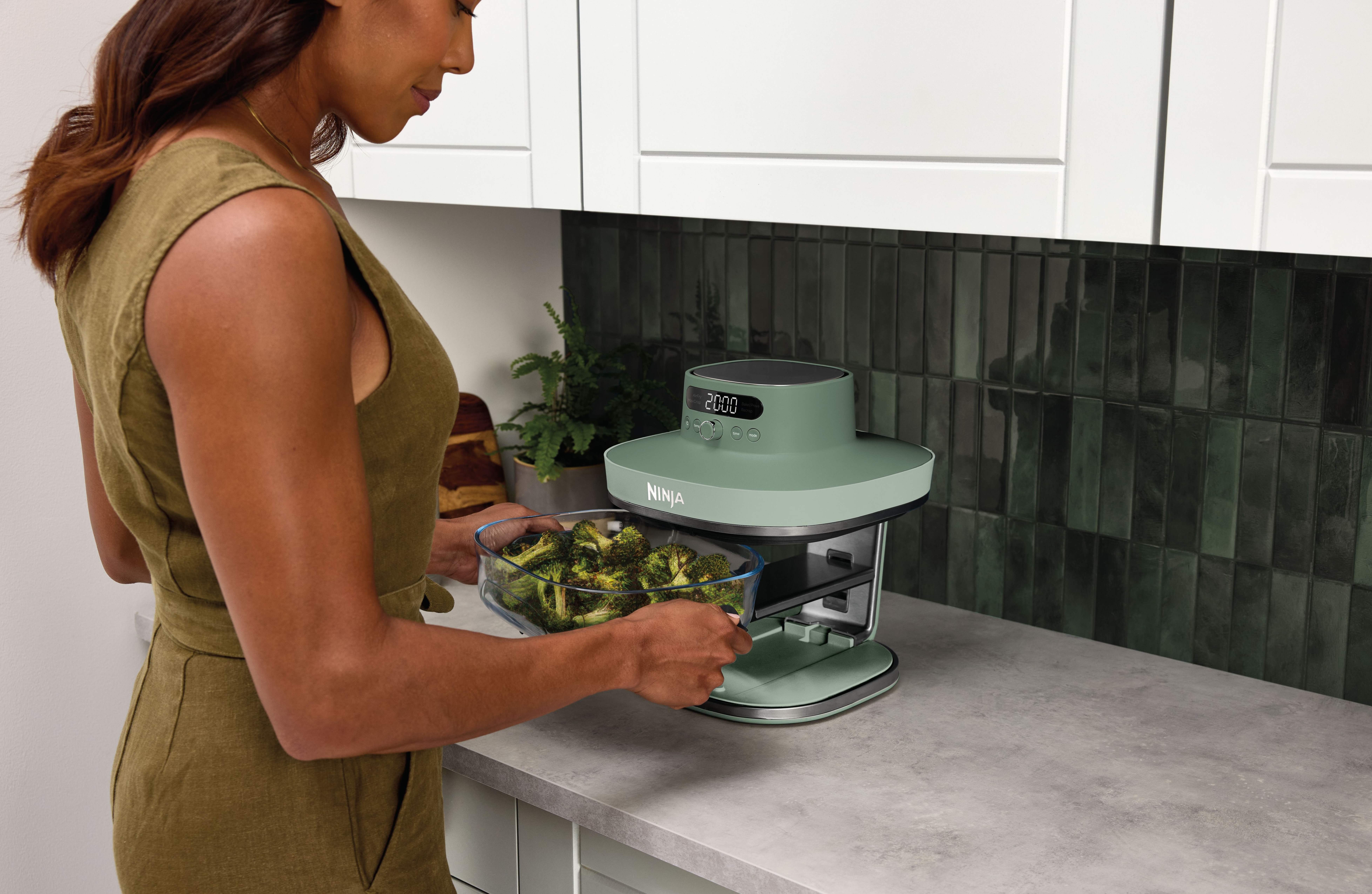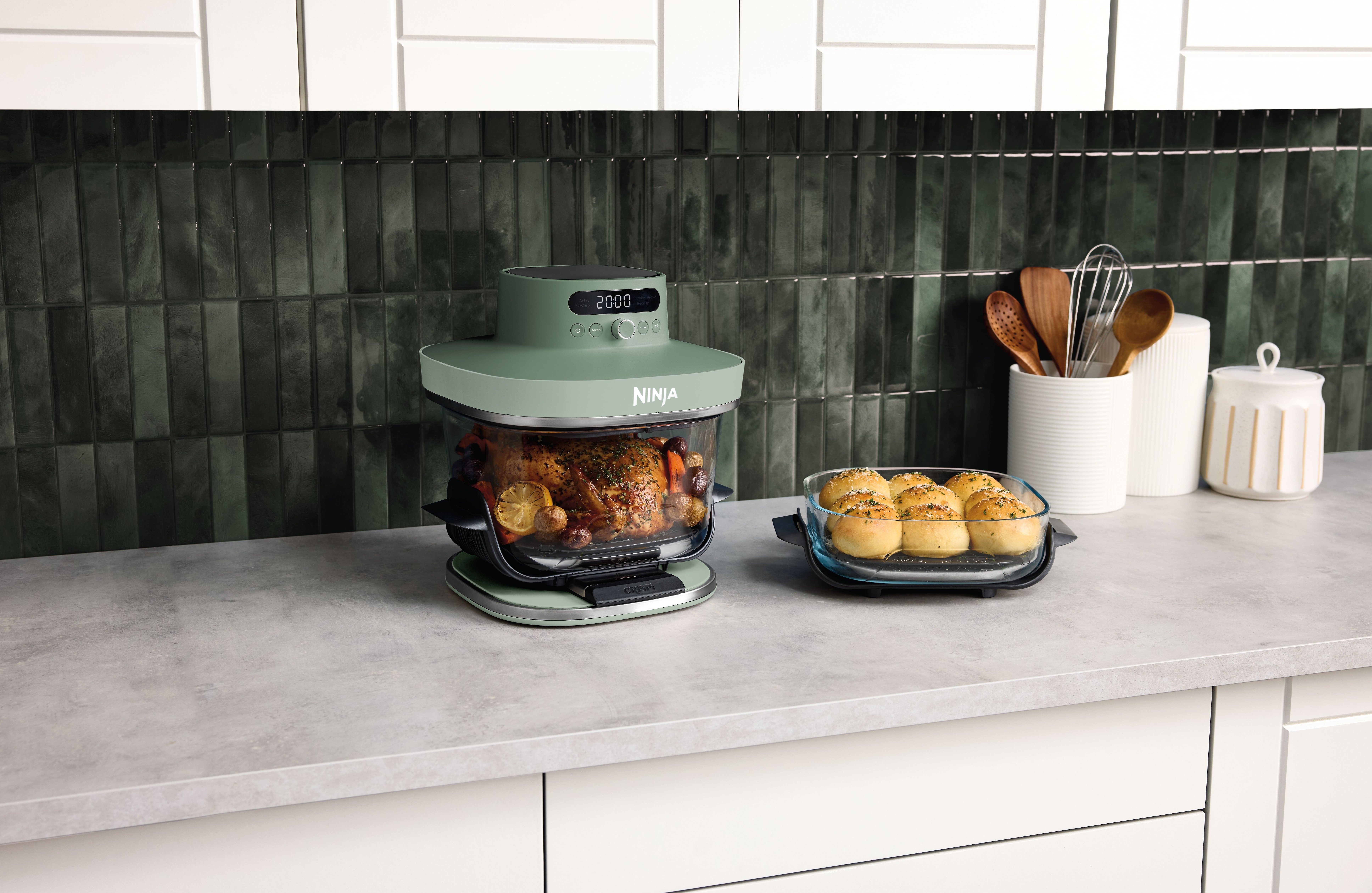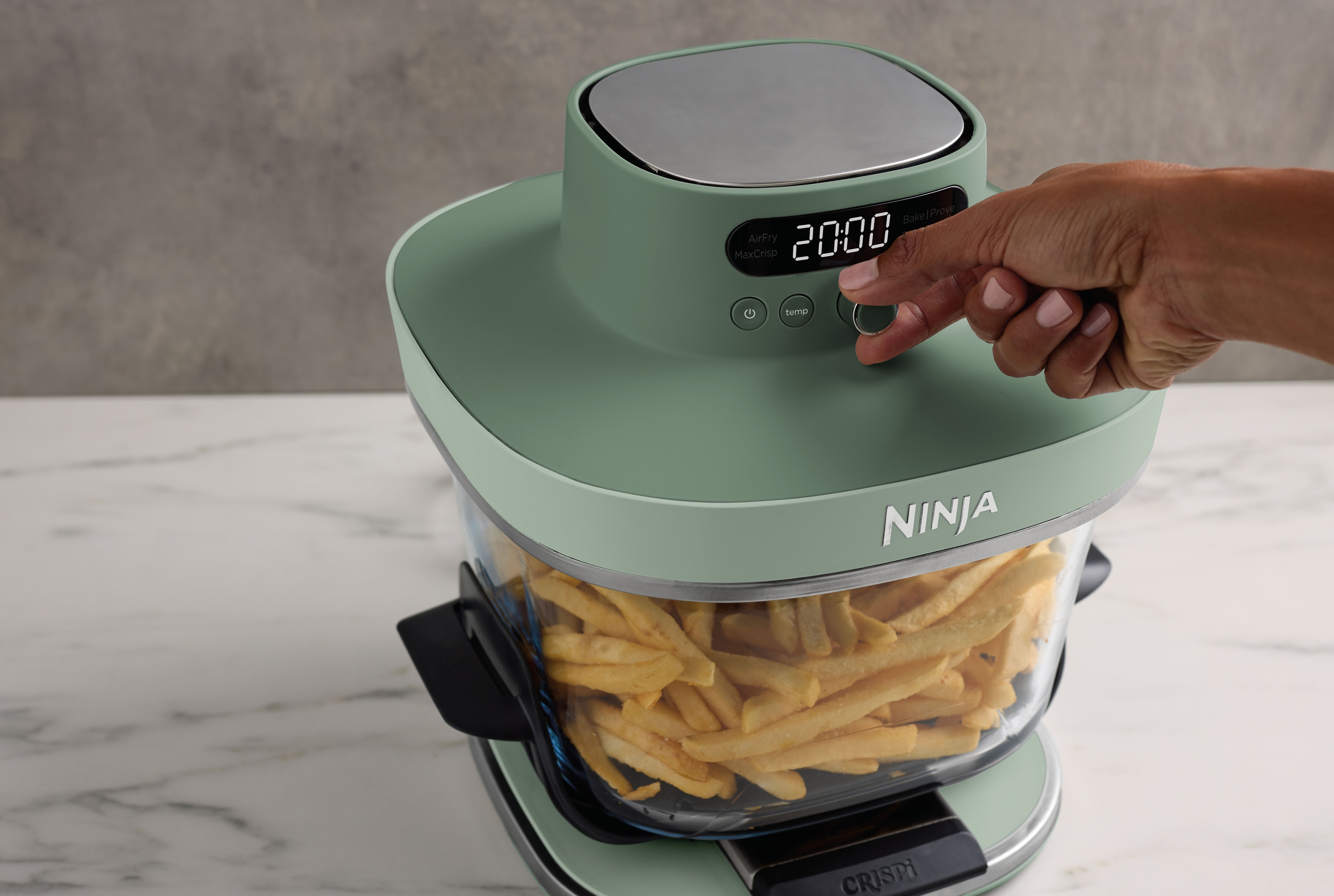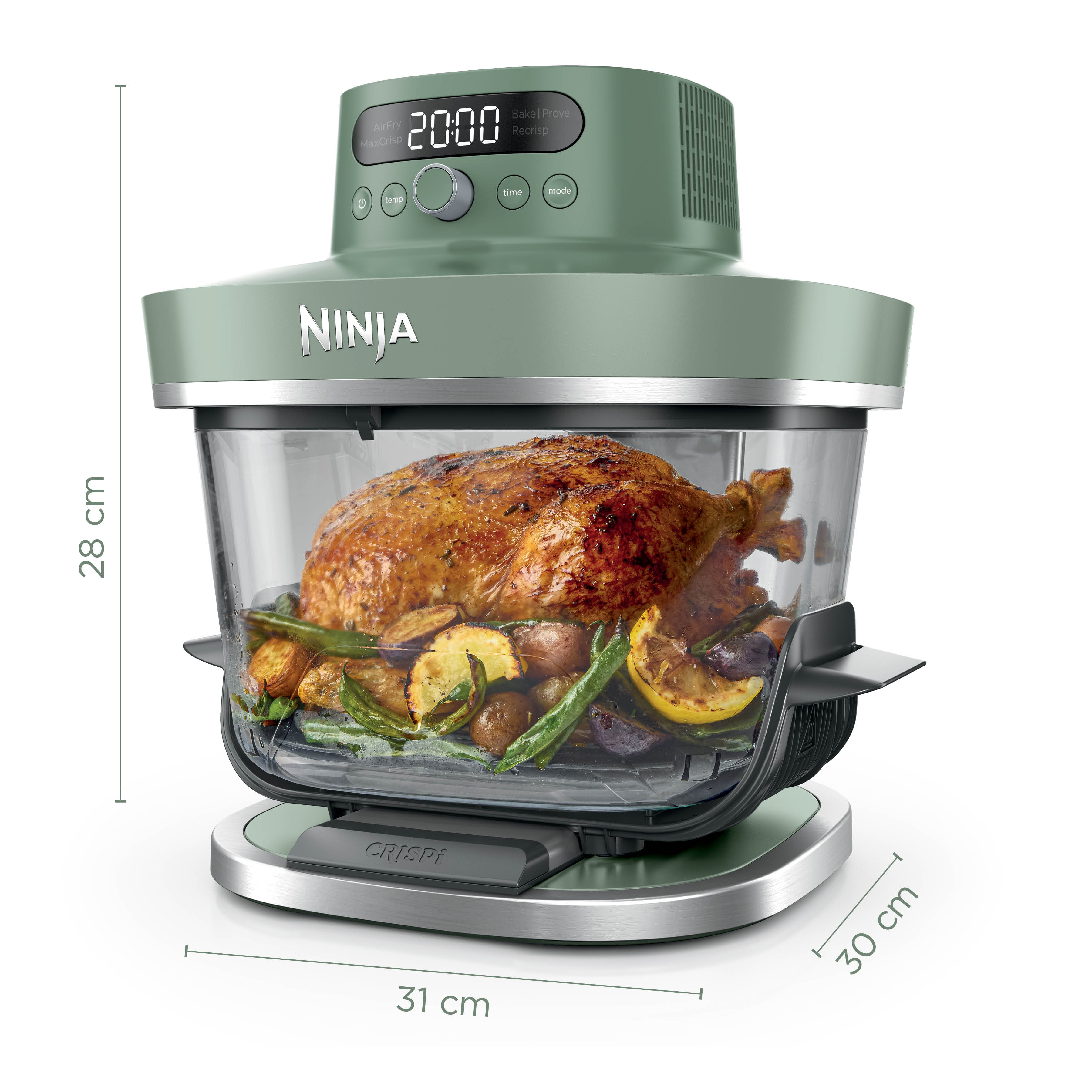 Crispi Pro 5-in-1-Glas-Luftfritteuse, 230 °C, Behälter und Deckel, Mikrowellen-, Gefrierschrank-und spülmaschinenfest, Max Crisp (Max Crisp), Air Fry (Heißluftfrittieren), Bake (Backen), Prove (Teig gehen lassen) und Recrisp (Aufknuspern) - Moss Green