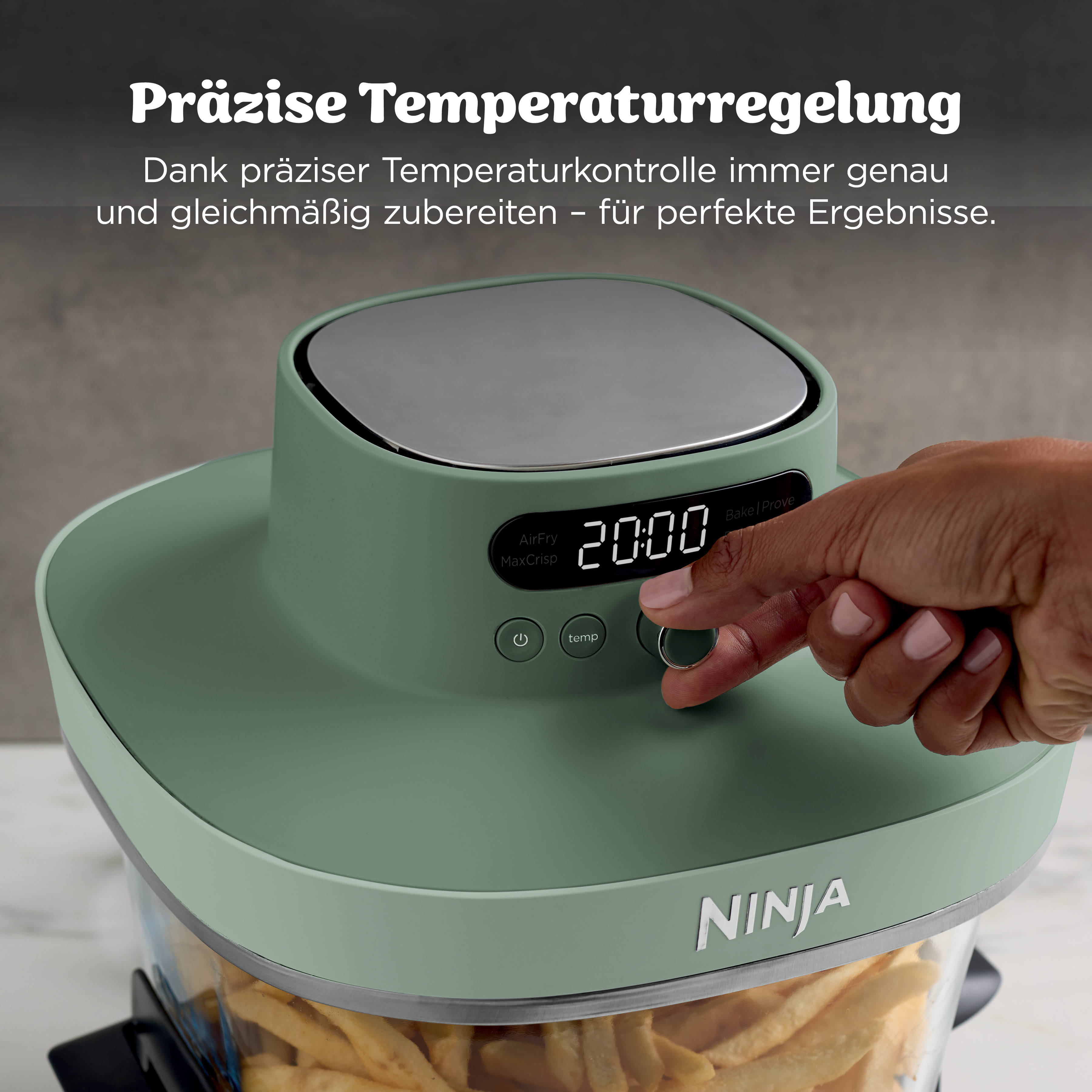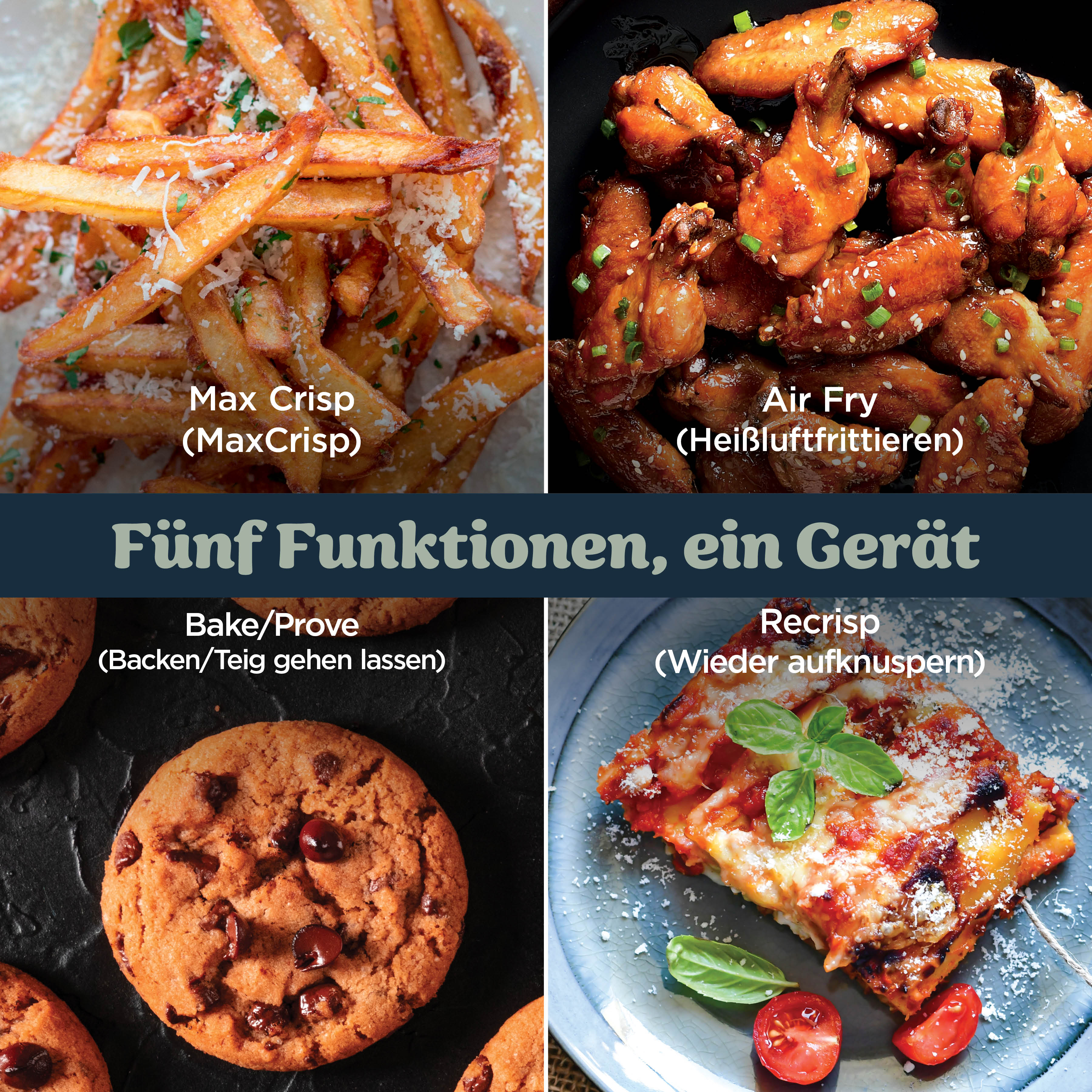 - 5 Zubereitungsfunktionen: Max Crisp (Max Crisp), Air Fry (Heißluftfrittieren), Bake (Backen), Prove (Teig gehen lassen) und Recrisp (Aufknuspern)