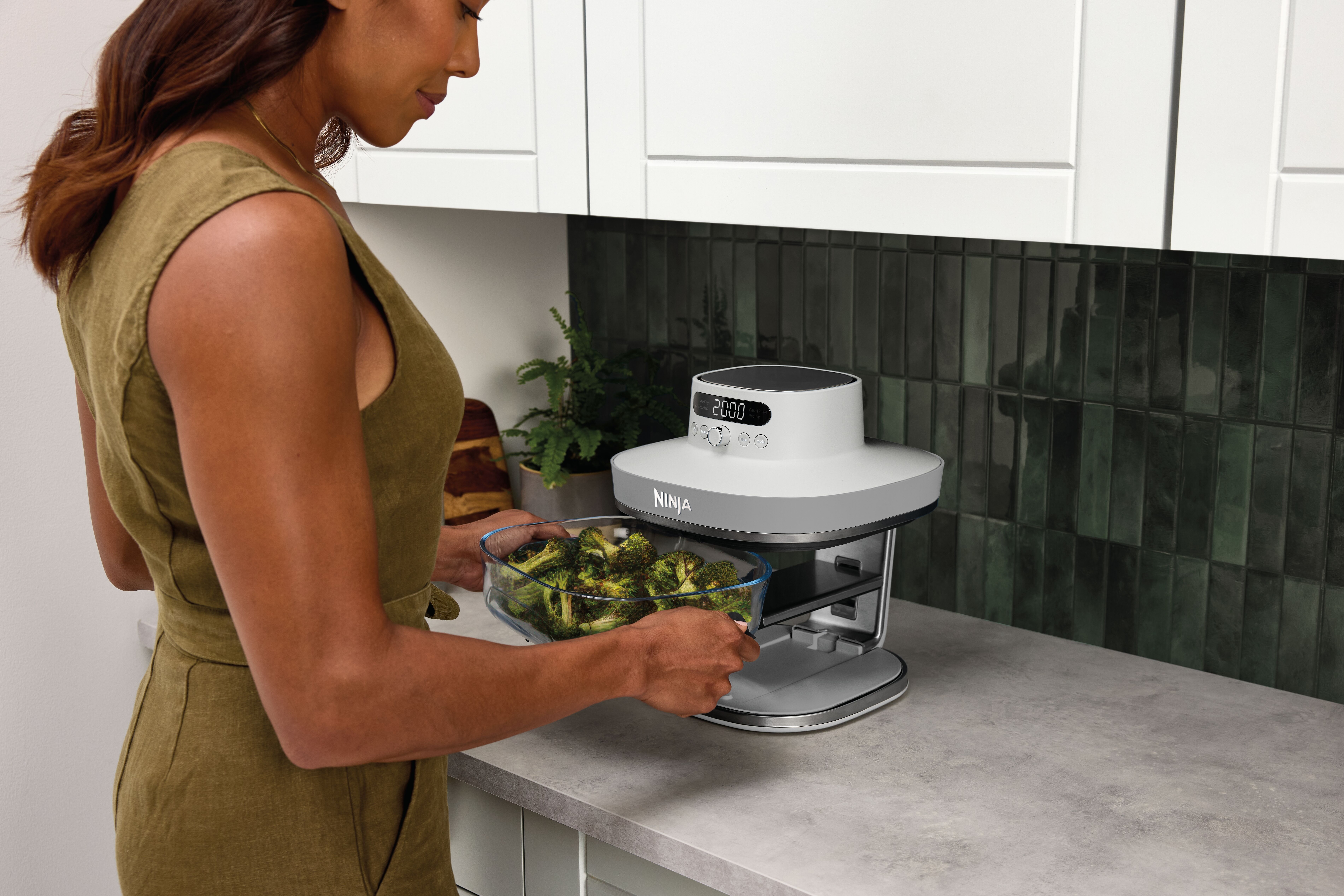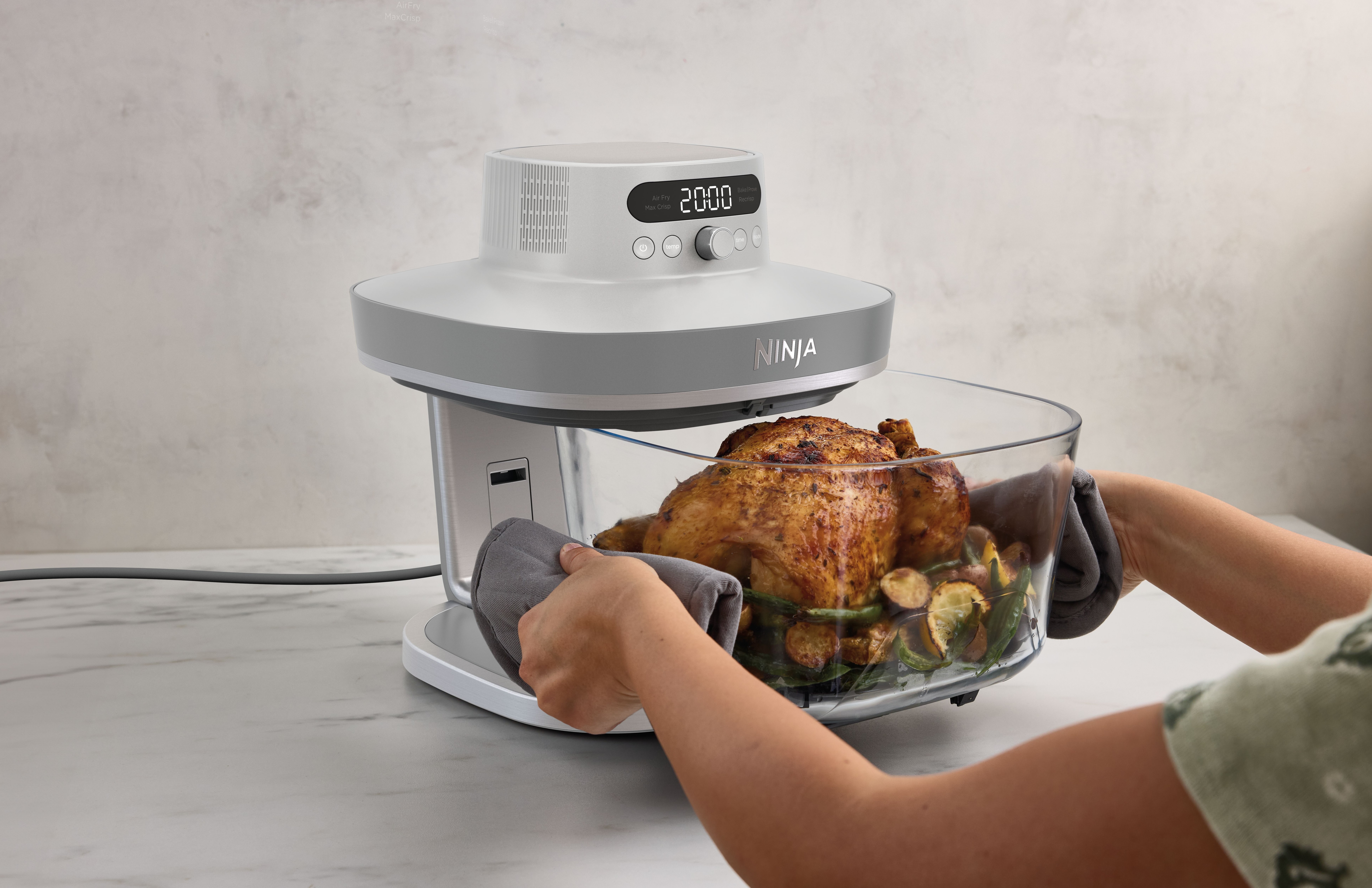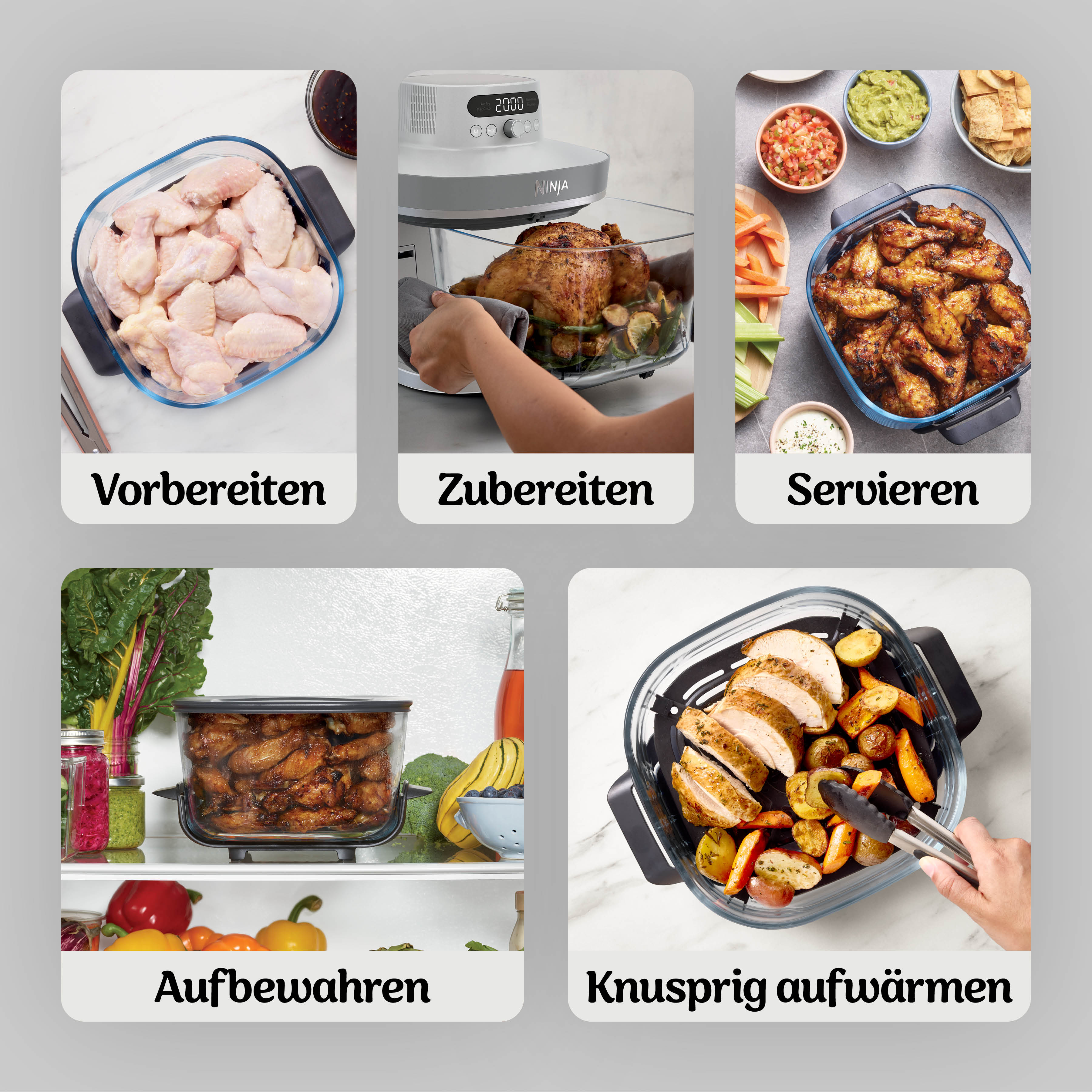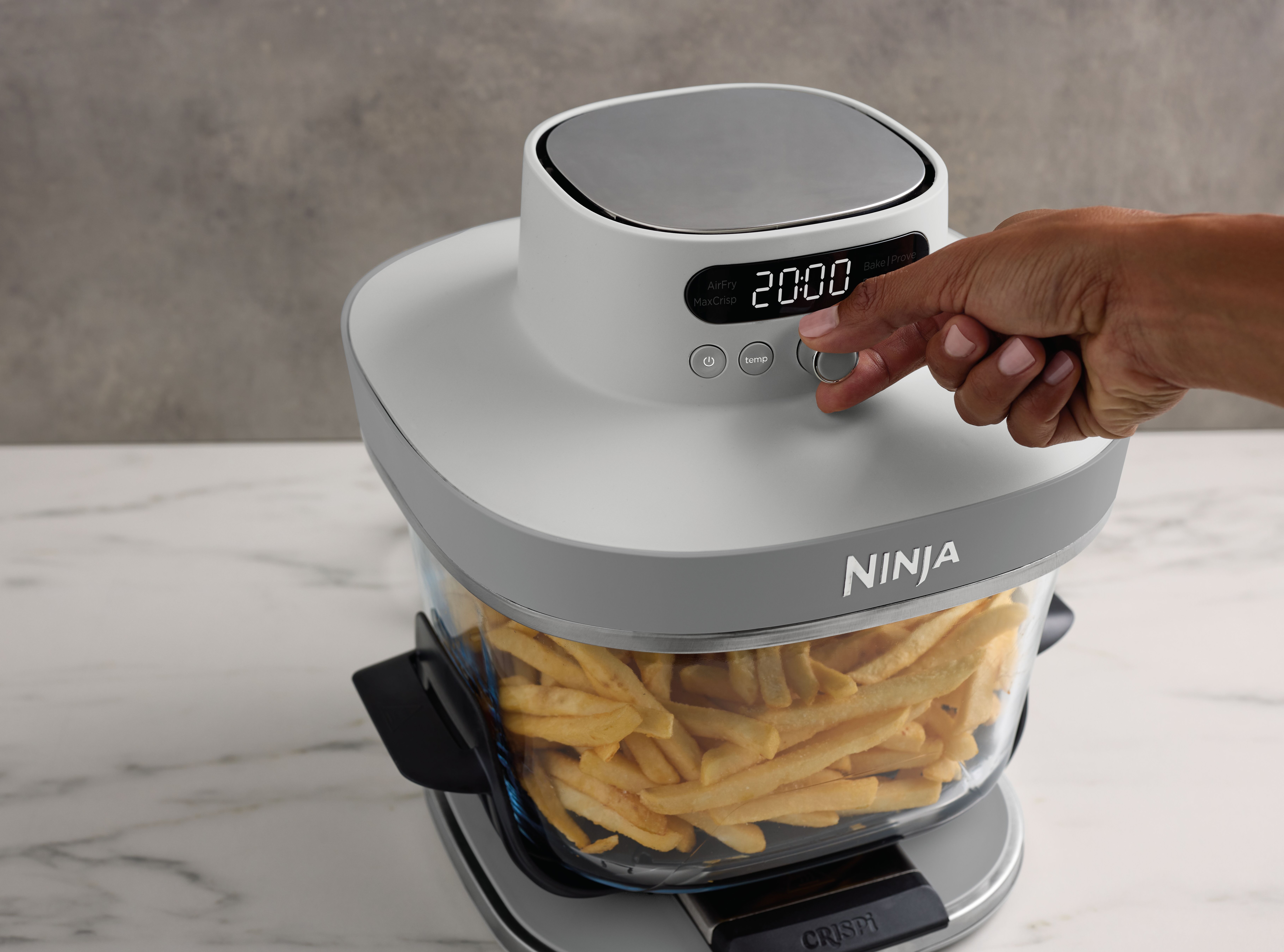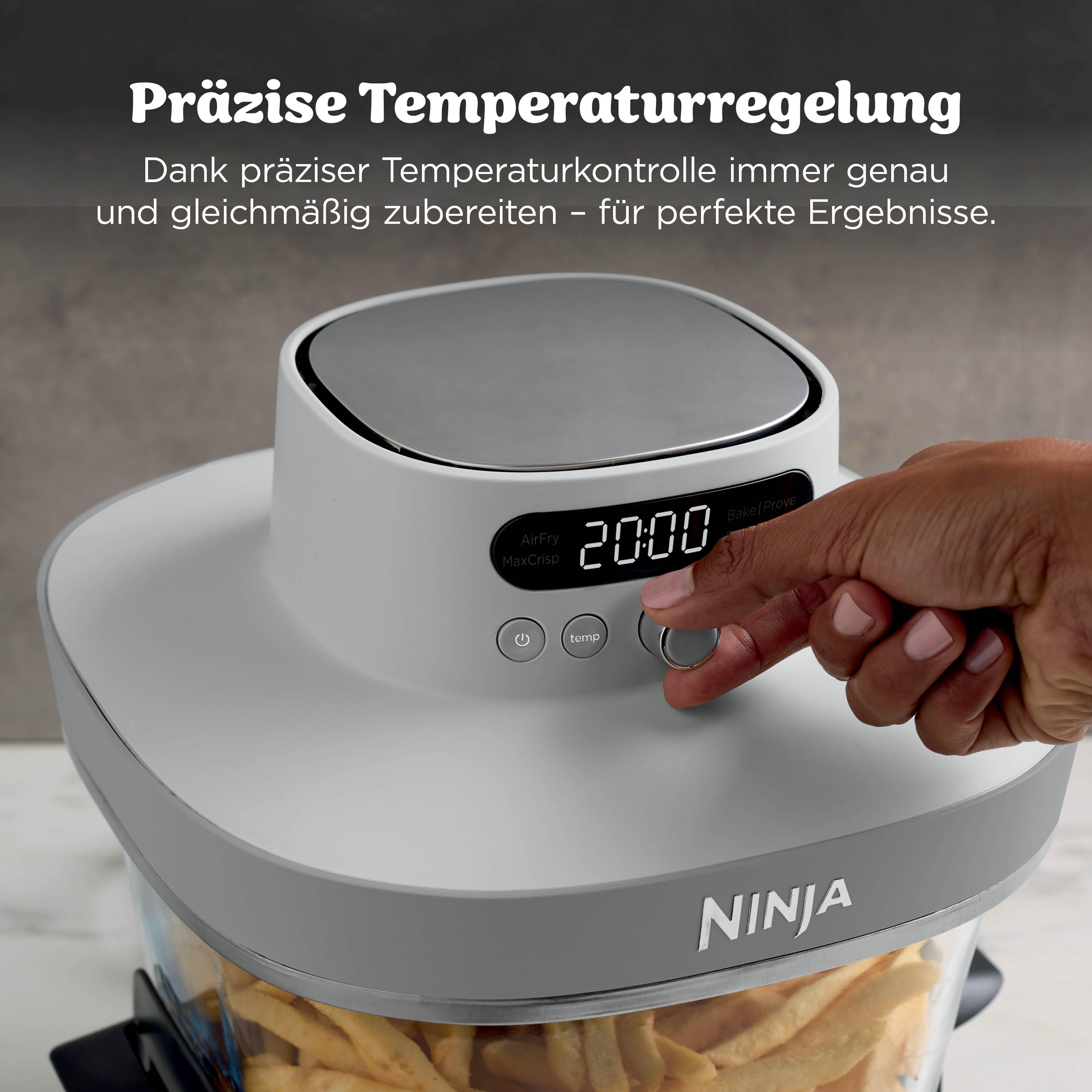 - 5 Zubereitungsfunktionen: Max Crisp (Max Crisp), Air Fry (Heißluftfrittieren), Bake (Backen), Prove (Teig gehen lassen) und Recrisp (Aufknuspern)