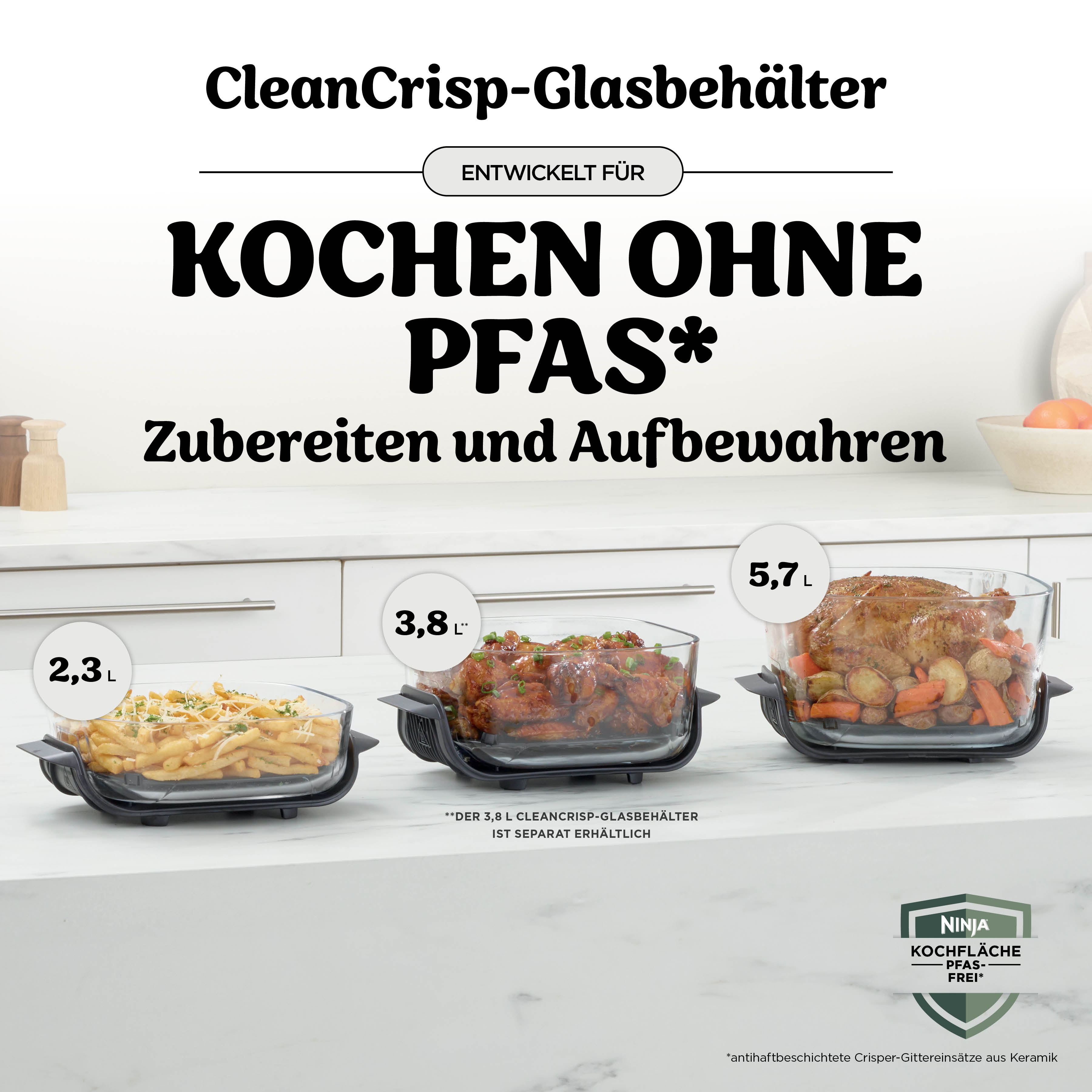 CleanCrisp-Glasbehälter ohne PFAS. Die langlebigen, temperaturwechselbeständigen Glasbehälter sind für Heißluftfrittieren bei bis zu 230°C konzipiert. Der CleanCrisp-Glasbehälter kann außerdem zur Aufbewahrung von Speiseresten benutzt werden – im Kühlschrank wie in der Gefriertruhe. So sind schnelle Mahlzeiten unter der Woche im Nu zubereitet. Extragroßes 5,7 L Fassungsvermögen: Mit dem mitgelieferten 5,7 L Glasbehälter sind große Familienmenüs schnell und einfach gemacht. Platz genug für ein ganzes Brathähnchen mit Kartoffeln und saisonalem Gemüse. Der kleinere 2,3 L Glasbehälter eignet sich perfekt für kleinere Portionen, Snacks, Beilagen und Vorspeisen.