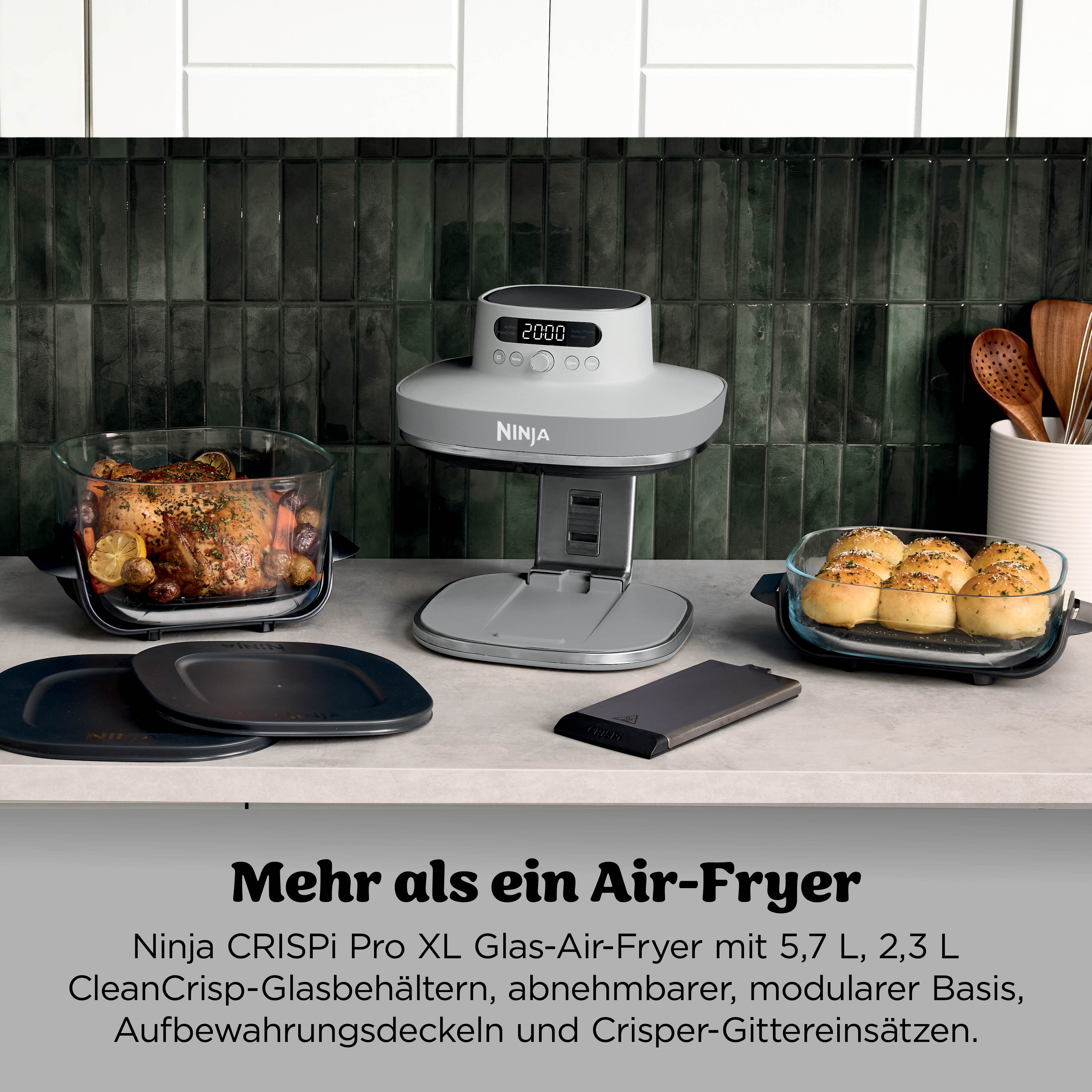 - Beinhaltet: CRISPi PRO XL 2050 W Air-Fryer, 5,7 L & 2,3 L CleanCrisp-Glasbehälter, entnehmbare modulare Basis, 2 Crisper-Gittereinsätze, 2 Deckel zur Aufbewahrung & Rezeptheft