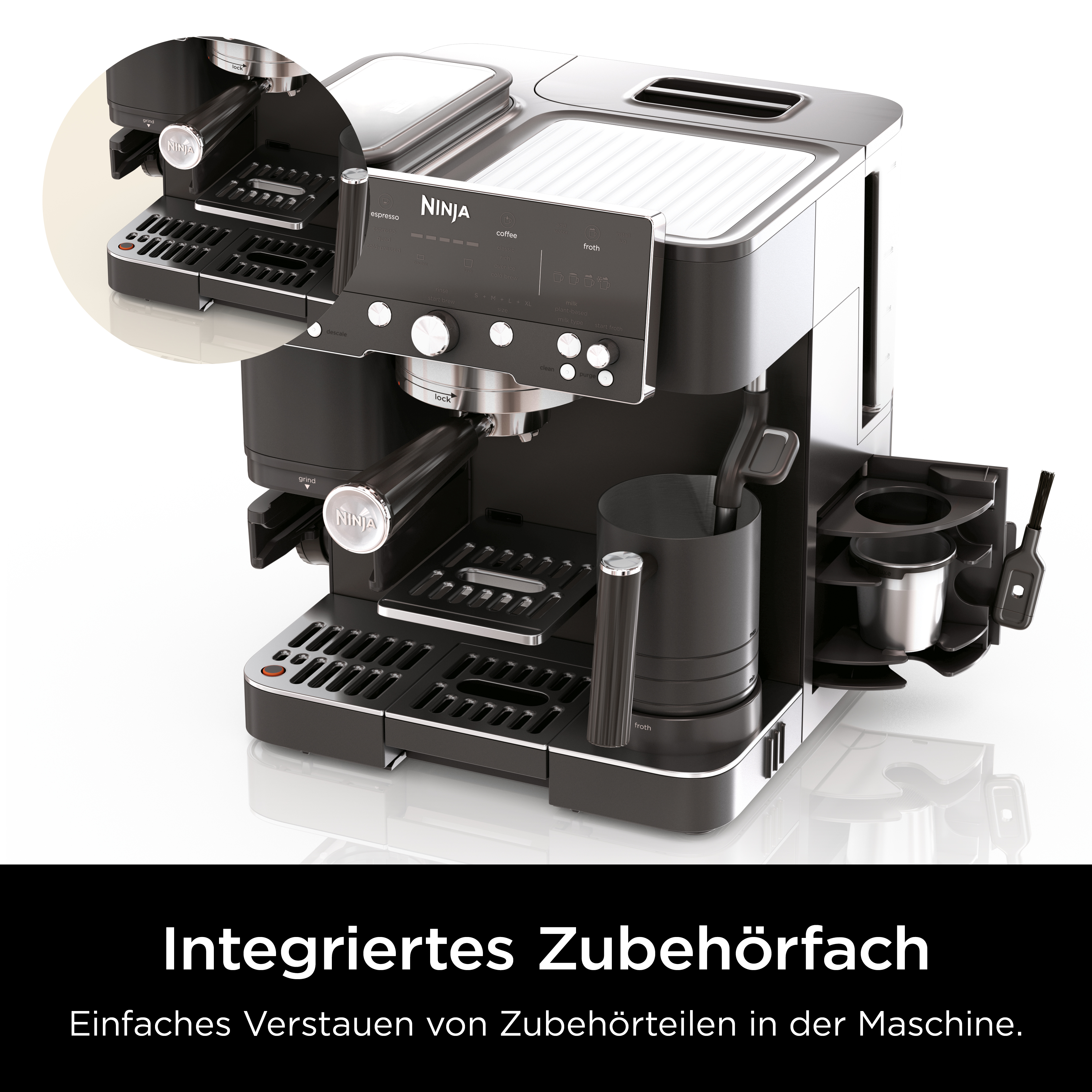 Lieferumfang: Milchkännchen mit integriertem Schneebesen, unterstützter Tamper, integriertes Mahlwerk, Reinigungsbürste, Starterpaket, Reinigungsset und Rezeptheft.