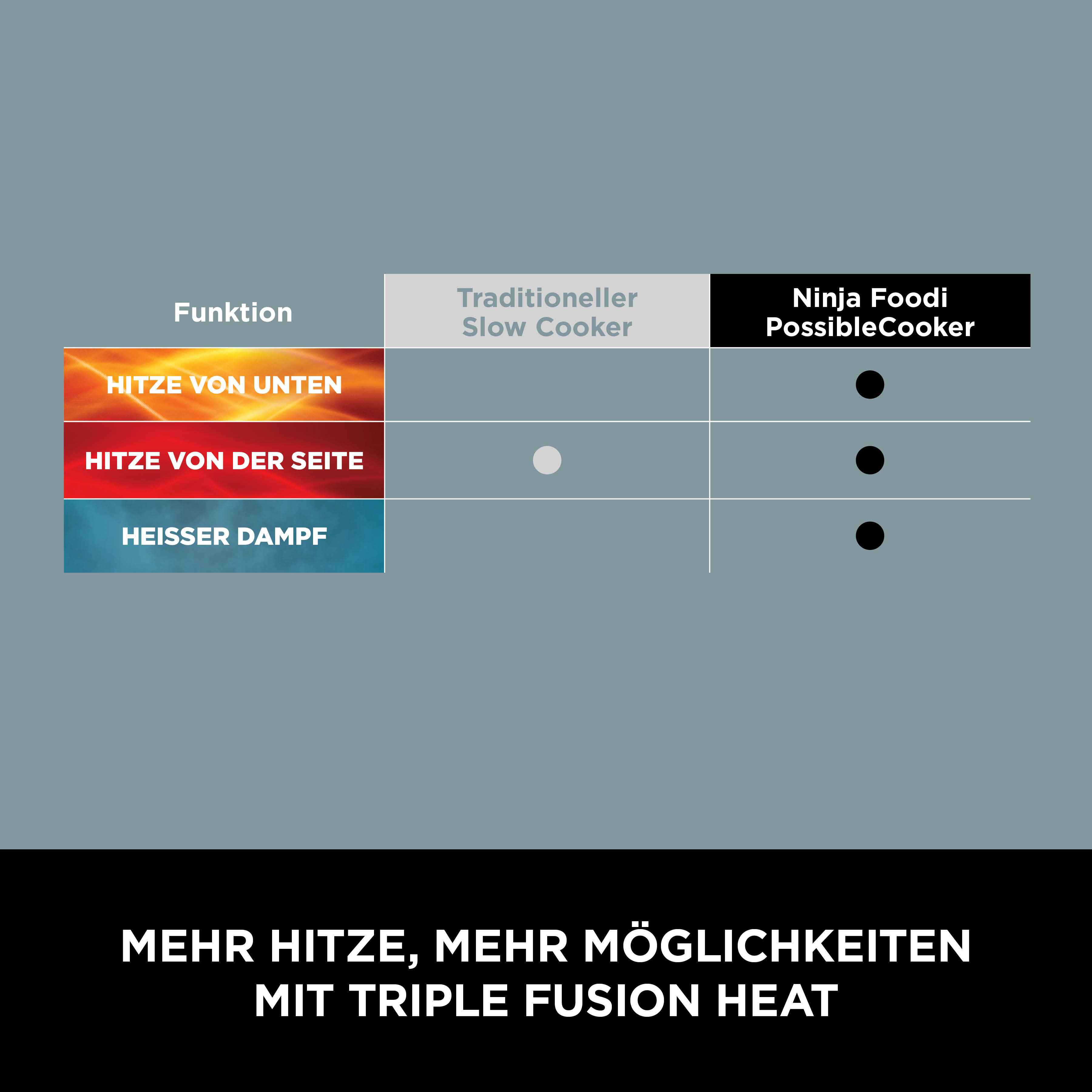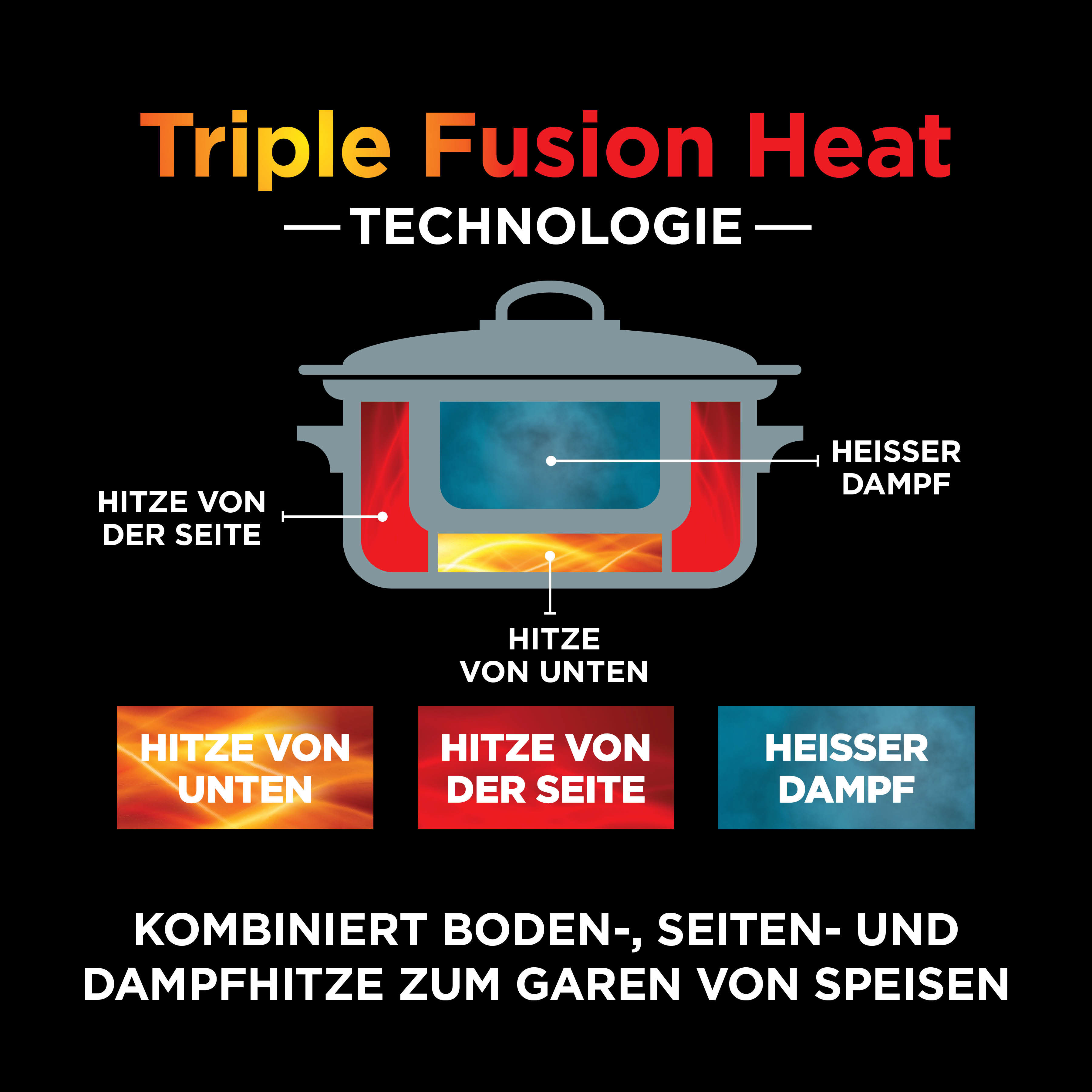 Mit einer Leistung von bis zu 1200 Watt kombiniert Triple Fusion Heat die seitlichen und unteren Heizelemente mit Dampferhitzung für schnelles und gleichmäßiges Kochen und eröffnet so noch mehr kulinarische Möglichkeiten.
