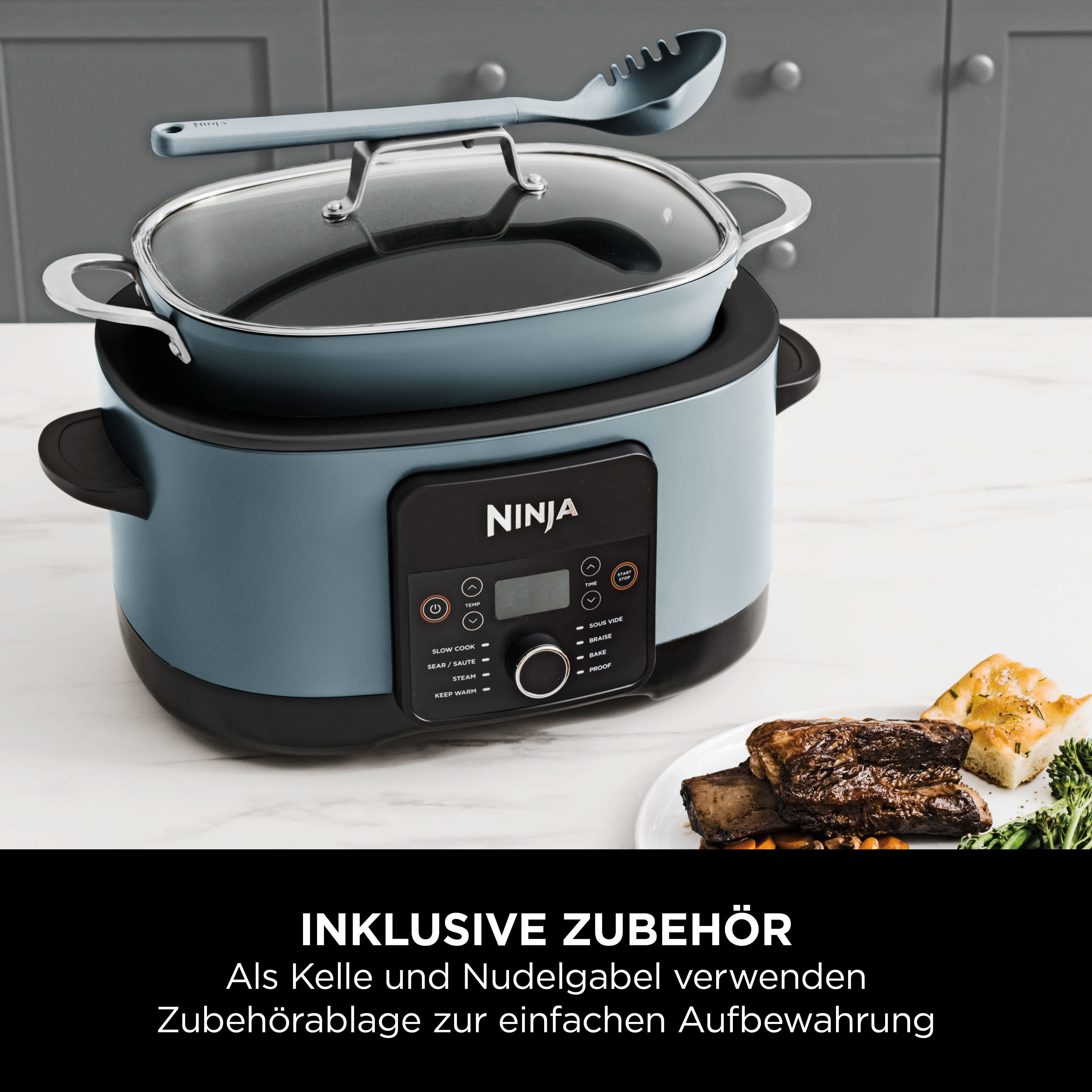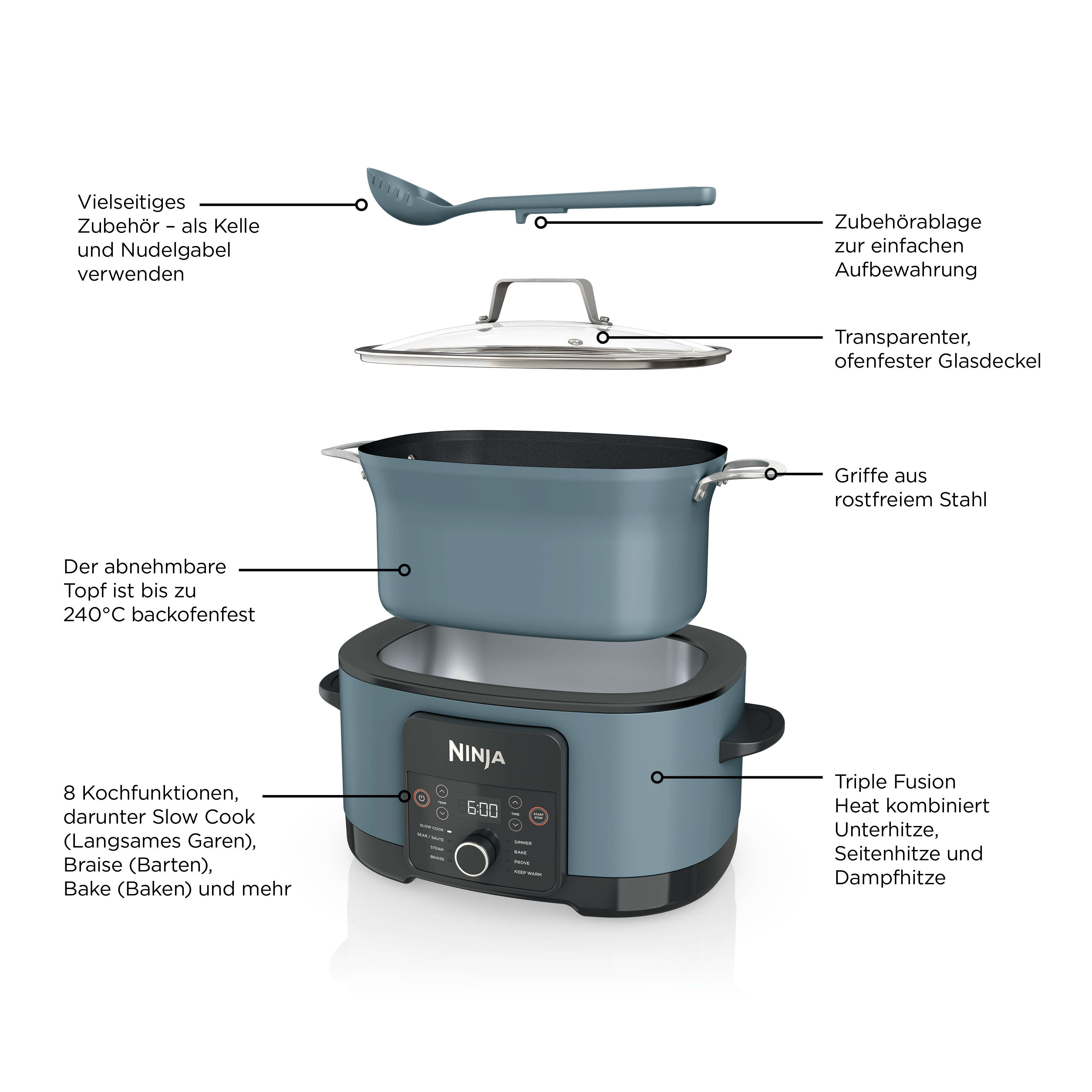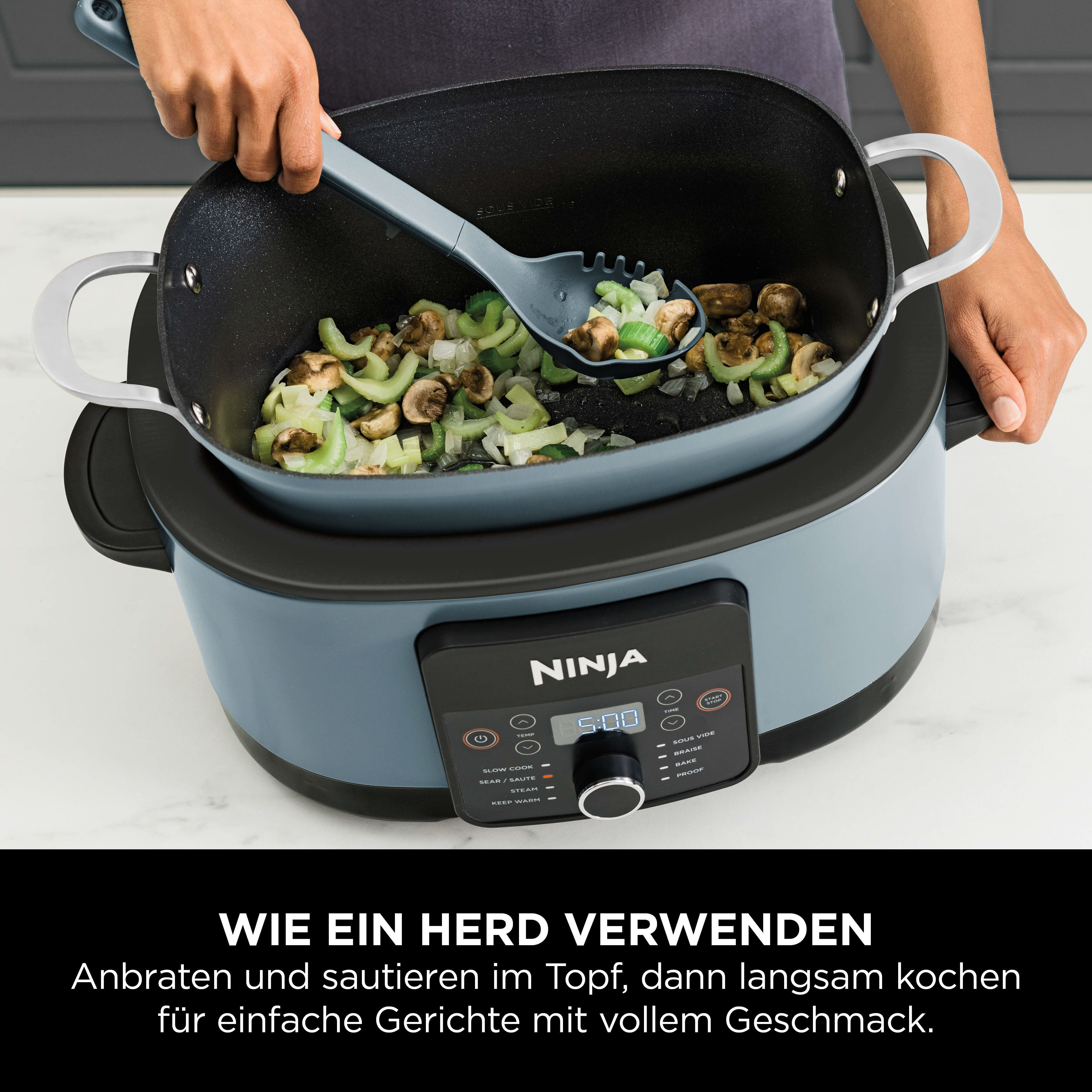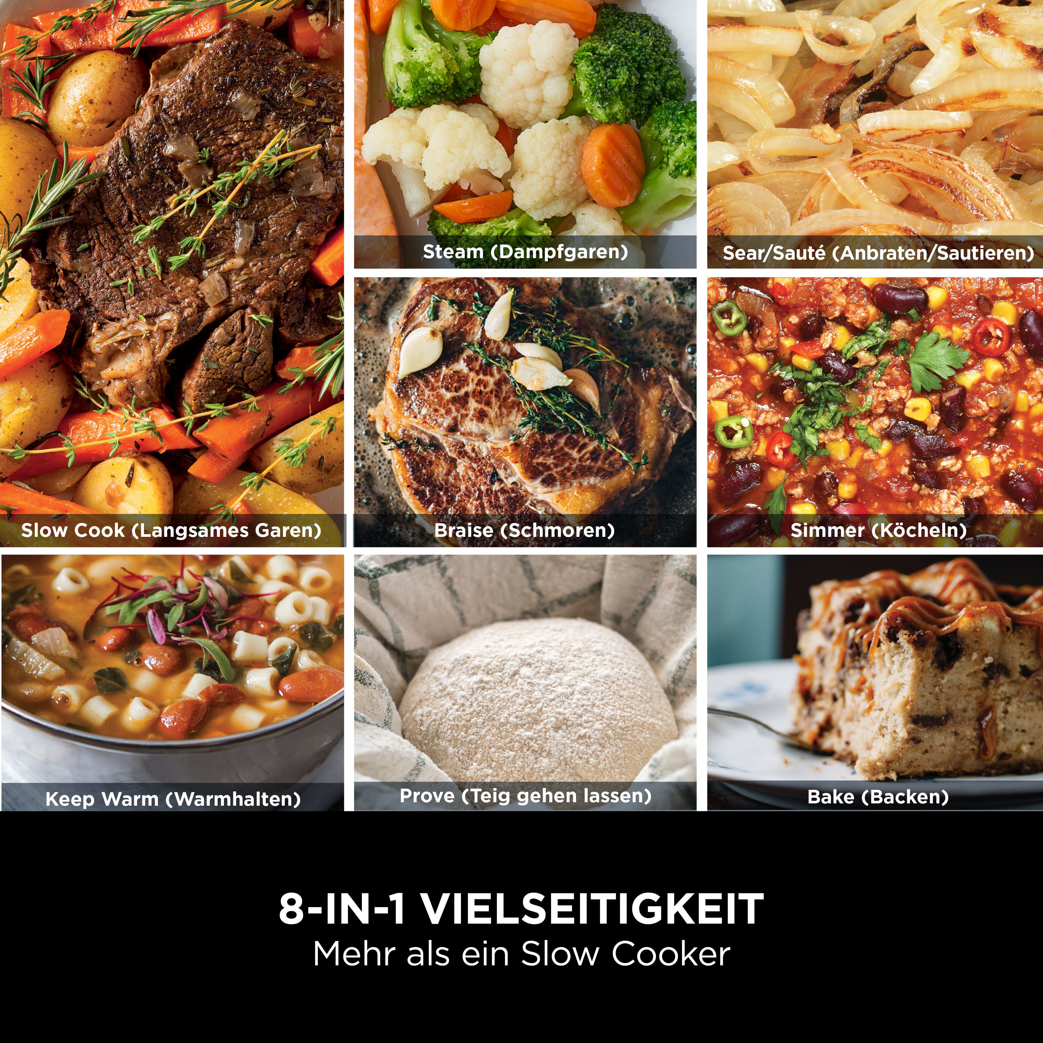 - 8 Funktionen: Slow Cooking, Anbraten/Sautieren, Dampfgaren, Schmoren , Köcheln, Backen, Teig gehen lassen, Warmhalten
