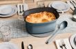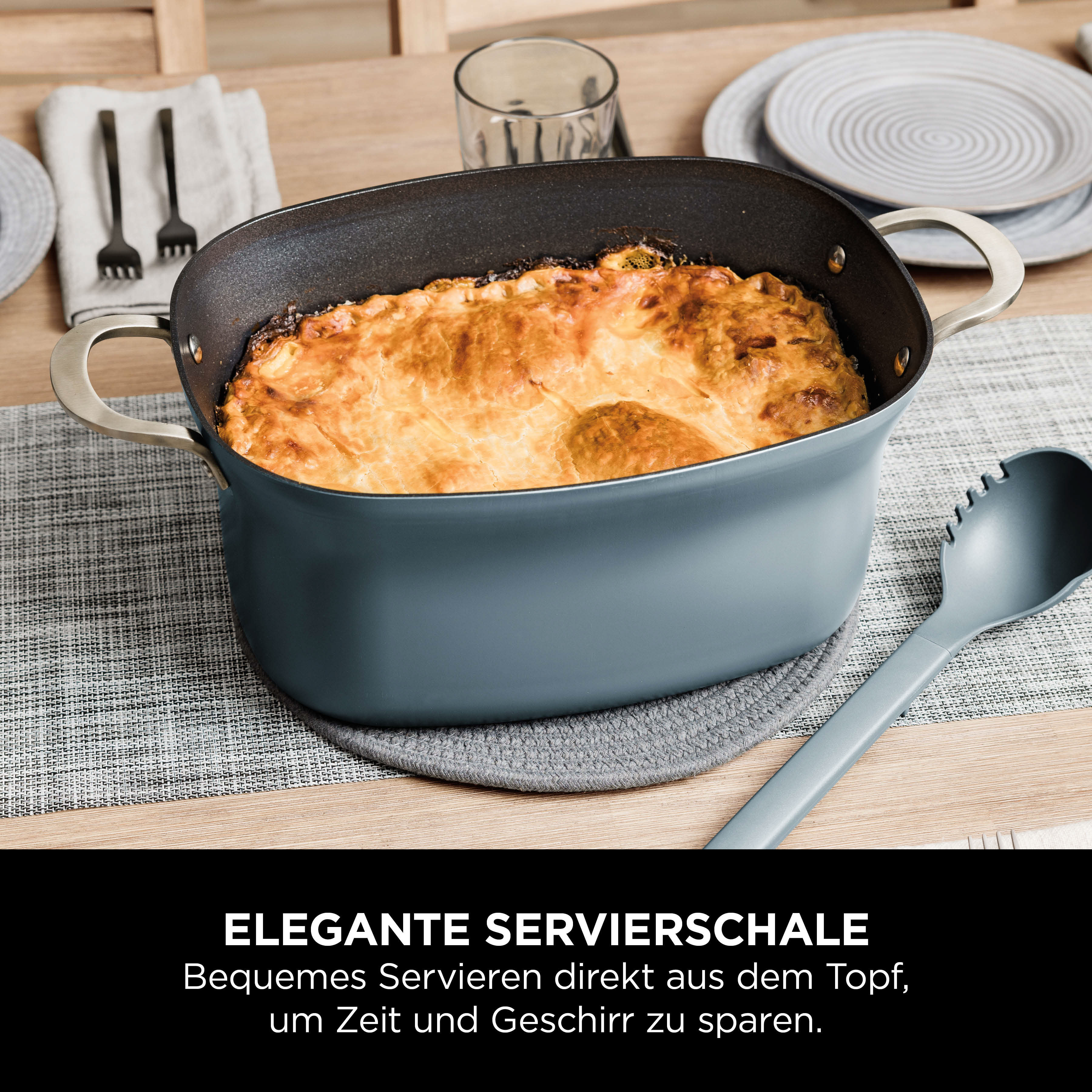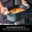 Direkt von der Arbeitsfläche in den Ofen und auf den Tisch: Anbraten, Sautieren und Kochen direkt im Topf mit Funktionen wie auf dem Herd. Anschließend kann der Kochtopf in den Ofen geschoben werden, um Aufläufe und Pasteten mit knusprigem Teig zuzubereiten. Der elegante Topf ist bis zu 240 °C backofenfest und kann auch als elegante Servierschale verwendet werden.