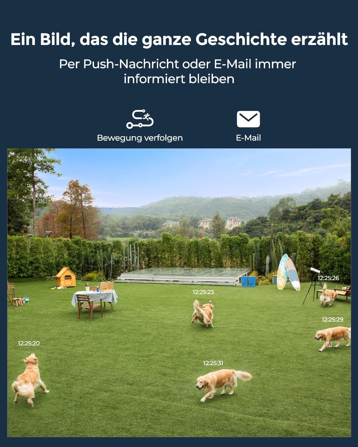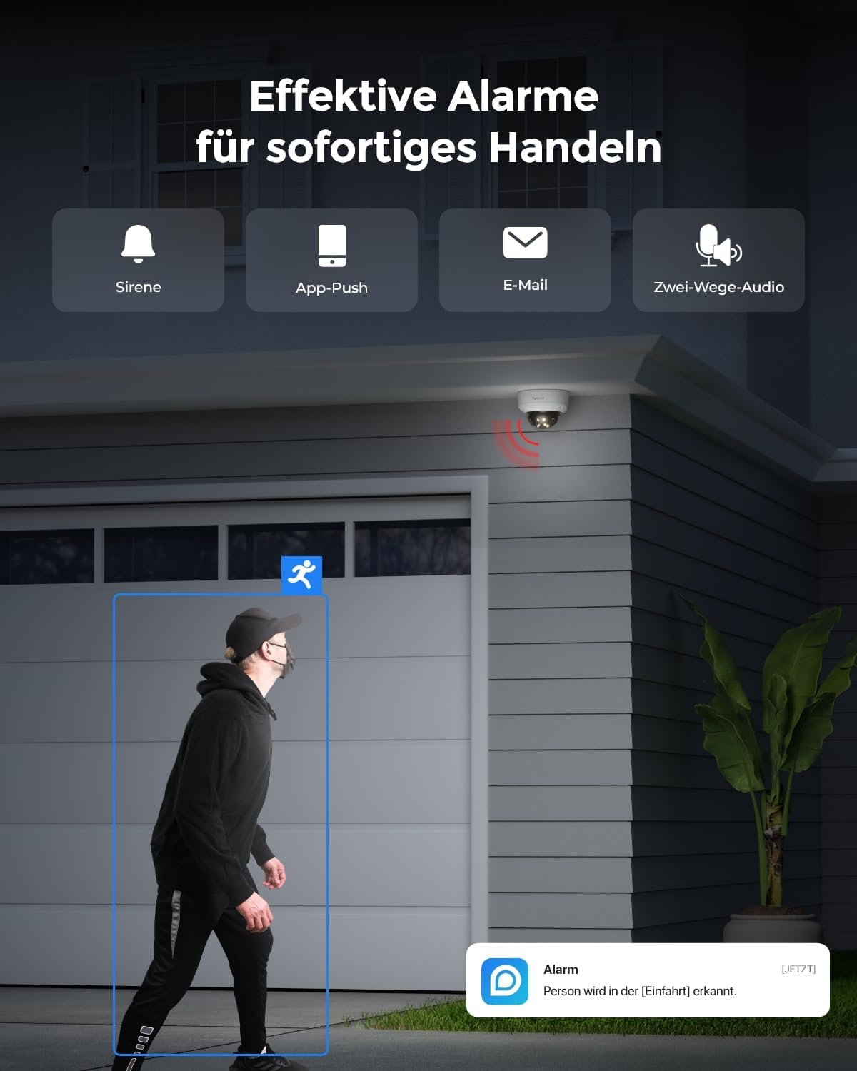 Dank fortschrittlicher Algorithmen kann die Kamera Bewegungen von Menschen, Fahrzeugen und Tieren intelligent von anderen Objekten unterscheiden, wodurch Fehlalarme deutlich reduziert werden. Wird eine Bewegung erkannt, erhalten Sie umgehend Push-Benachrichtigungen und E-Mails, sodass Sie immer auf dem Laufenden sind. Dafür fallen keine Monatsgebühren an.