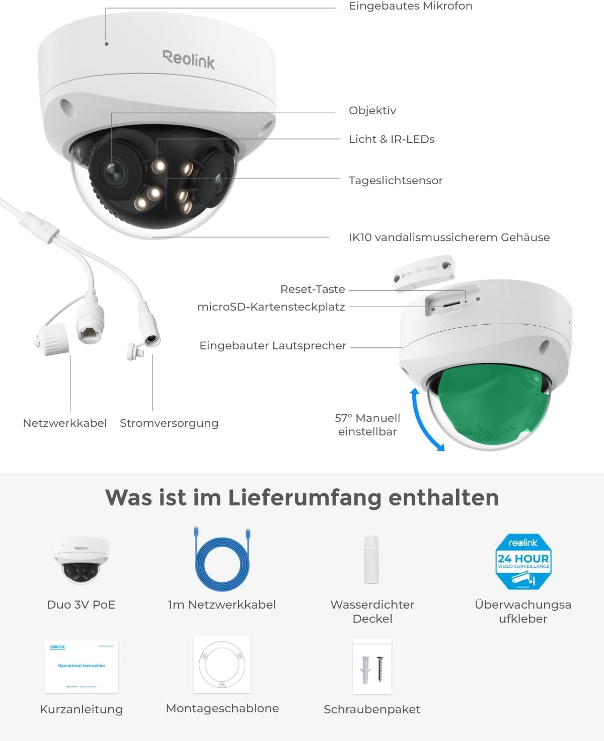 Seien Sie beruhigt, denn Ihre Sicherheit ist unnachgiebig. Die Reolink Duo 3V PoE verfügt über eine IK10-Einstufung für Vandalismusschutz, was bedeutet, dass sie starken Stößen und Manipulationen standhält, selbst mit stumpfen Gegenständen wie Fledermäusen oder Knüppeln.