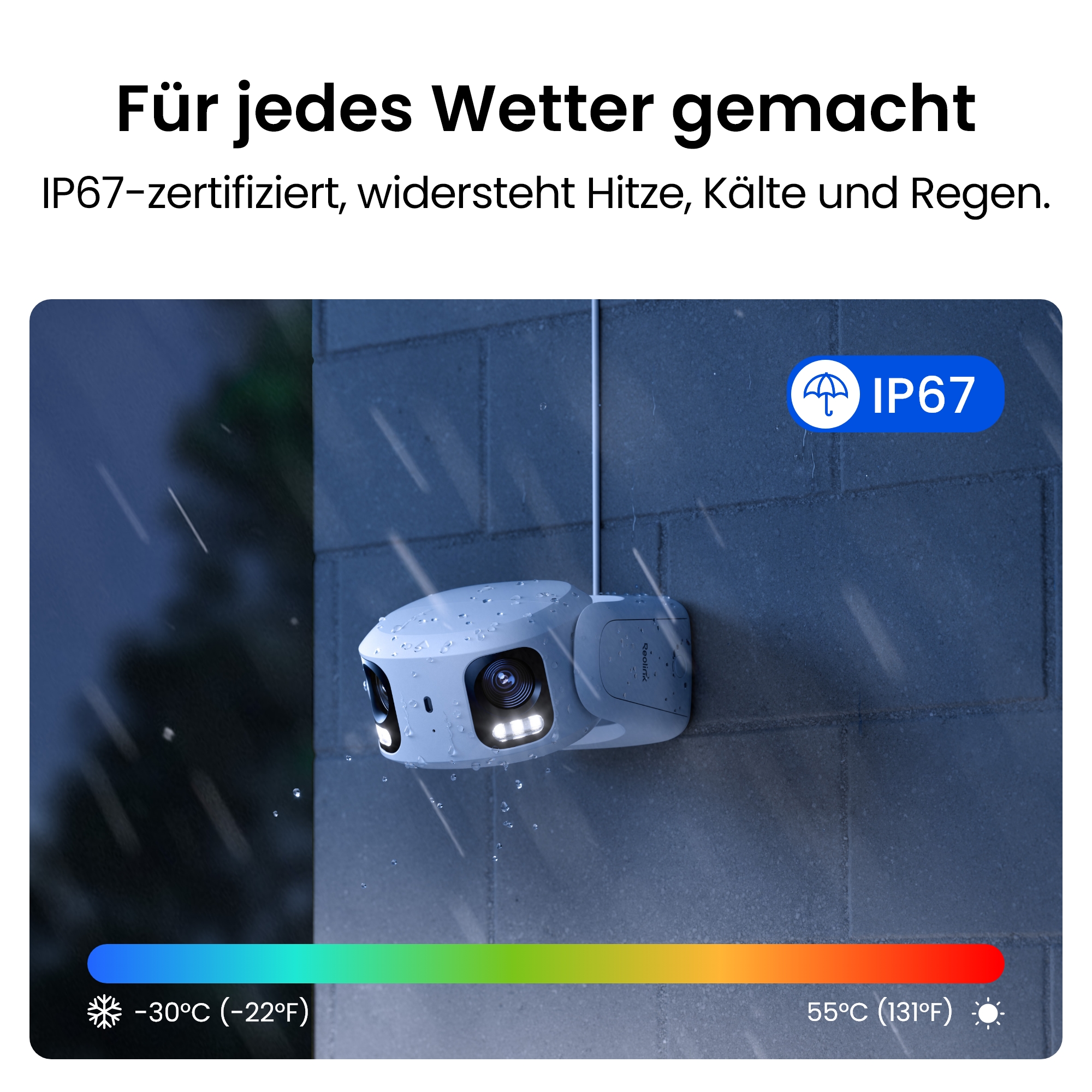 Die Kamera verfügt über ein IP67-zertifiziertes Gehäuse, das vollständigen Schutz gegen Staub und Wasser bietet. Sie funktioniert zuverlässig bei extremen Temperaturen von -30°C bis +55°C. Das robuste Metallgehäuse sorgt für Langlebigkeit und Schlagfestigkeit.