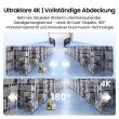 Die Kamera bietet eine Auflösung von 8MP (5120*1552) bei 25fps und unterstützt H.265/H.264 Video-Kompression. Sie verfügt über Zwei-Wege-Audio, einen 512GB microSD-Kartensteckplatz und ist mit Google Assistant kompatibel. Die Abmessungen betragen 132mm x 131mm x 72mm und das Gewicht liegt bei 775g ohne Zubehör.
