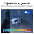 Die Kamera ist mit Infrarot-LEDs und Scheinwerfern ausgestattet, die verschiedene Beleuchtungsoptionen bieten. Sie wechselt automatisch in den Infrarotmodus bei Nacht für klare Schwarz-Weiß-Bilder und bietet Farb-Nachtsicht bei aktivem Scheinwerfer.