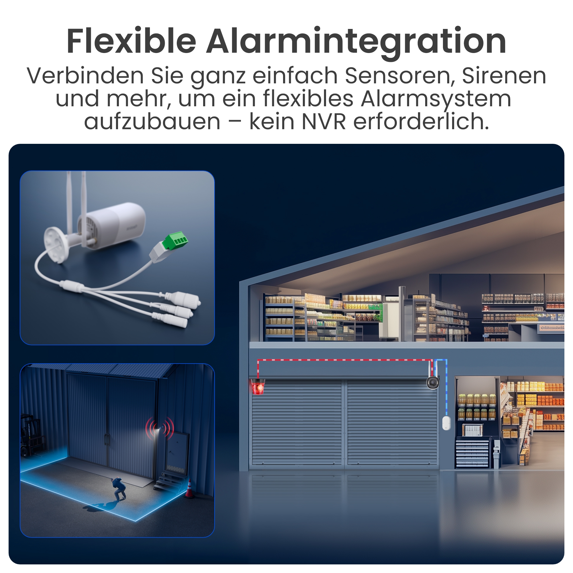 Die Kamera verfügt über einen Alarm-Eingang und -Ausgang, die eine nahtlose Integration mit externen Alarmgeräten ermöglichen. Dies erhöht die Sicherheit und Reaktionsfähigkeit bei potenziellen Bedrohungen.