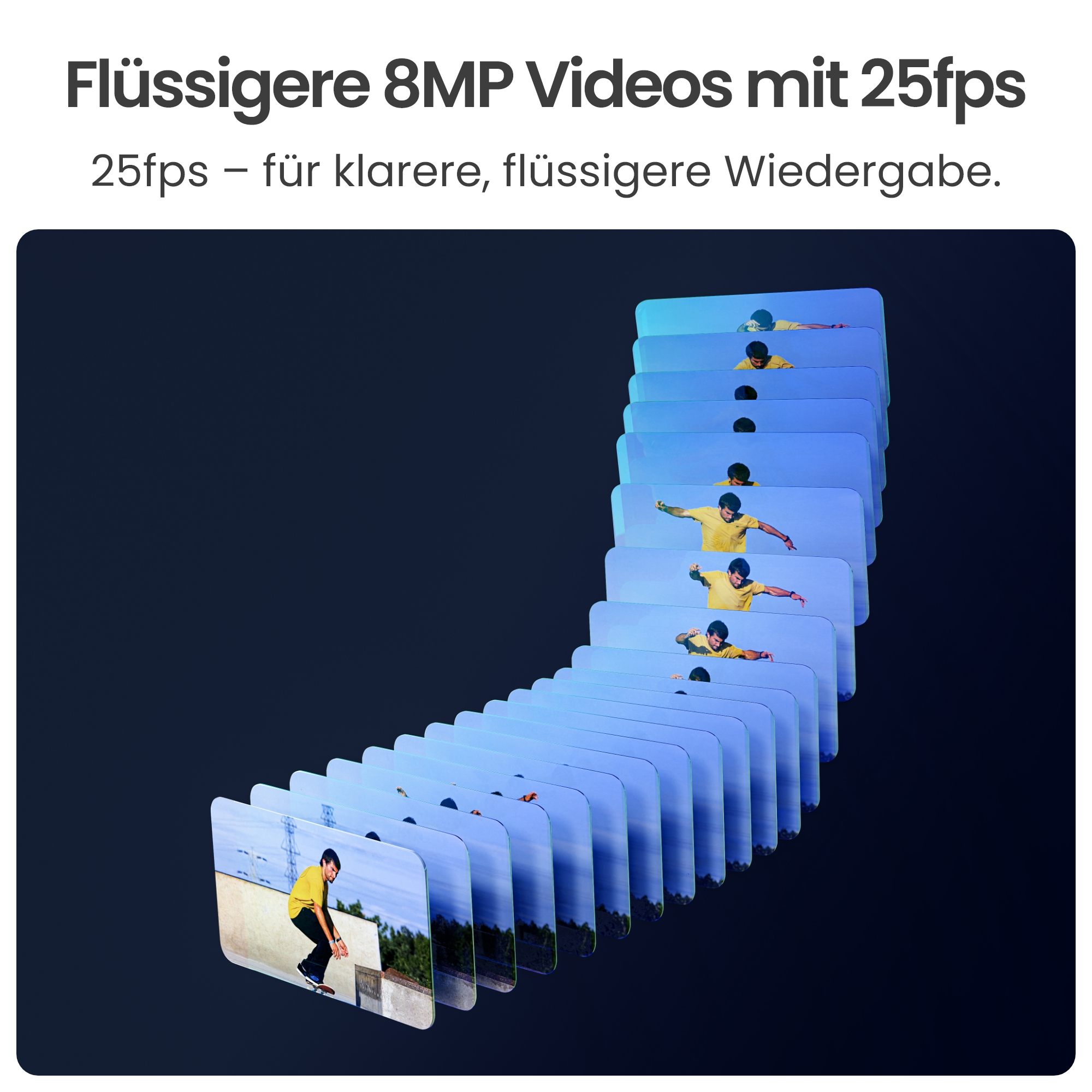 Hochauflösende Überwachung. Zuverlässige Sicherheit.Die RP-WCB8MZ 4K Wi-Fi 6 Kamera bietet eine beeindruckende 4K Auflösung bei 30fps, die gestochen scharfe Bilder liefert. Mit einem 5-fach optischen Zoom können Sie Details aus der Ferne erfassen, während der ultraweite diagonale Sichtwinkel von 133° eine umfassende Überwachung ermöglicht.
