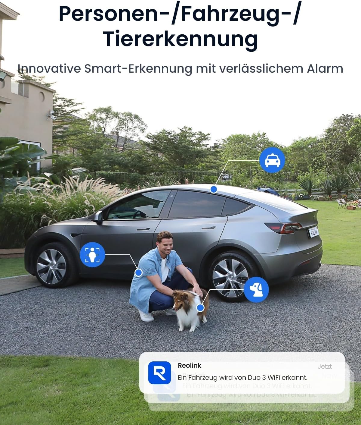 Smart weatherproof 16MP 4K WLAN dual camera with 180° ultra-wide angle, spotlights, person/car detection, colour night vision, 2.4/5 GHz dual-band WiFi 6 for optimum reception and motion track function