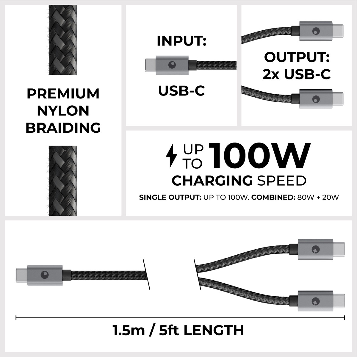 Il nostro cavo Cerbero 2-in-1 migliora l'esperienza USB-C-C standard con un ingresso e due uscite, in modo da poter caricare due dispositivi con un unico caricatore.Con una lunghezza totale di 1,5 metri, offre la giusta portata. Utilizzate un'uscita per ricaricare fino a 100W. Se si collegano due dispositivi, la potenza viene suddivisa in modo intelligente: fino a 80 W per uno e fino a 20 W per l'altro. Nessun trasferimento di dati, nessun extra. Solo materiali solidi, design pulito e prestazioni che parlano da sole.