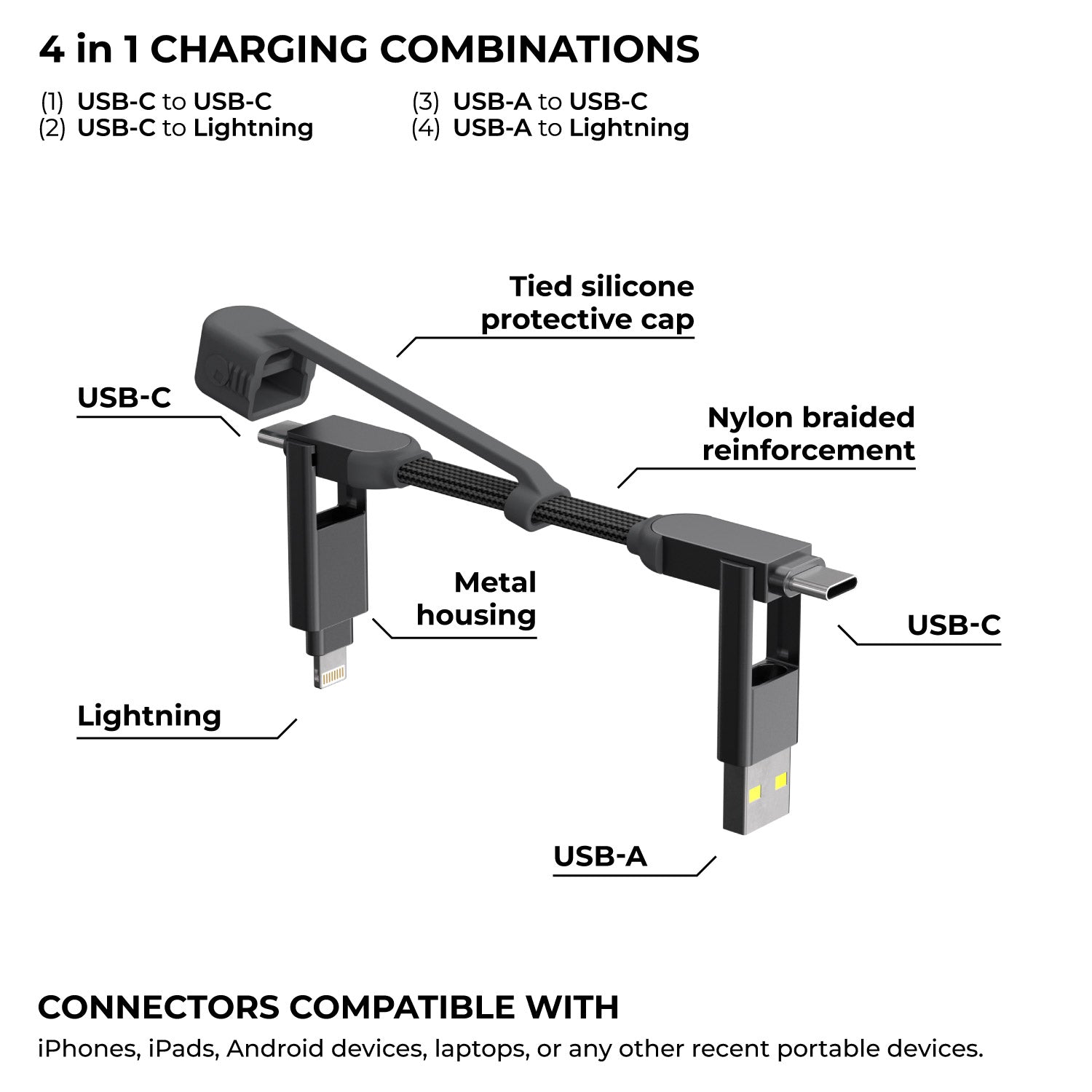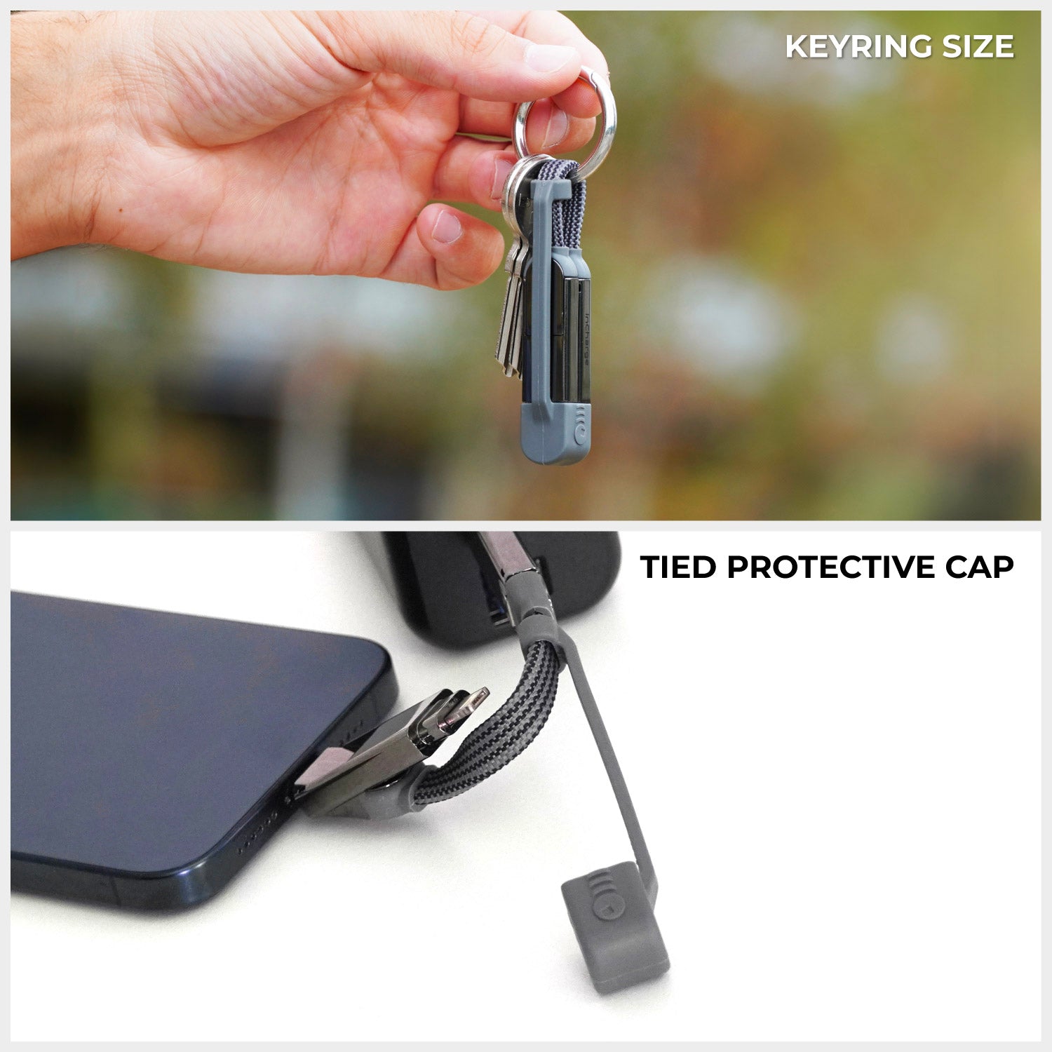 Die verbundene Kappe wurde eingeführt, um eine häufige Frustration zu lösen: den Verlust der Kappe. Mit dieser Funktion können Sie sicher sein, dass die Kappe immer am Kabel befestigt bleibt, was es noch praktischer und reisefreundlicher macht.