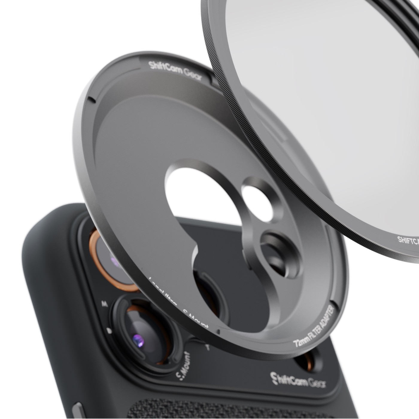 Ausschließlich für die 72-mm-Magnetfilter entwickelt. Funktioniert bei iPhone-Pro-Modellen in Verbindung mit S-Mount-Hüllen (sowie bei kompatiblen Android-Geräten mit speziellen Hüllen oder dem Universal S-Mount) zur Befestigung der Filter.So befestigen Sie Filter direkt am Smartphone: