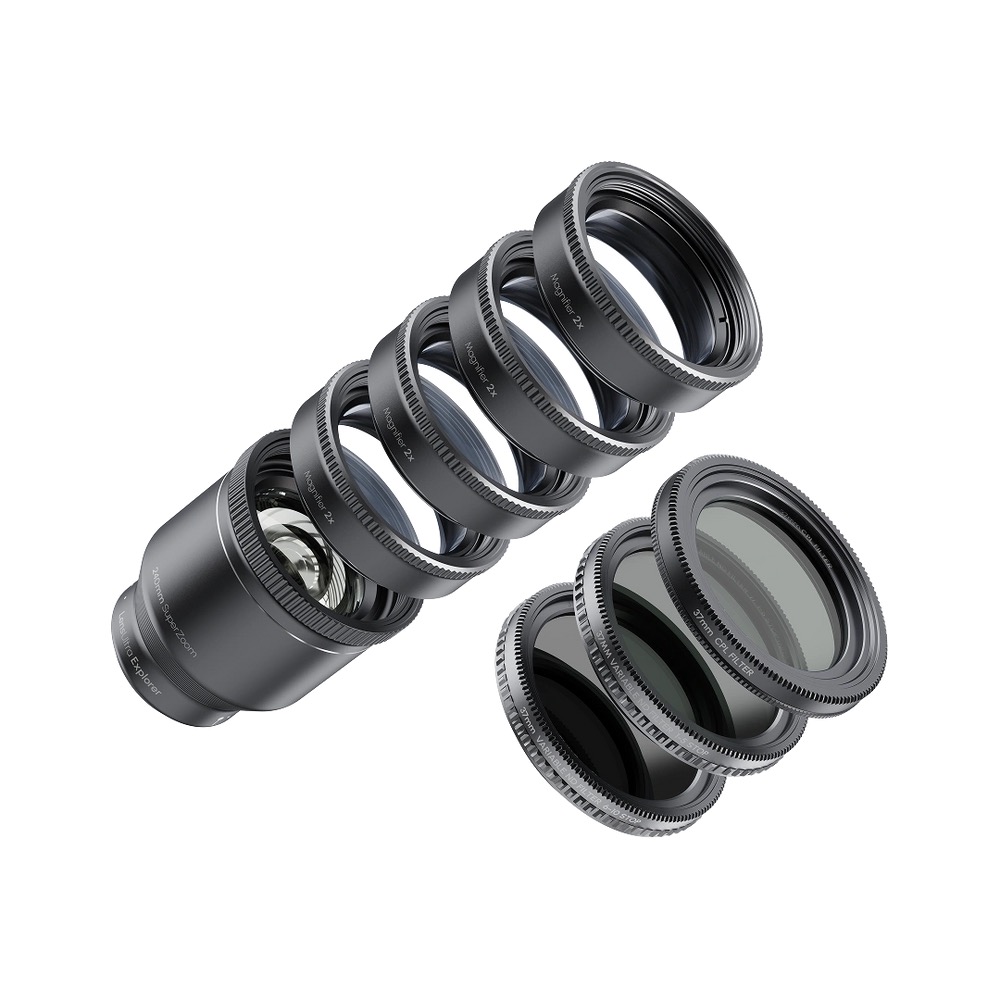 The kit includes optical filters such as a circular polariser (CPL) to reduce glare and improve contrast, as well as variable ND filters to control exposure in bright environments and create motion blur effects. With these tools, you can master difficult lighting conditions and achieve professional, cinematic results for both photo and video recordings.