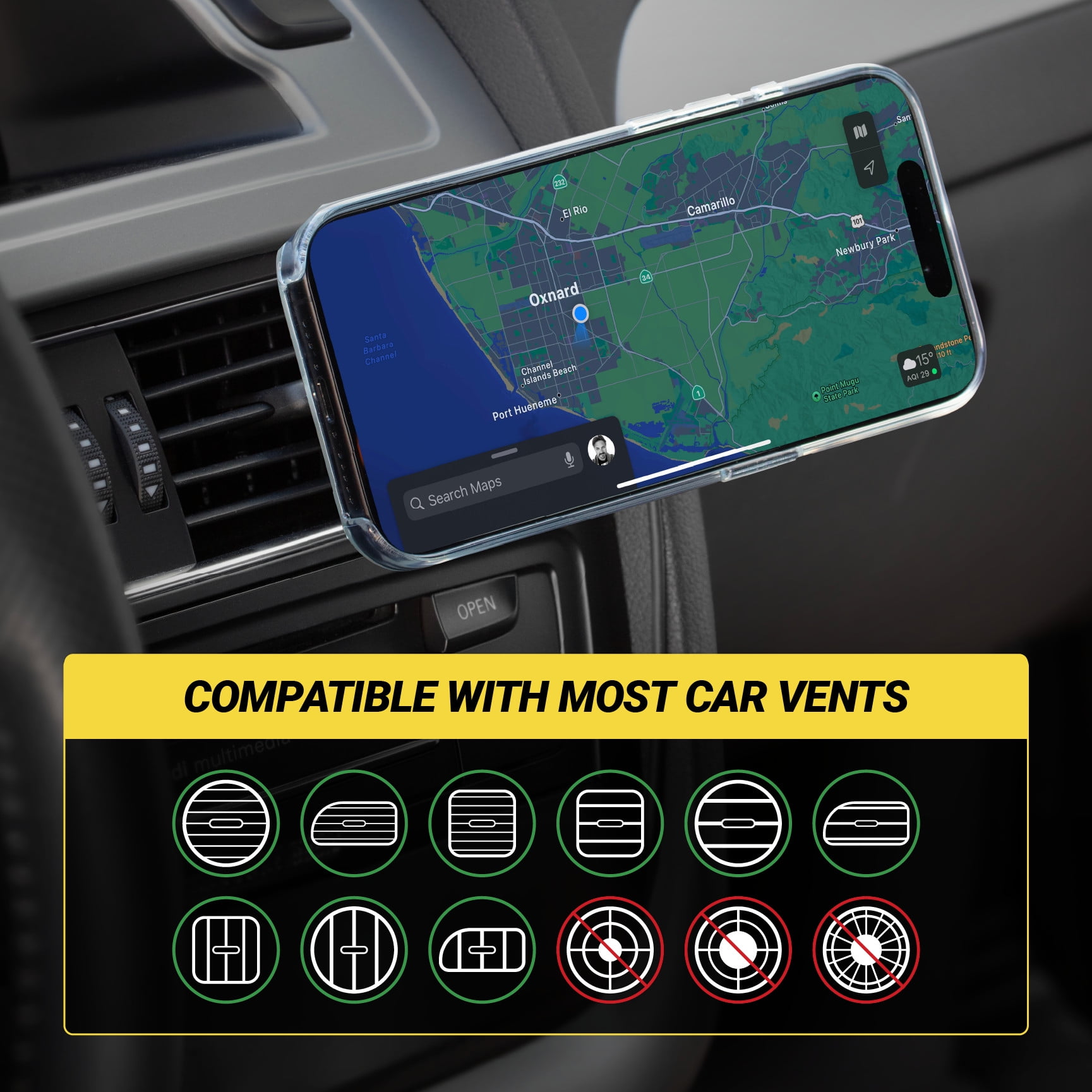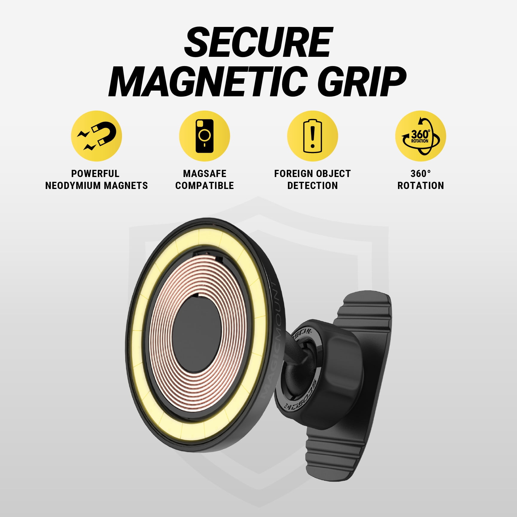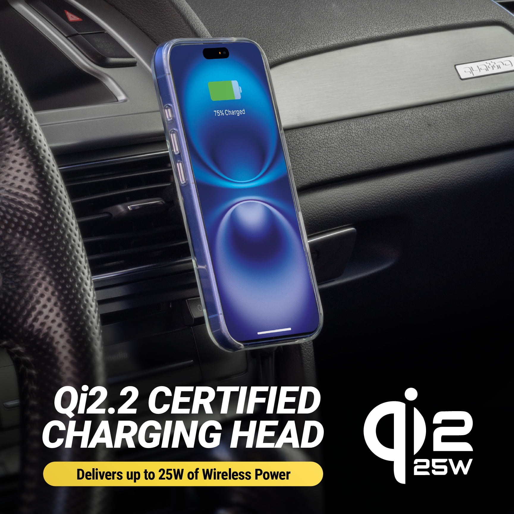 Laden Sie Ihr Smartphone unterwegs schneller als je zuvor – mit dem MagicMount™ Charge Pro. Dank des neuesten Qi2-Standards liefert die Halterung bis zu 25W kabellose Ladeleistung und ist damit bis zu 5× schneller als herkömmliche 5W-Ladegeräte. Einfach Ihr MagSafe- oder Qi2-kompatibles Smartphone magnetisch aufsetzen – die präzise Ausrichtung sorgt jedes Mal für sicheres und zuverlässiges Laden.Sie haben die Wahl zwischen zwei Befestigungsoptionen: Montieren Sie die Halterung mit dem mitgelieferten Automotive-Klebeband direkt auf dem Armaturenbrett oder nutzen Sie die Lüftungshalterung, die sich einfach an den meisten Fahrzeuglüftungen anbringen, entfernen und in ein anderes Fahrzeug umsetzen lässt. Der integrierte Kugelgelenk-Kopf ermöglicht eine stufenlose Anpassung des Blickwinkels für optimale Sicht während der Fahrt. Im Lieferumfang enthalten sind zudem ein USB-C-Netzteil sowie ein praktischer Kabelmanagement-Clip für ein aufgeräumtes Cockpit.