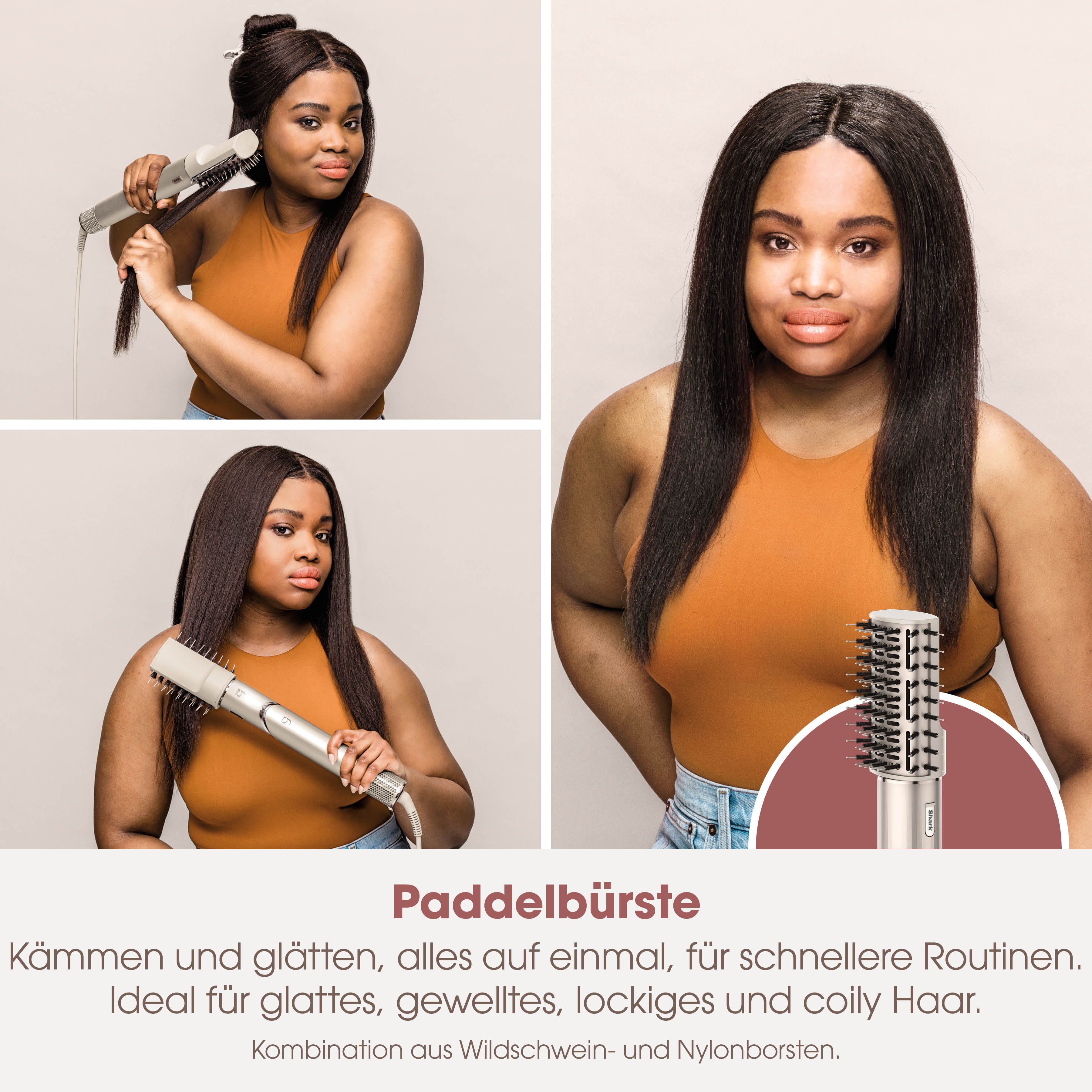 Durch leistungsstarken Luftstrom sorgt die Paddelbürste für glattes & geschmeidiges Haar für alle Shark Flexstyle's Serie HD400 - Stone