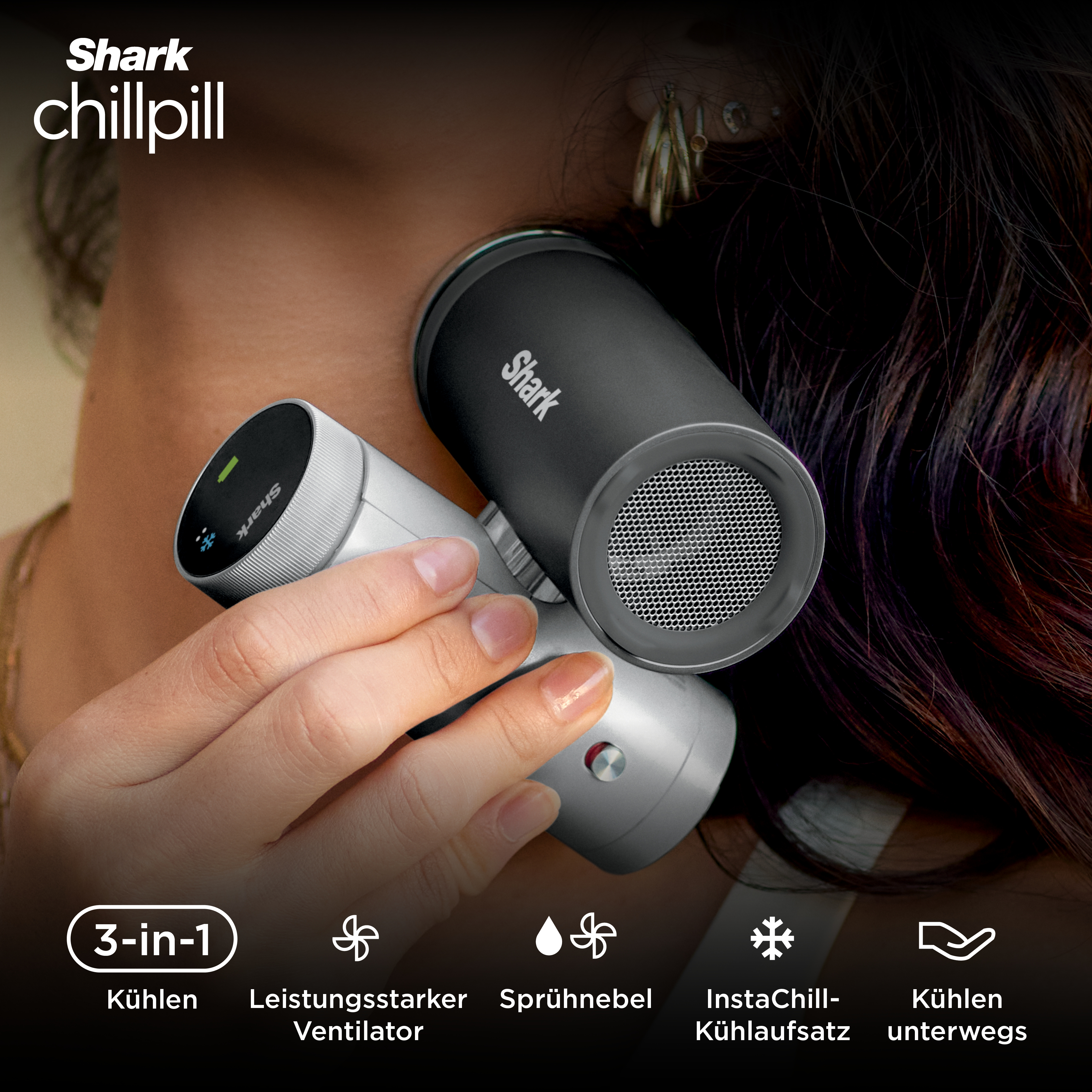 Lerne Shark ChillPill kennen, das persönliche 3-in-1-Kühlsystem mit Hochgeschwindigkeits-Ventilator, InstaChill-Kühlung und ultrafeinem Sprühnebel. Dank des vielseitigen, tragbaren Designs und vielfältigen Einsatzmöglichkeiten genießt du überall angenehme Abkühlung. Entdecke eine Auswahl an Trendfarben. Ergänze dein Setup mit ChillPill-Zubehör (separat erhältlich) wie Clips, Umhängeriemen und mehr für zusätzliche Flexibilität. Enthält: ChillPill-System, Ventilatorkappe, Sprühnebel-Pod, InstaChill-Kühlplatte, Ladekabel und 3 Ersatzdochte.