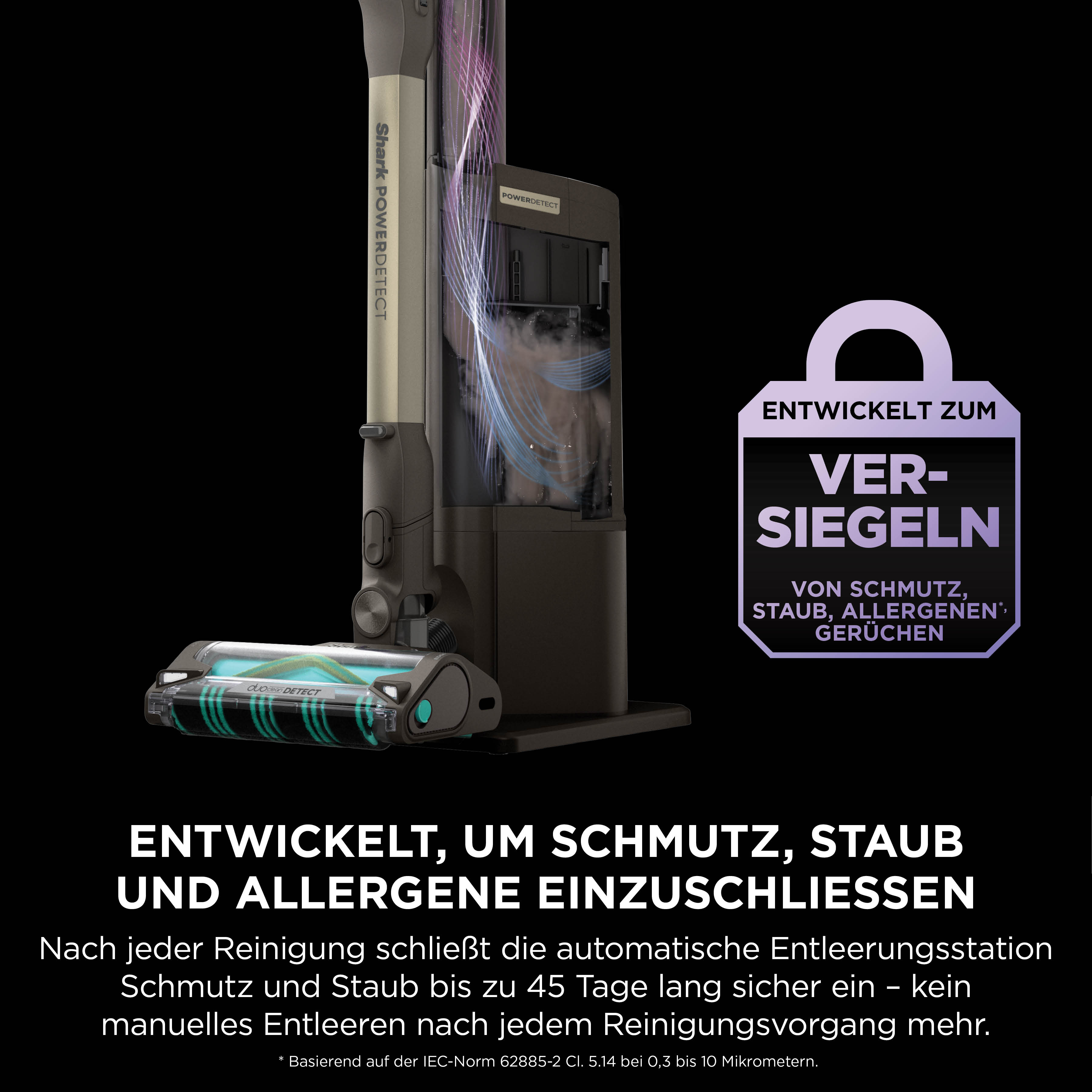 Schließt Staub und Schmutz ein: Die Basisstation schliesst nach jeder Reinigung feinen Staub, Schmutz, Allergene und Gerüche sicher ein. Die Anti-Allergen Komplettversiegelung schliesst 99,9 %5 des Staubs und der Allergene sicher in der Basisstation ein, die Anti-Odour-Technologie verhindert unangenehme Gerüche.